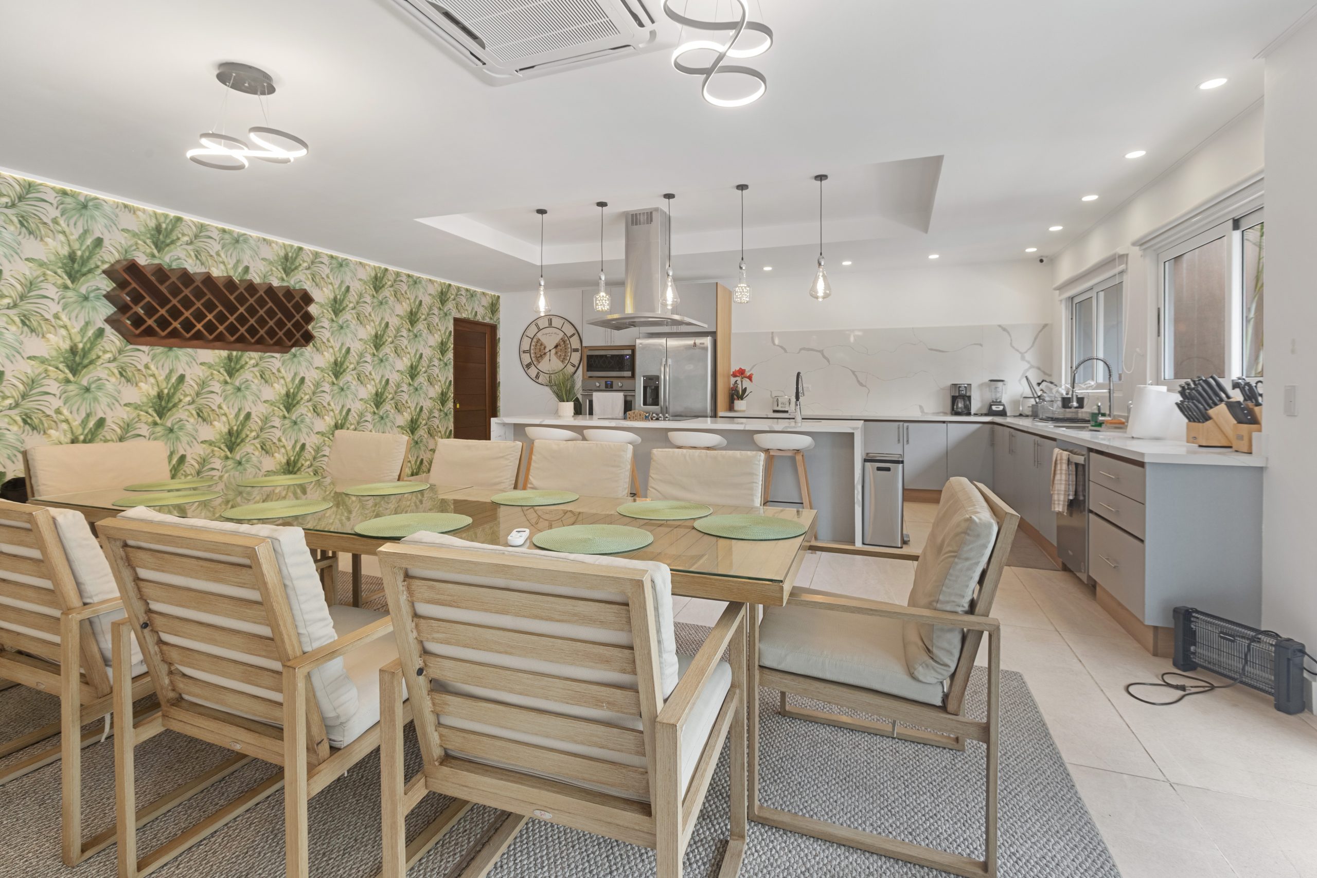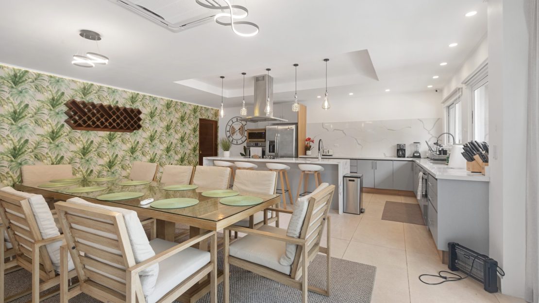Desde el primer momento, la planta baja te recibe con una amplia sala de estar que transmite una sensación inmediata de bienestar. Los acabados en madera aportan calidez y equilibrio a una decoración moderna en tonos neutros, logrando un ambiente elegante y acogedor. Este espacio se integra de forma fluida con el comedor y una cocina de gran tamaño, equipada con electrodomésticos de última generación, ideal para crear desde comidas cotidianas hasta cenas inolvidables. El televisor en la sala completa el ambiente, perfecto para noches de descanso o entretenimiento.