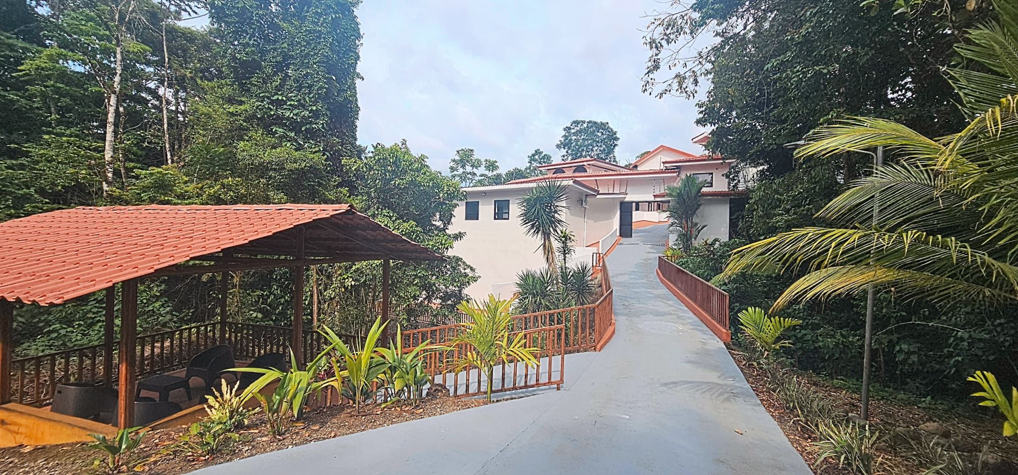 Un sendero pavimentado rodea toda la propiedad, ideal para caminatas tranquilas entre jardines paisajísticos, flora tropical y áreas de bosque natural.