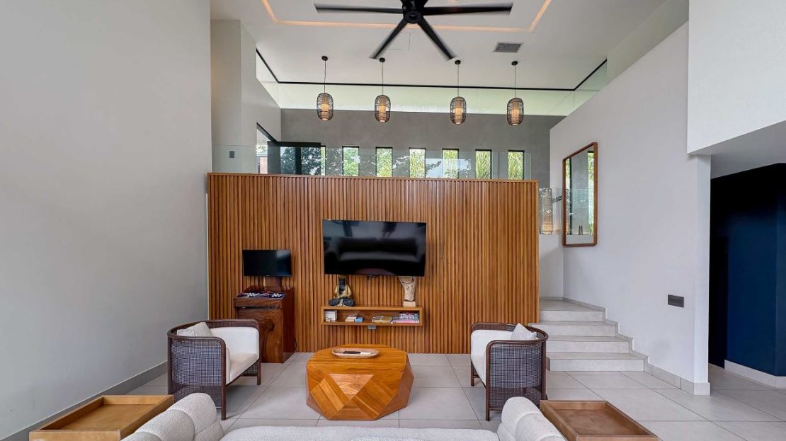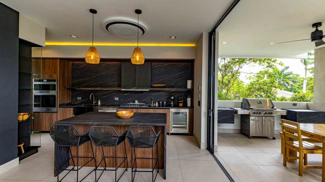 En el exterior, encontrarás una hermosa piscina privada de tono azul profundo, ideal para refrescarse y disfrutar del clima tropical. Los jardines tropicales cuidadosamente diseñados crean un ambiente de paz total. Además, el área de BBQ techada es perfecta para reuniones al aire libre o cenas tranquilas rodeadas de naturaleza.