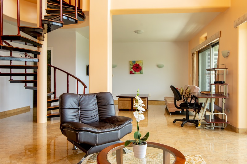 The light and spacious design of this condo begins with the large open plan kitchen fully fitted with high spec appliances and an island breakfast bar, and which opens out onto a ceramic floored furnished living area. You access the loft and a private ensuite bedroom by spiral staircase. From the loft you can enter the back balcony and from the ensuite bedroom the huge private balcony.