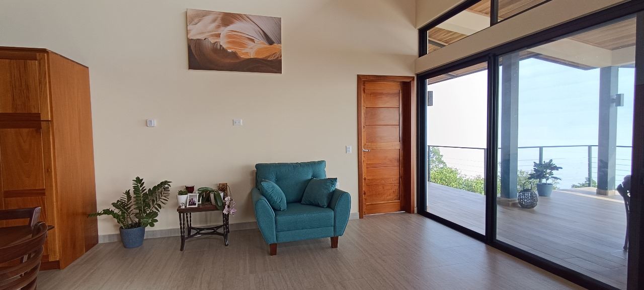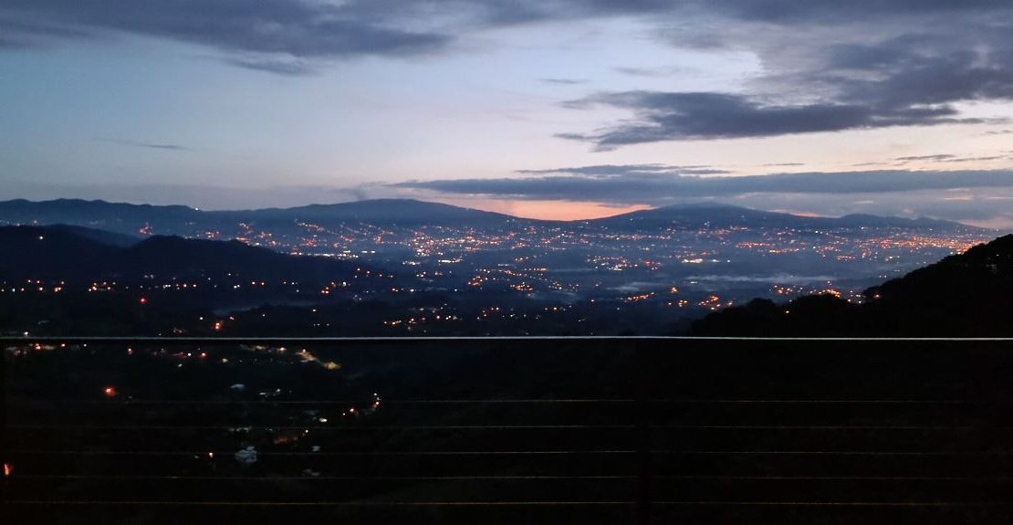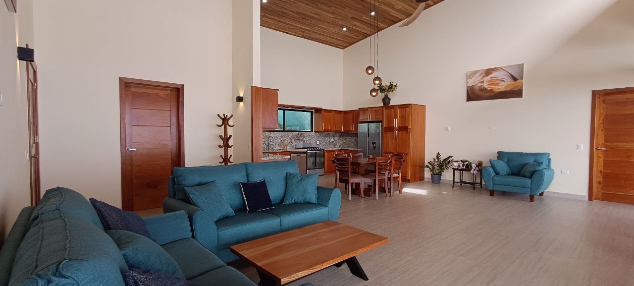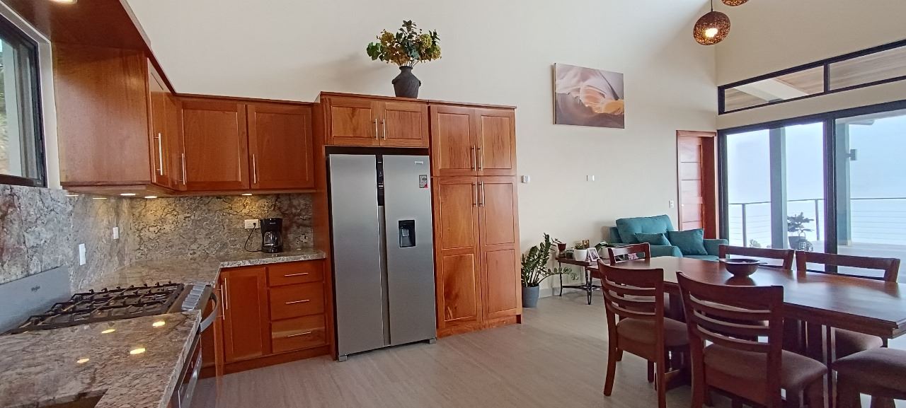 Majestic new home on top of an Atenas private community overlooking The Central Valley with amazing panoramic views of the area montains in the cooler climates of Barrio Jesus, located just 9 minutes from town center. The setting is a very private and secure location adjacent the Atenas coffee farms with a long private entrance leading to the plentiful covered parking area. The landscaped yard is large enough to have a private orchard and the back yard is spacious enough to allow for a swimming pool area. When one walks into the open floor plan design the elaborate cathederal ceilings provides a feeling of spaciousness and light throughout the social area. There is artesenal cabinerty in the spacious kitchen and nicely designed wooden doors throughout the home. The kitchen, dining and living room lead way to an inviting large covered deck with an eagle’s eye view of the stellar scenery.