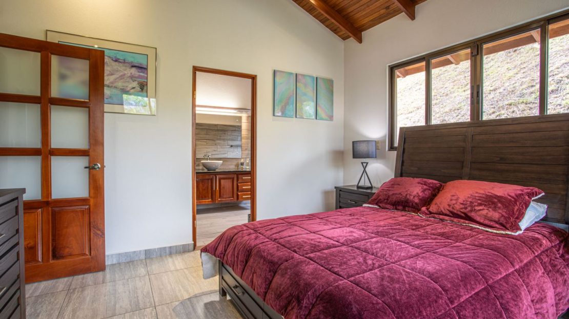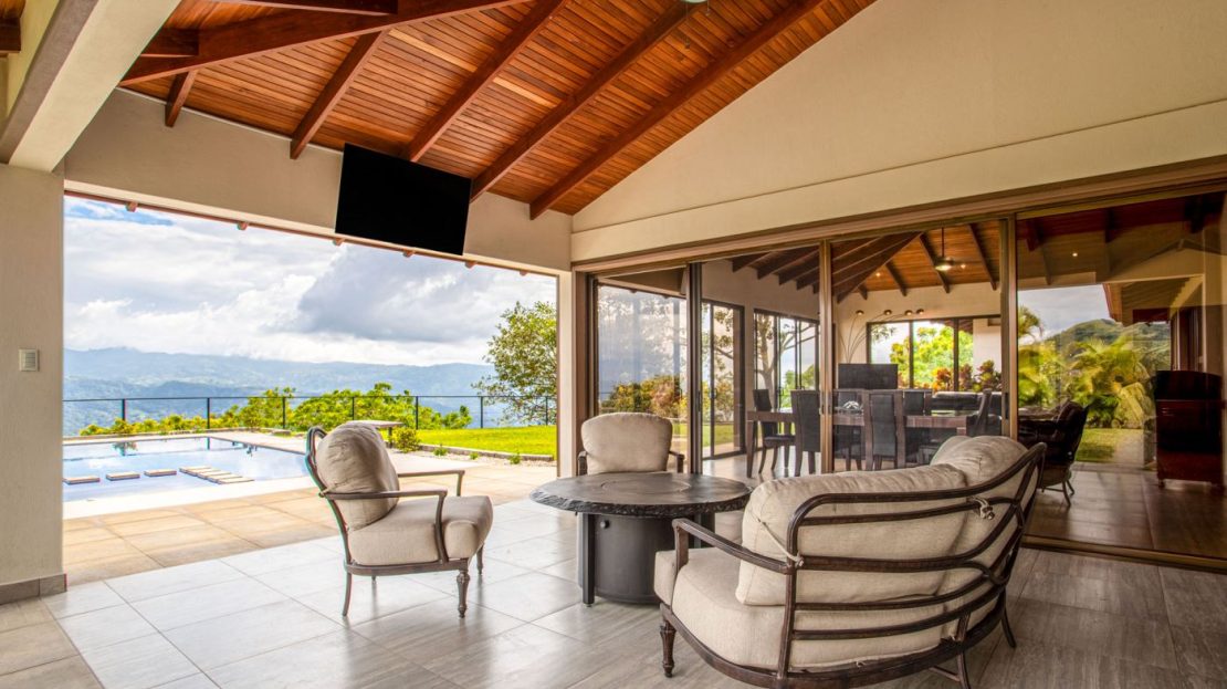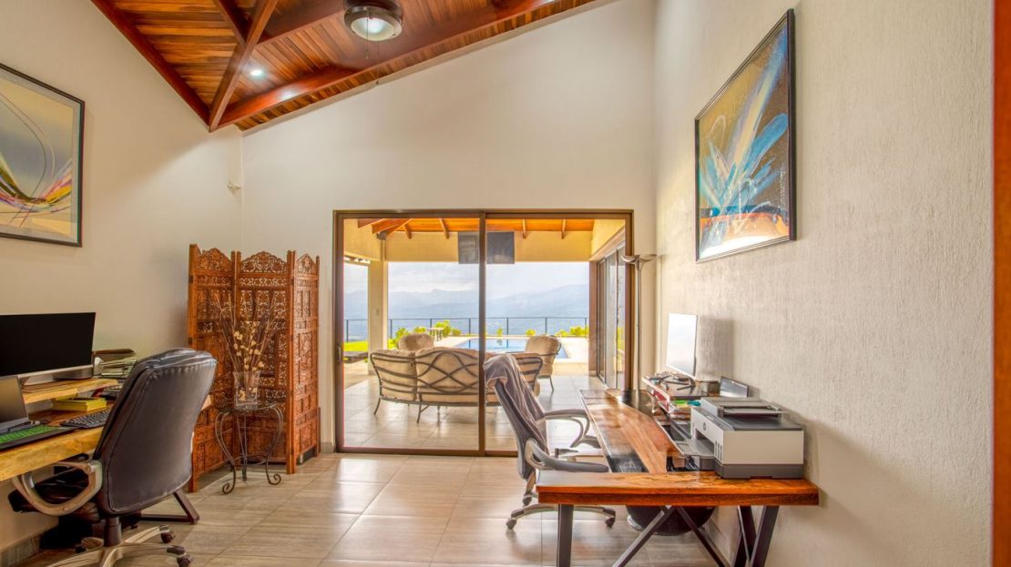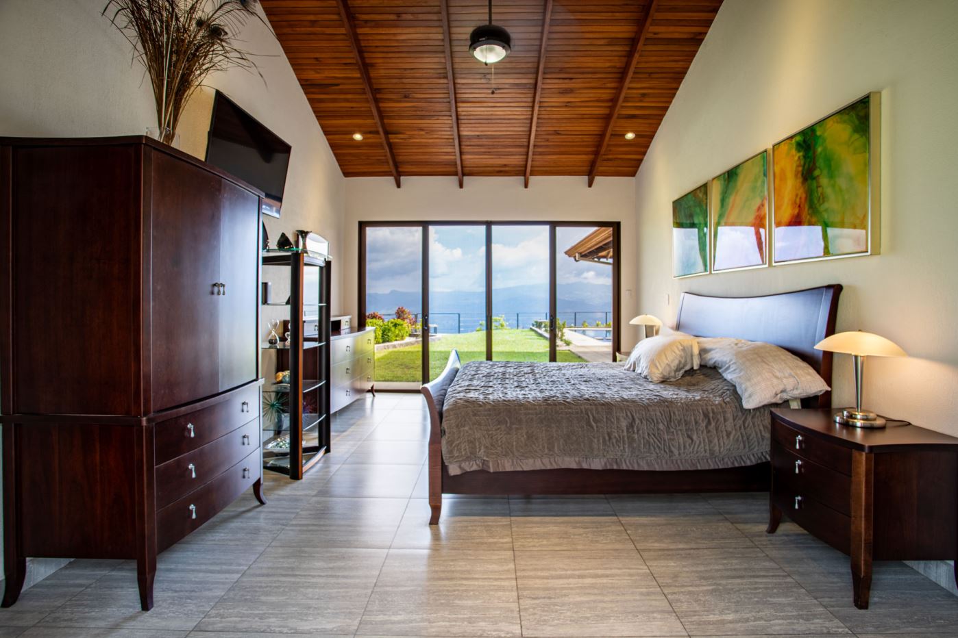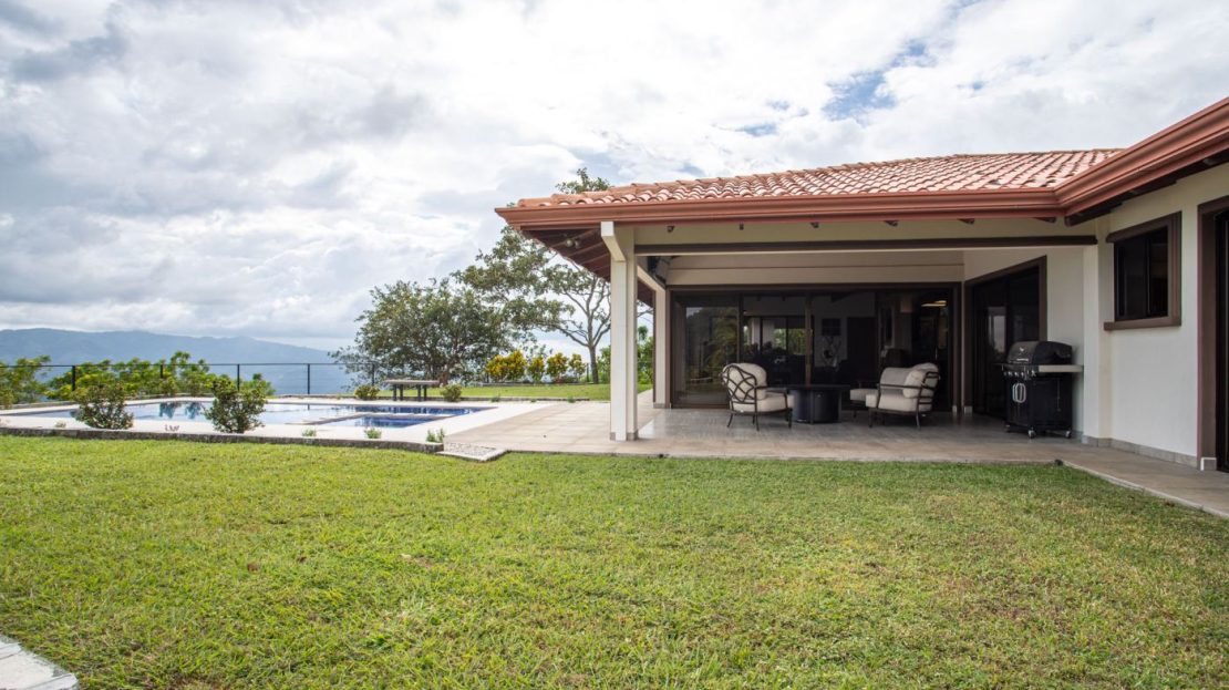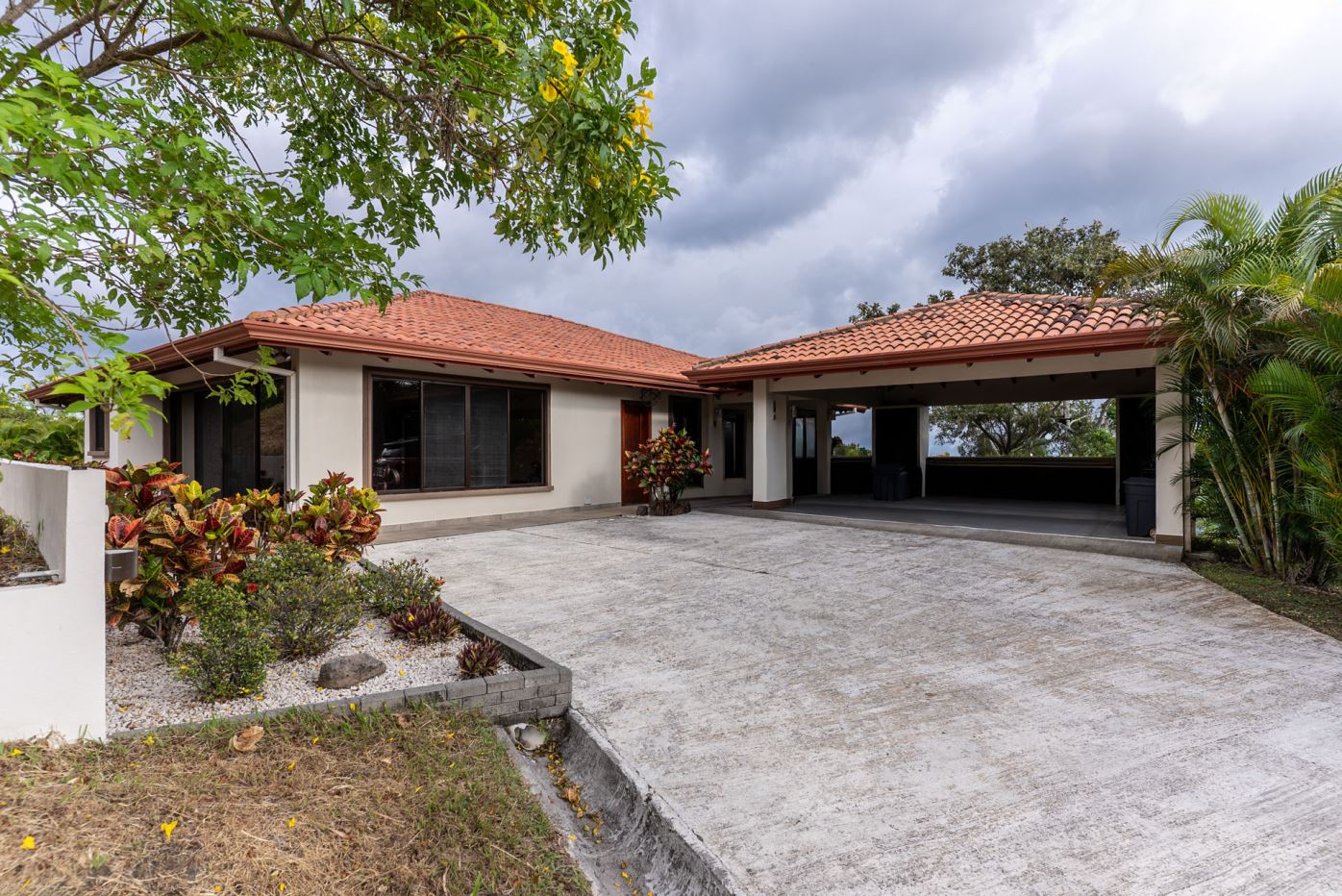 Mediterranean-style home with eclectic modern finishes in Hacienda Atenas with one of the best views on this side of town. This very well kept home sits just 8 minutes from town center and features amazing views of the Atenas countryside with the home facing south towards Puriscal and has almost a 300 degree view that includes some views of the Pacific Ocean and a good portion of the capital San Jose. The long private driveway leads two a 2-car carport with plenty of storage and electrical infrastructure for a home workshop. The formal entry leads to a large living-dining room area that nicely displays the woodwork to be found throughout the home including the inside and outside wood slatted ceiling, the woodwork thoughout the ample kitchen and bathrooms and the bedroom furniture. The kitchen has great lighting throughout ideal for a chef with an ultramodern centerpiece over the large kitchen island.
