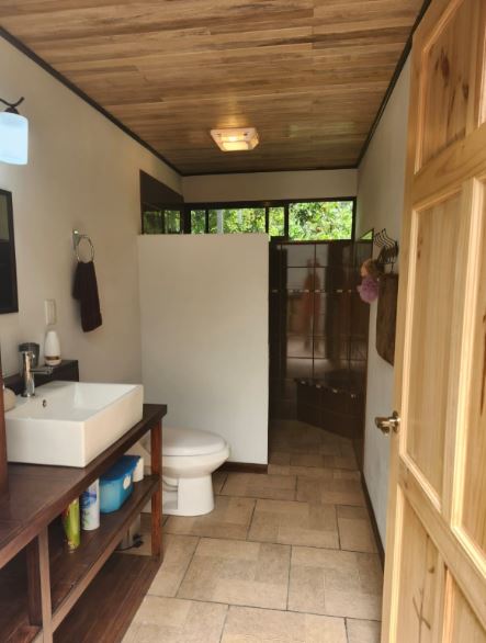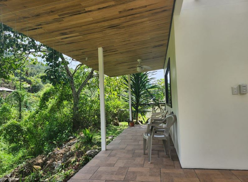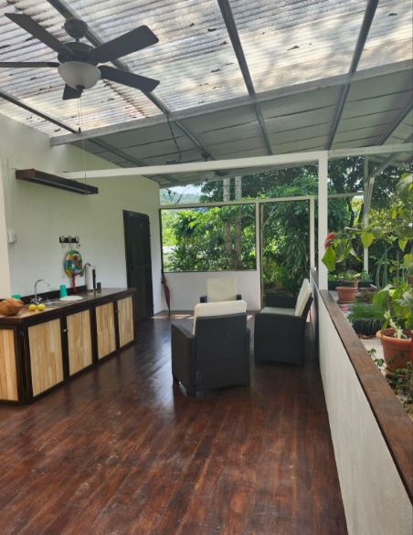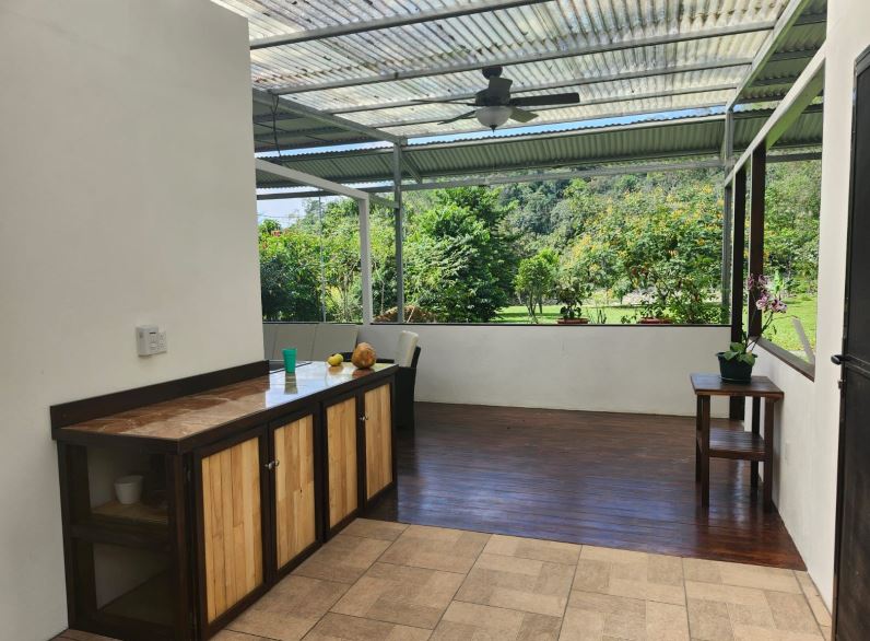 The property includes a spacious and stylish bathroom with a walk-in shower, a large covered outdoor area with carport, and gentle, usable land that’s perfect for gardening or future expansion. A small creek runs through the property, and a stunning river runs adjacent to the property border—offering soothing sounds of water and natural swimming spots just steps away. With easy access from the public road and only 20 minutes to San Isidro del General, you’ll enjoy all the conveniences of town while living immersed in nature.