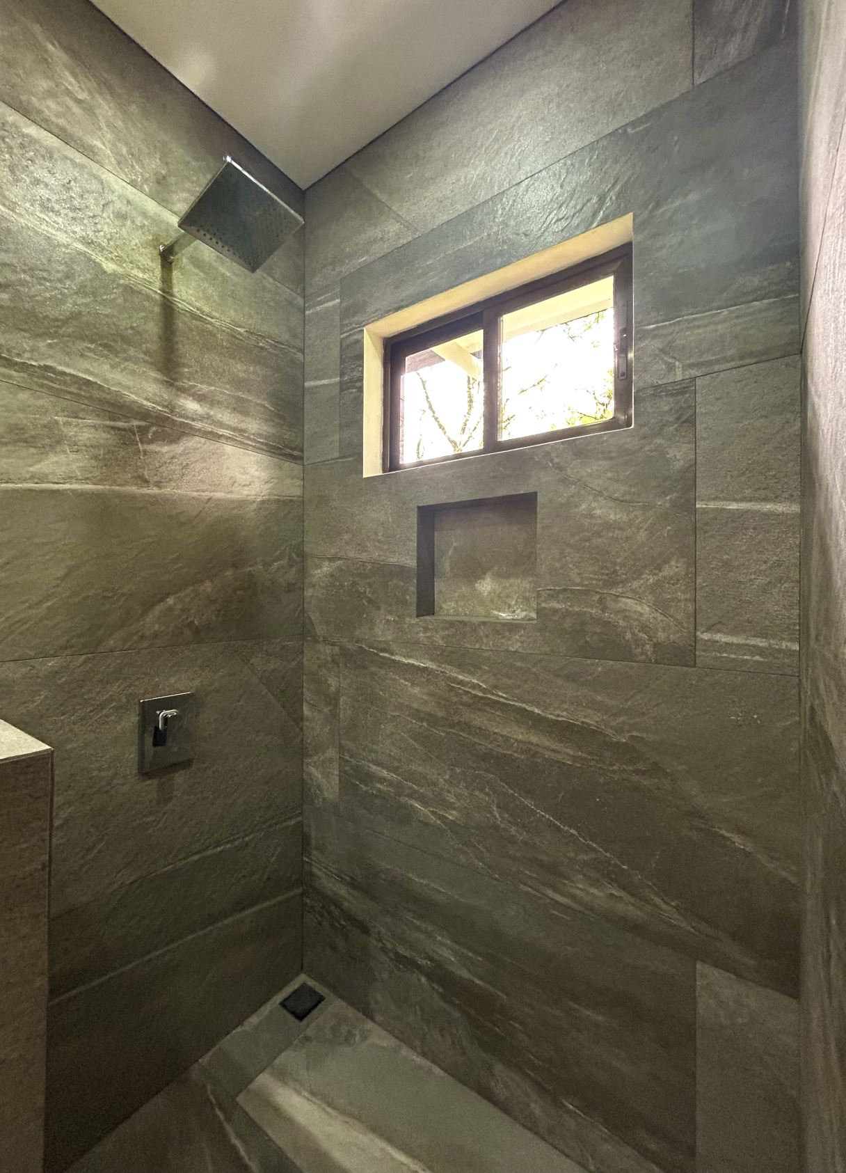The two oversized bedrooms feature custom-built closets with outlets for dehumidifiers. The principal bedroom includes a smart AC unit controllable via smartphone or remote, a private ensuite with a large walk-in shower, granite vanity, recessed shower shelving, a barn door entry, and a custom makeup station. The second bedroom offers a built-closet with ample shelving, a desk, and room for a queen-size bed, with a full guest bath nearby that mirrors the home’s elegant finishes.