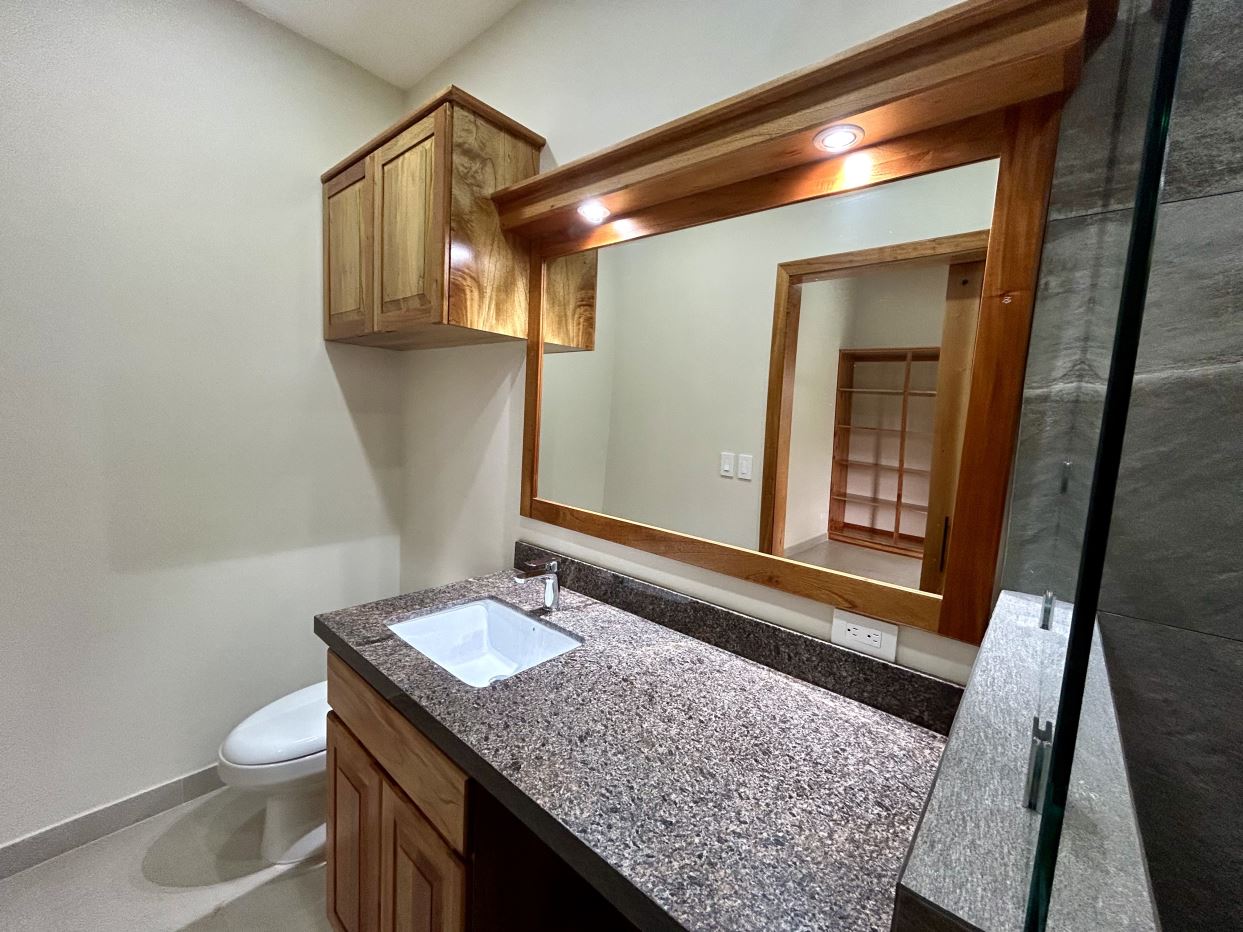 Los dos amplios dormitorios cuentan con armarios hechos a medida con tomas para deshumidificadores. El dormitorio principal incluye un aire acondicionado inteligente controlable por teléfono inteligente o control remoto, un baño privado con una amplia ducha a ras de suelo, tocador de granito, estantes de ducha empotrados, una entrada con puerta estilo granero y un tocador a medida. El segundo dormitorio ofrece un armario empotrado con amplias estanterías, un escritorio y espacio para una cama queen-size. Junto a él, hay un baño completo para invitados que refleja los elegantes acabados de la casa.