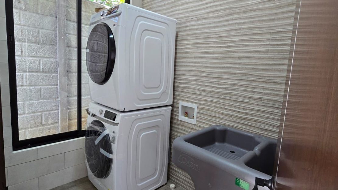 The home is furnished with 2 queen beds, stackable washer-dryer, 2 tv´s, fridge, integrated stove, living room furniture, bar stools and custom blinds.