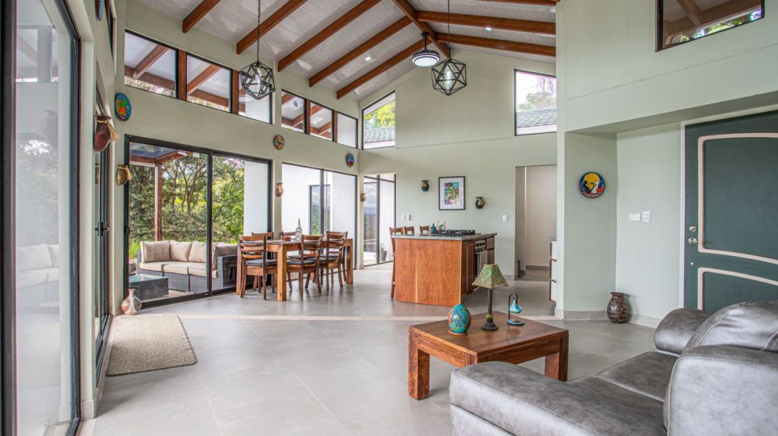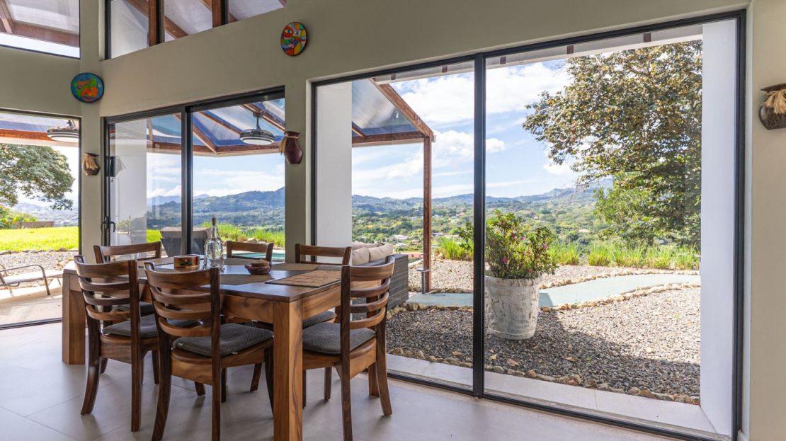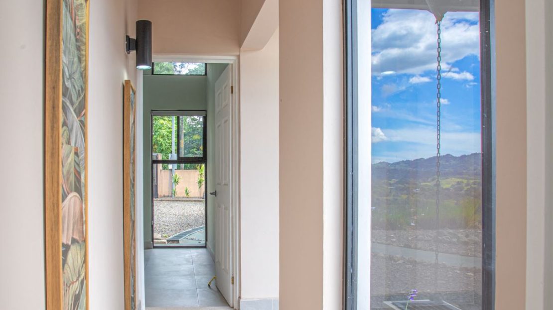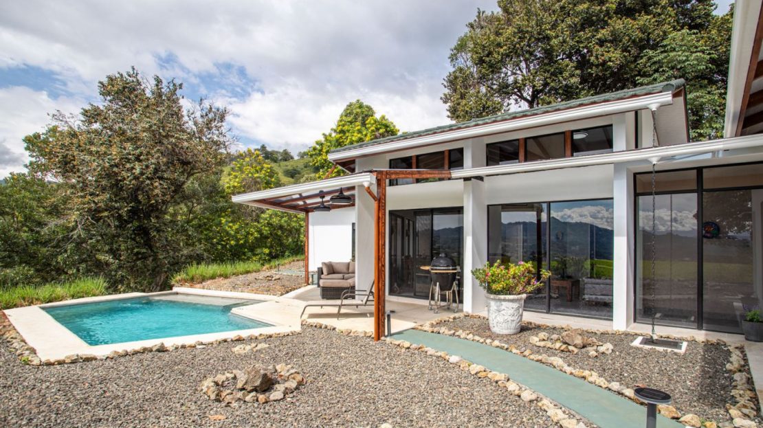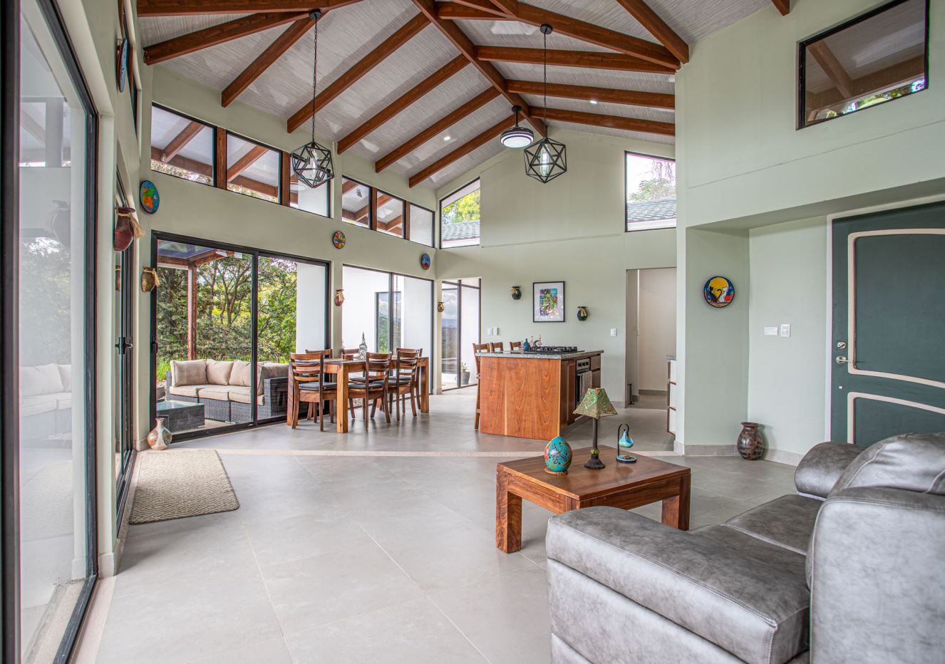 Modern designs can be found in this gated community in a natural setting in the Atenas countryside. This home is located in the private community of Cerro Luna in Barrio San Jose, about 12 minutes from town center. The property features 300 degree views towards the capital of San Jose, the area mountains and a good part of the small town of Atenas. The home’s layout features a common social open floor plan living and dinig room adjacent to a modern kitchen with artesenal woodwork throughout. This area leads to the inviting covered porch area and swimming pool. The master bedroom with ensuite bathroom can be found on one end of the home and two guest bedrooms on the opposite end with guest bathroom. The property is surrounded by nicely landscapped gardens and one also can find an independent guest studio on the opposite end of the lot with a kithen-dining area and full bathroom.