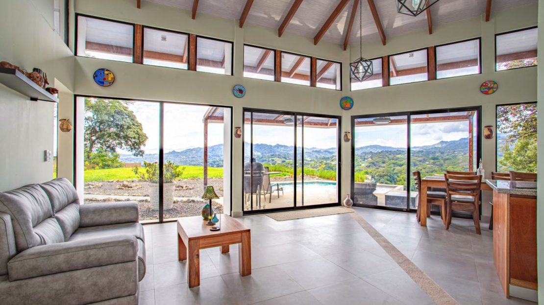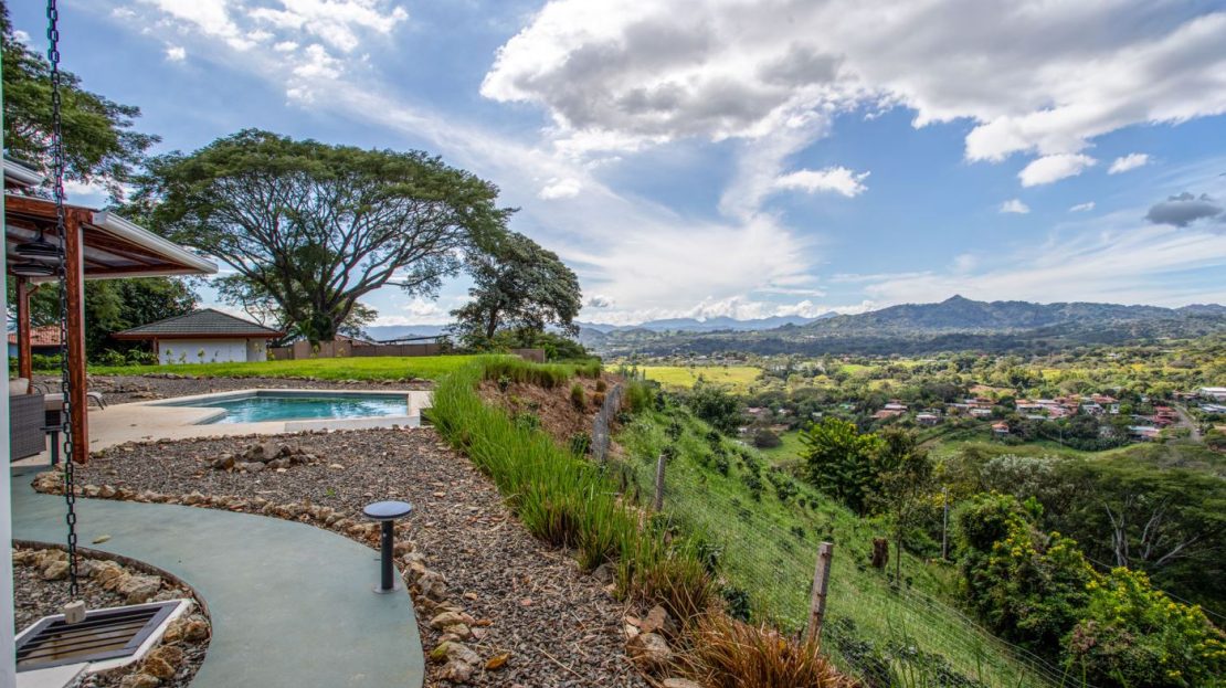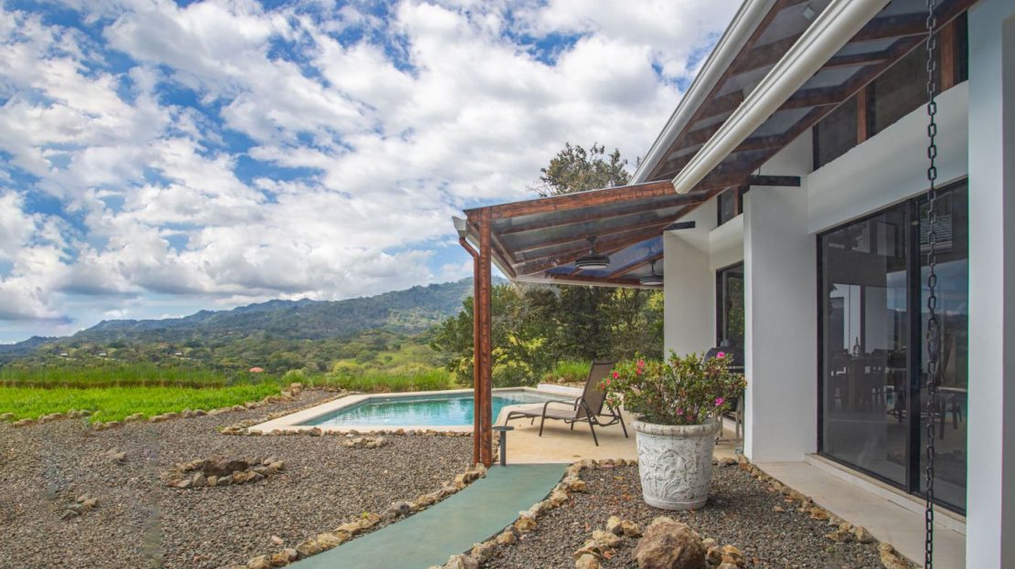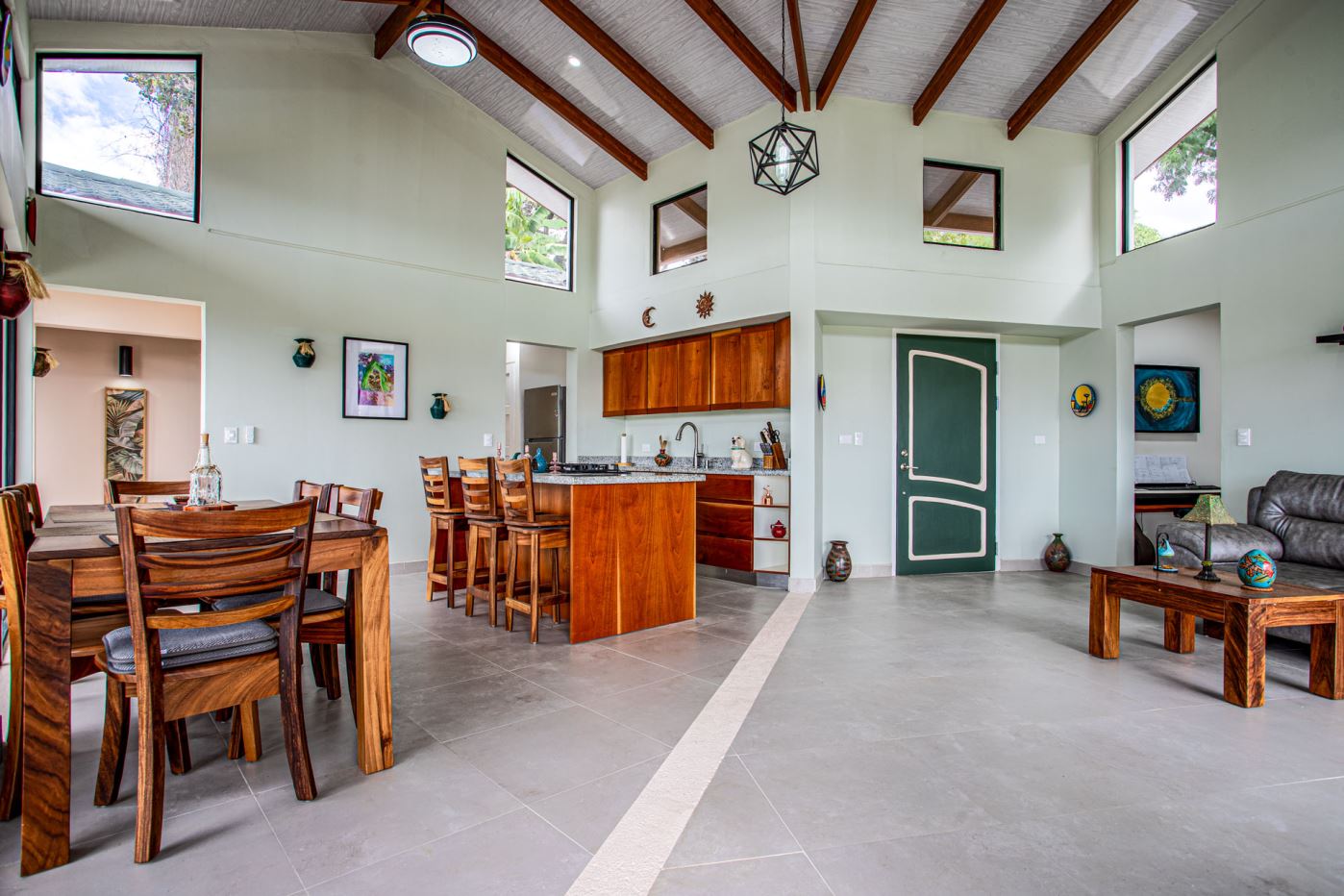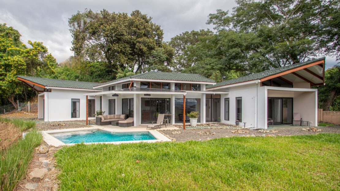 Modern designs can be found in this gated community in a natural setting in the Atenas countryside. This home is located in the private community of Cerro Luna in Barrio San Jose, about 12 minutes from town center. The property features 300 degree views towards the capital of San Jose, the area mountains and a good part of the small town of Atenas. The home’s layout features a common social open floor plan living and dinig room adjacent to a modern kitchen with artesenal woodwork throughout. This area leads to the inviting covered porch area and swimming pool. The master bedroom with ensuite bathroom can be found on one end of the home and two guest bedrooms on the opposite end with guest bathroom. The property is surrounded by nicely landscapped gardens and one also can find an independent guest studio on the opposite end of the lot with a kithen-dining area and full bathroom.