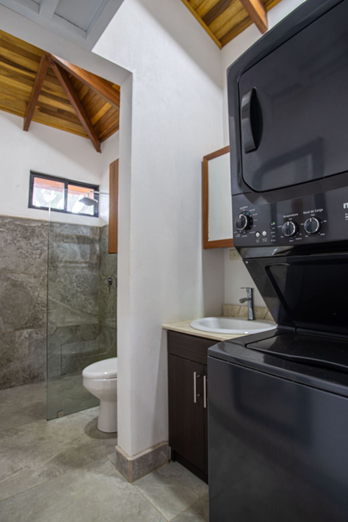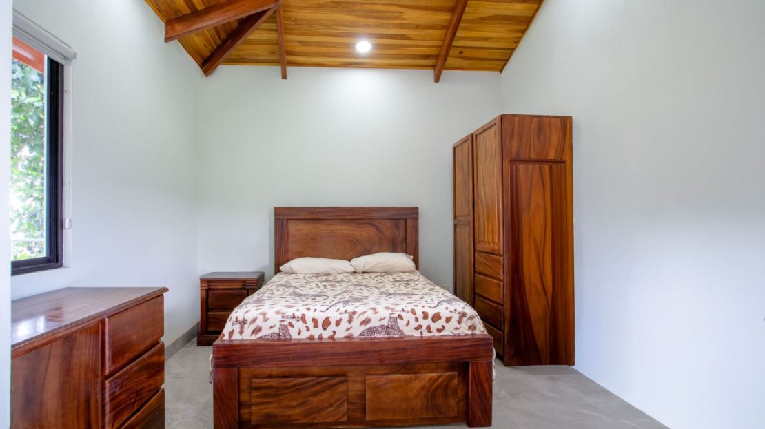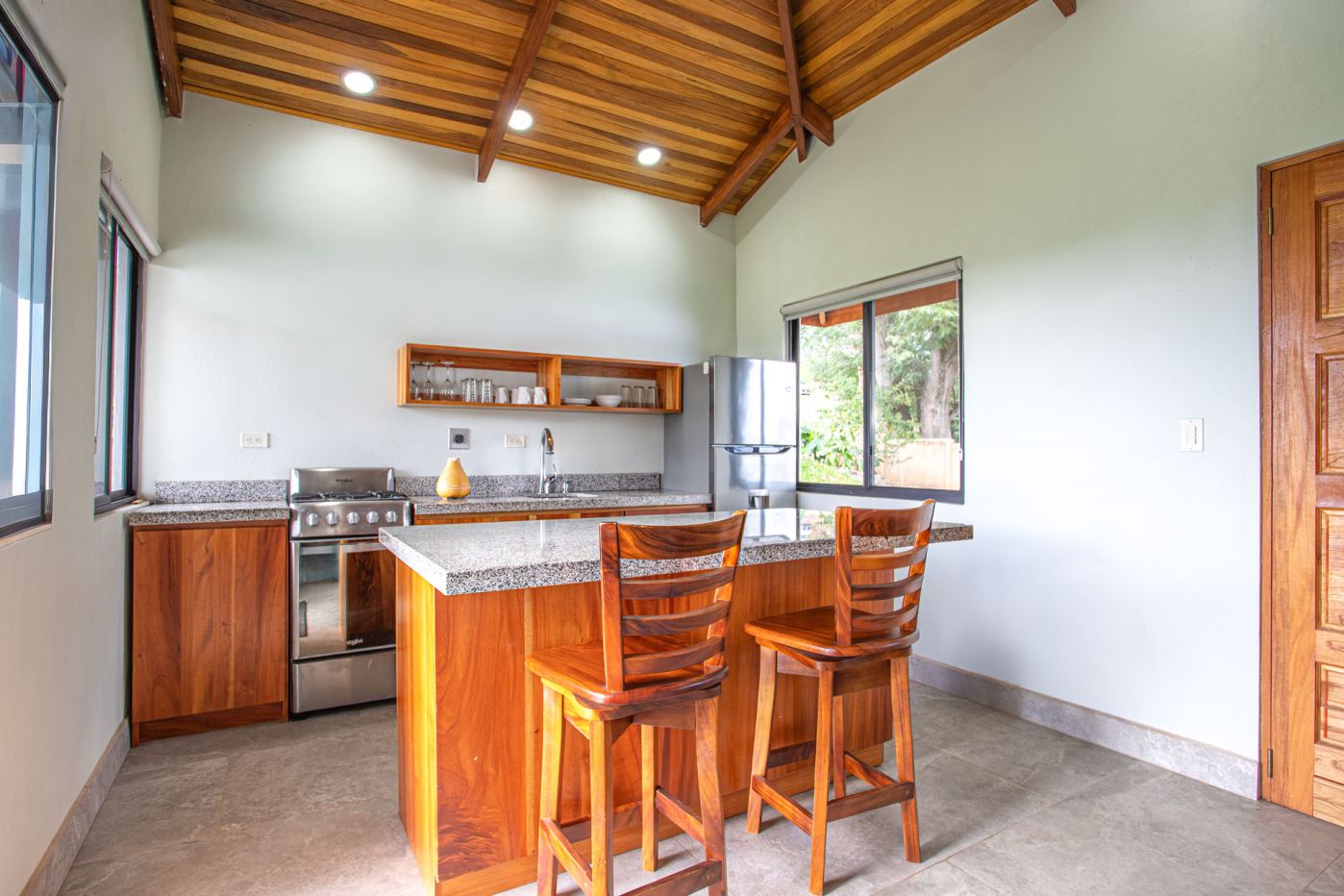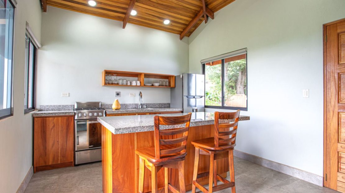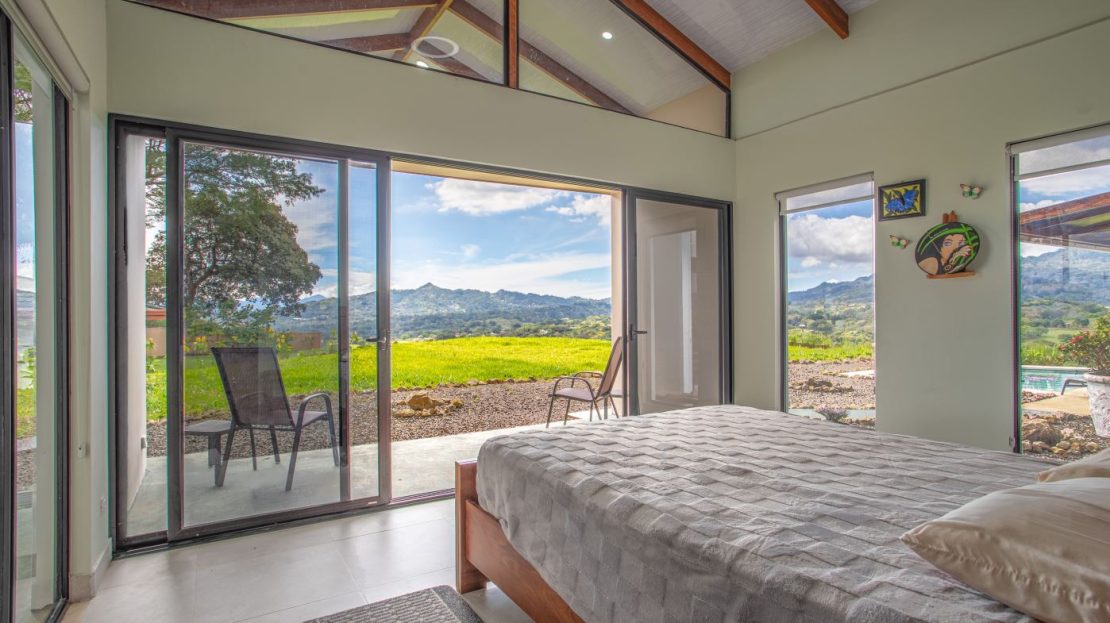 Modern designs can be found in this gated community in a natural setting in the Atenas countryside. This home is located in the private community of Cerro Luna in Barrio San Jose, about 12 minutes from town center. The property features 300 degree views towards the capital of San Jose, the area mountains and a good part of the small town of Atenas. The home’s layout features a common social open floor plan living and dinig room adjacent to a modern kitchen with artesenal woodwork throughout. This area leads to the inviting covered porch area and swimming pool. The master bedroom with ensuite bathroom can be found on one end of the home and two guest bedrooms on the opposite end with guest bathroom. The property is surrounded by nicely landscapped gardens and one also can find an independent guest studio on the opposite end of the lot with a kithen-dining area and full bathroom.