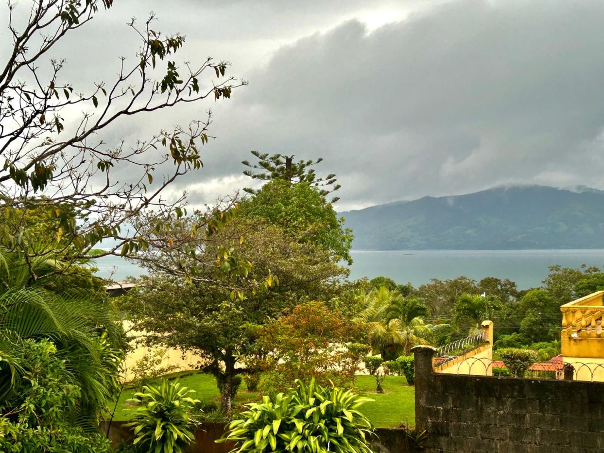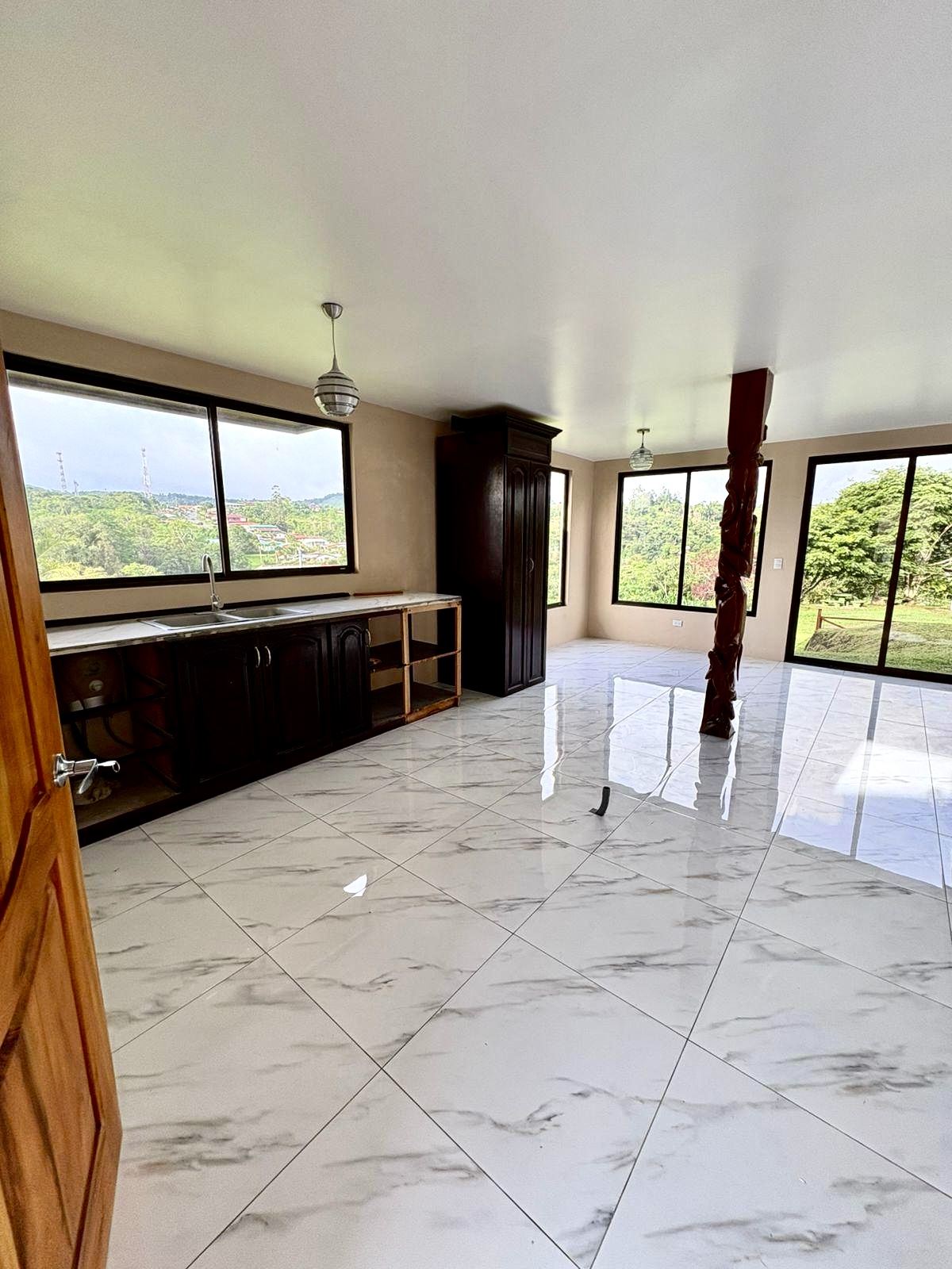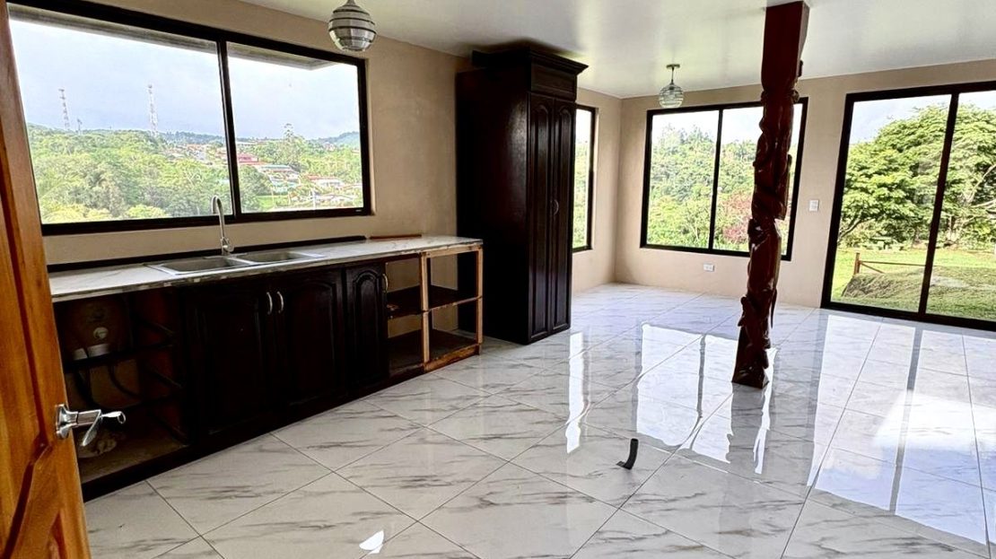 The spacious kitchen offers expansive picture windows with views overlooking downtown Nuevo Arenal, creating an inspiring setting for cooking and gathering. The open-concept design connects the kitchen to a dining area and living room, with patio doors that lead directly out to the garden.