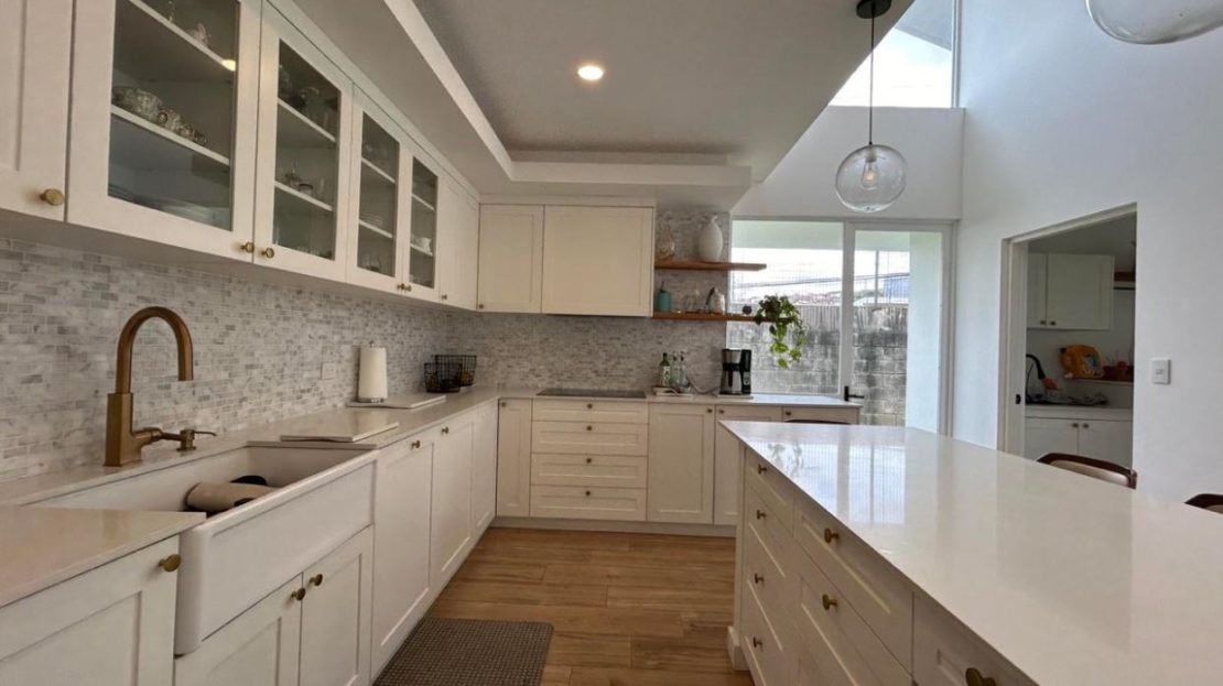 Cocina gourmet con sobres de cuarzo, salpicaderos de mármol y amplios ventanales que llenan los espacios de luz natural.