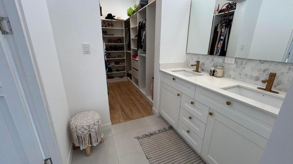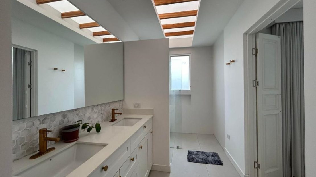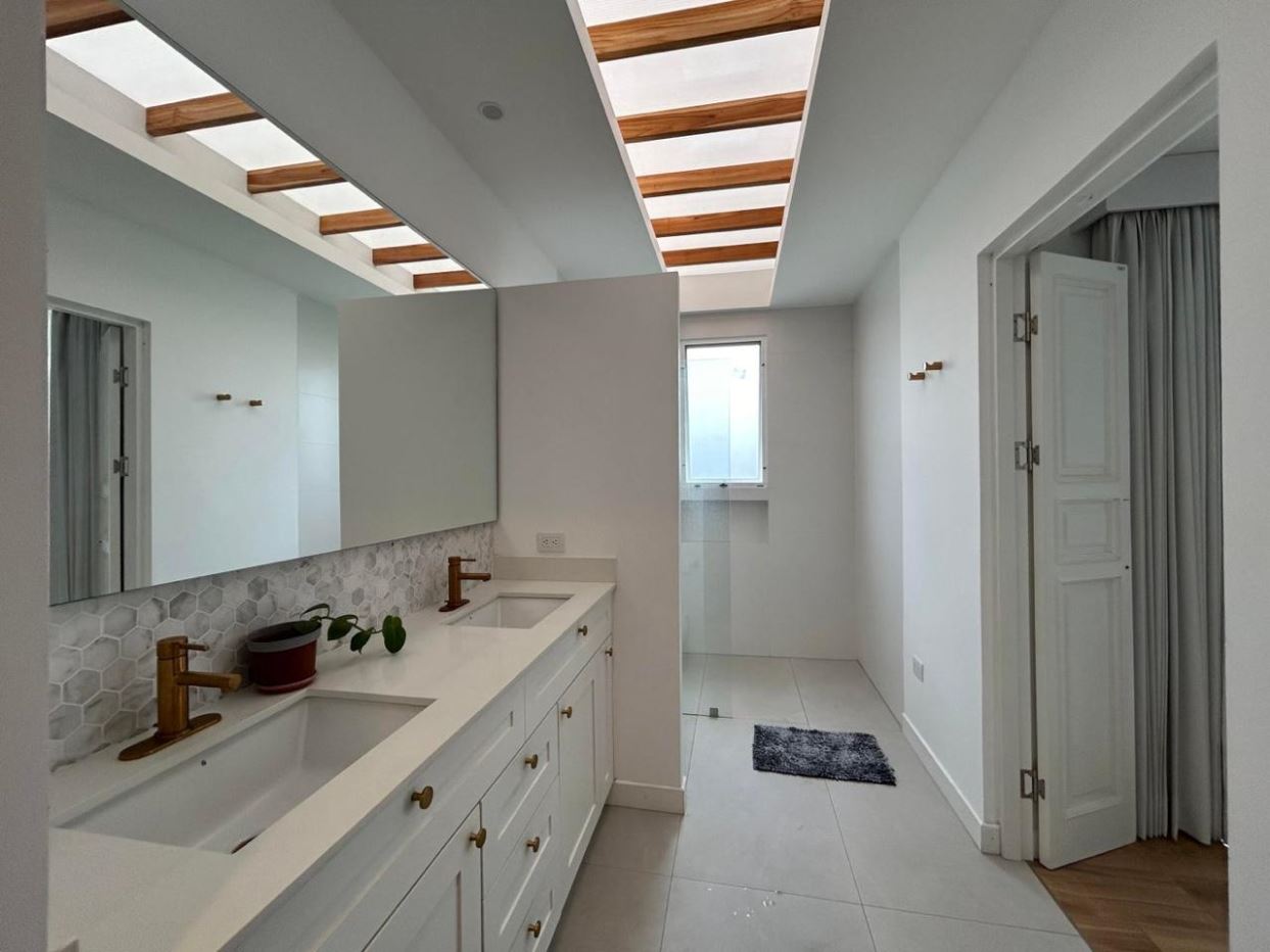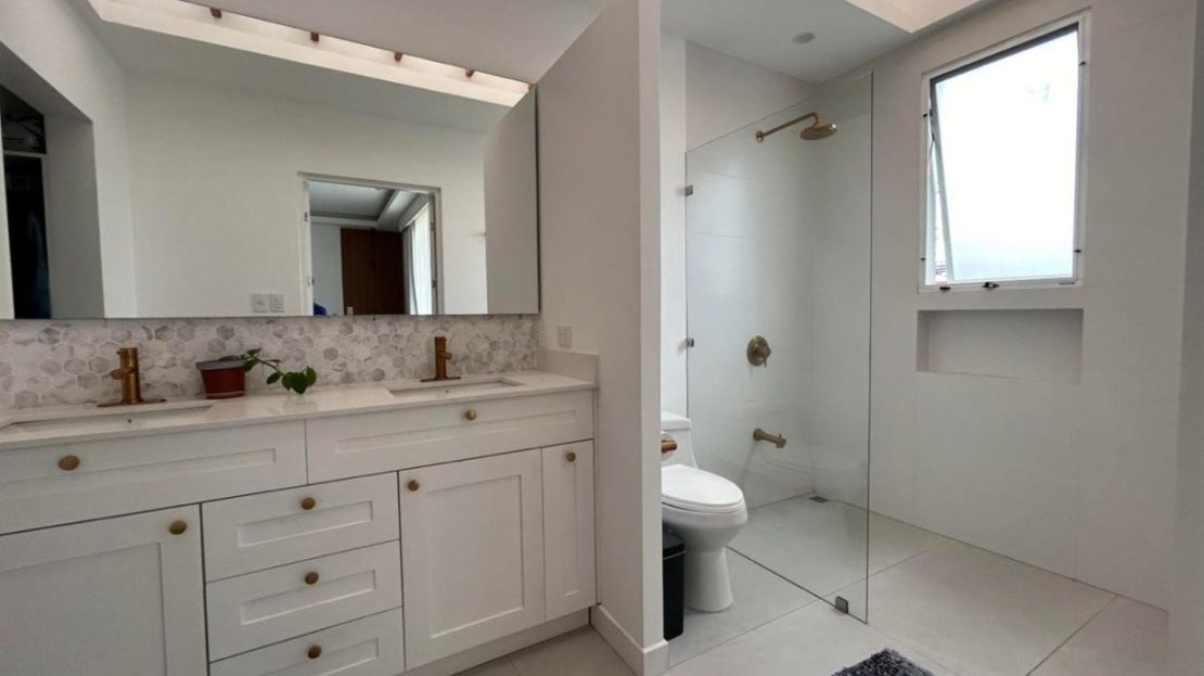 Baños con detalles en cuarzo y mármol, brindando un ambiente sofisticado y funcional.