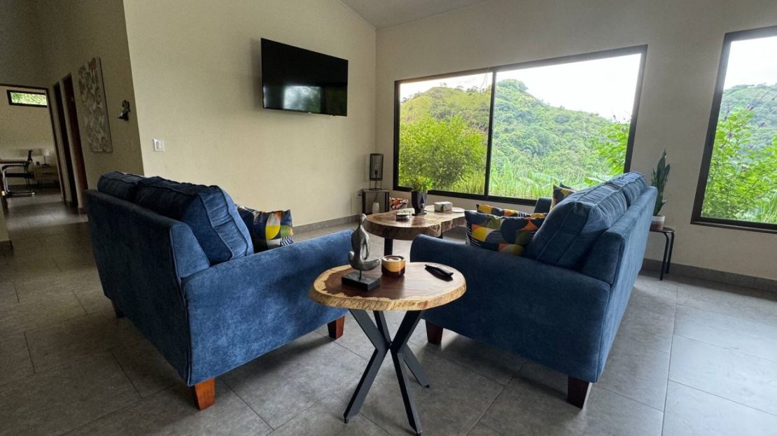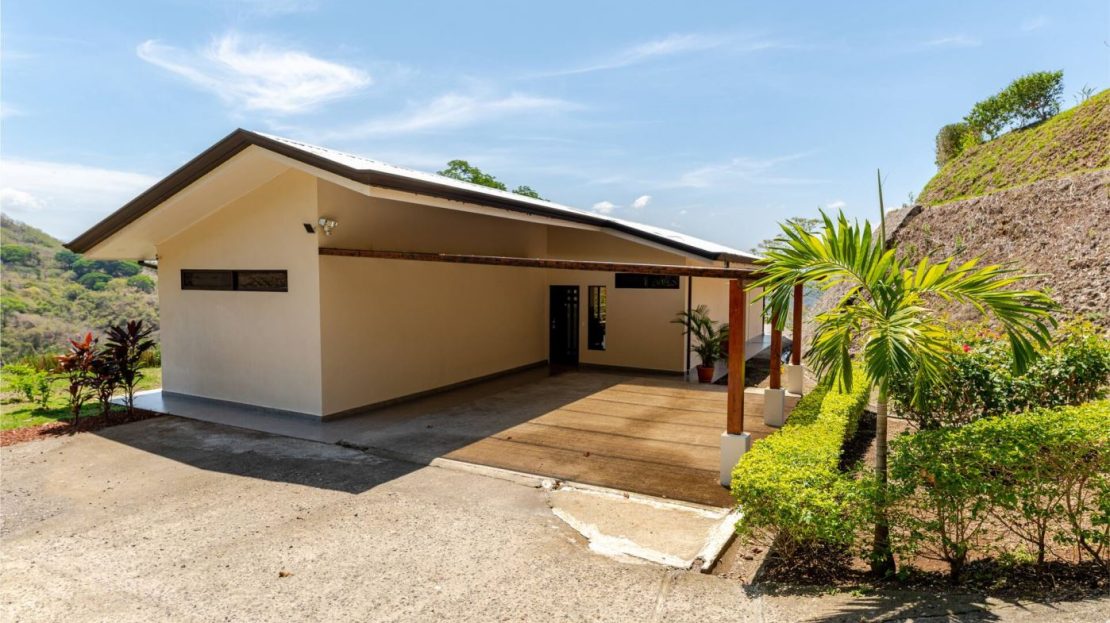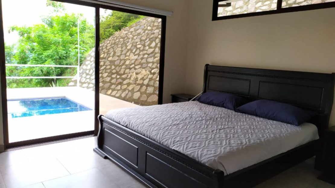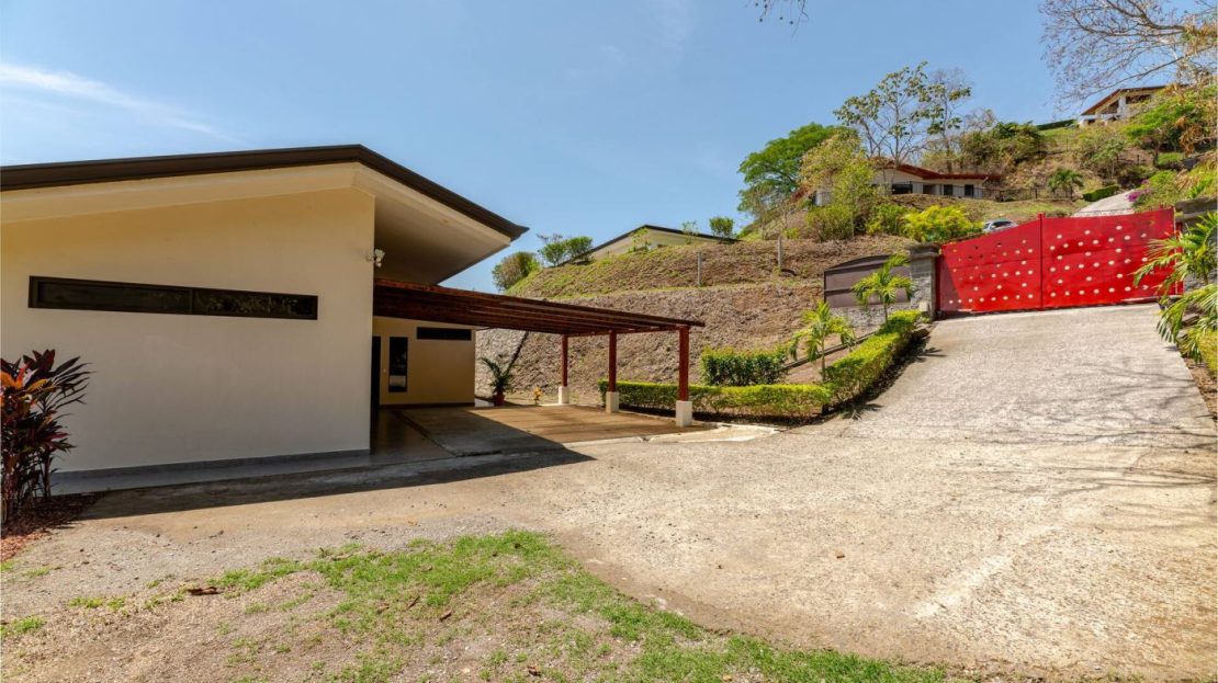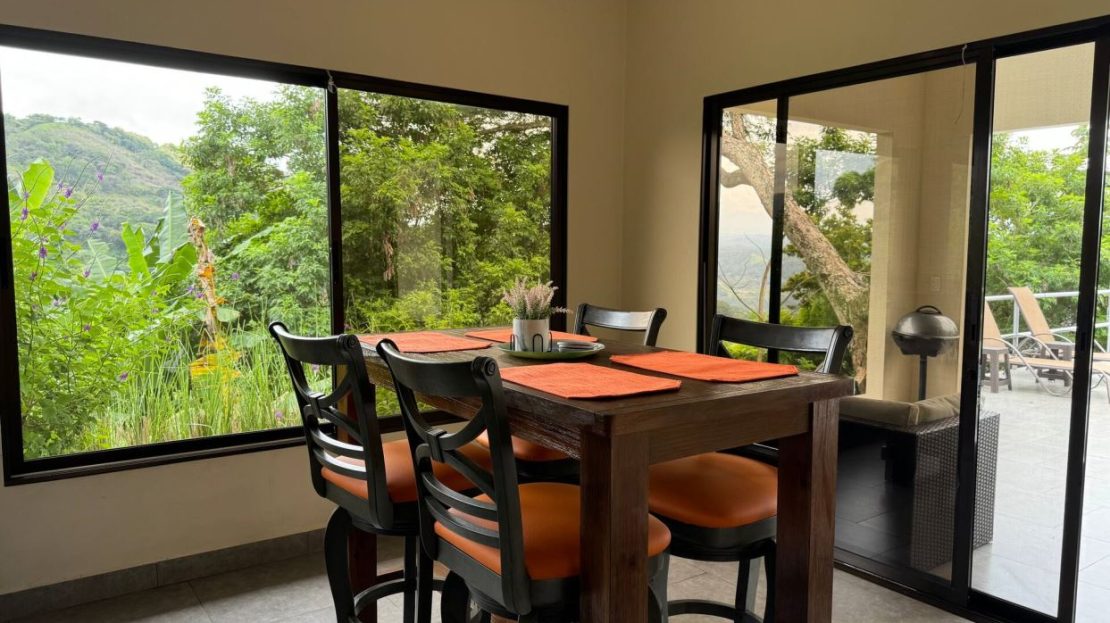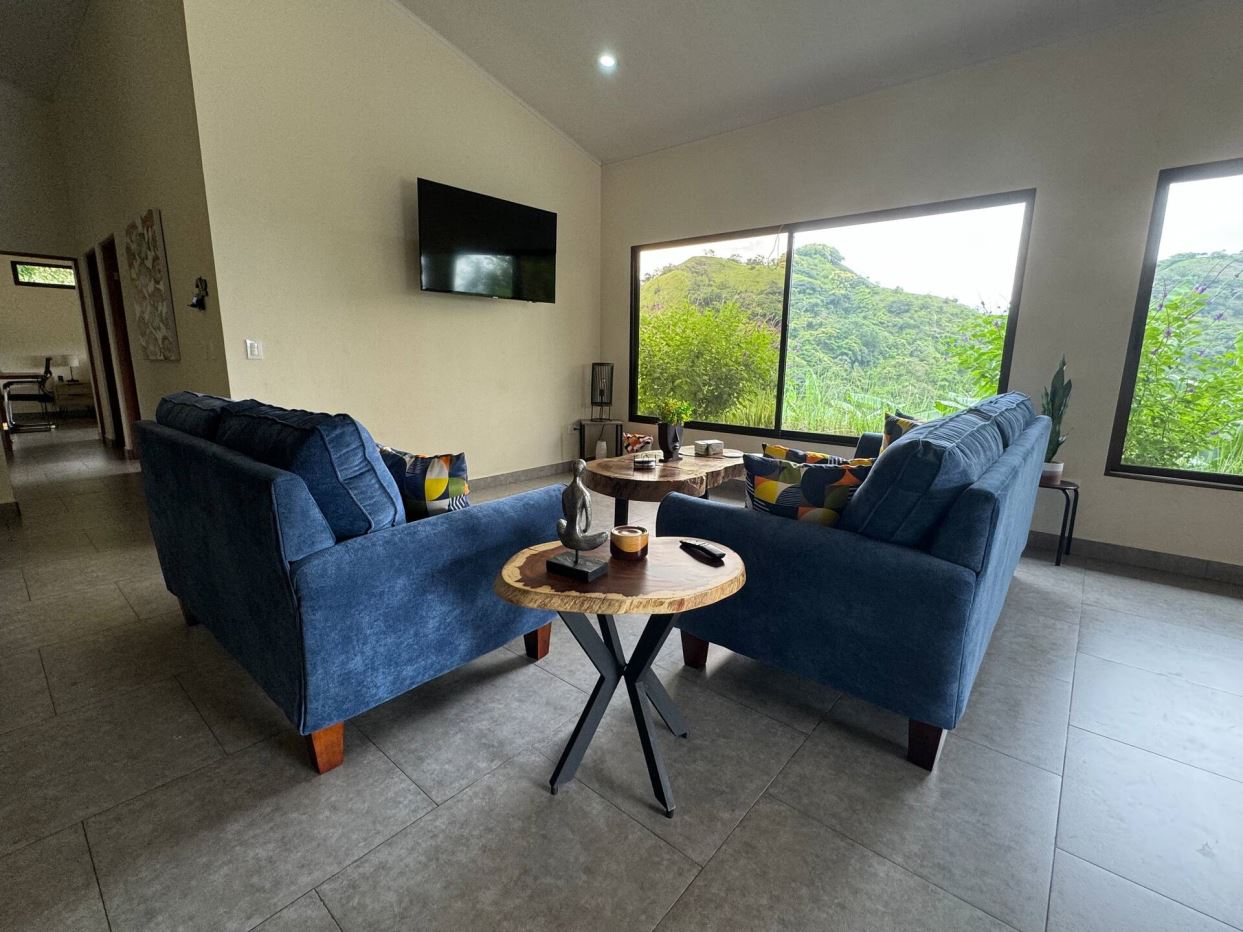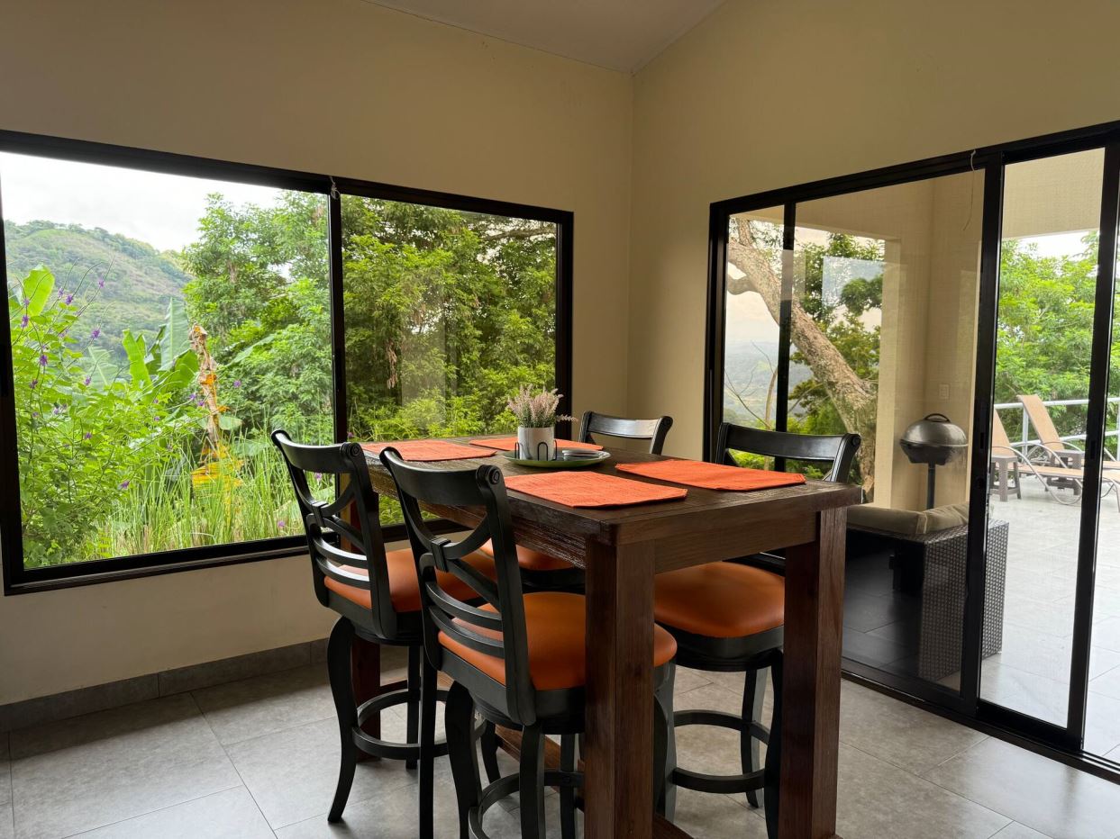 This modern-style vacation rental home with big views in Roca Verde is located in Atenas’ premier private community Roca Verde. The home features big panoramic views of the area mountains and towards the capital San Jose. The paved entrance is through an elegant large metal gate to a covered parking area. This is a nice size back and front yard with added space for added construction or gardening. The present garden is nicely landscaped throughout. The formal entry leads to the guest bedrooms with shared bathroom. Farther in is an open living and dinig area with modern kitchen and side laundry room. Adjacent the inviting large deck and pool area is the master bedroom with en suite bathroom. The home is sold turnkey and nicely furnished throughout. The home is a successfully run vacation rental home with present income and book of business.