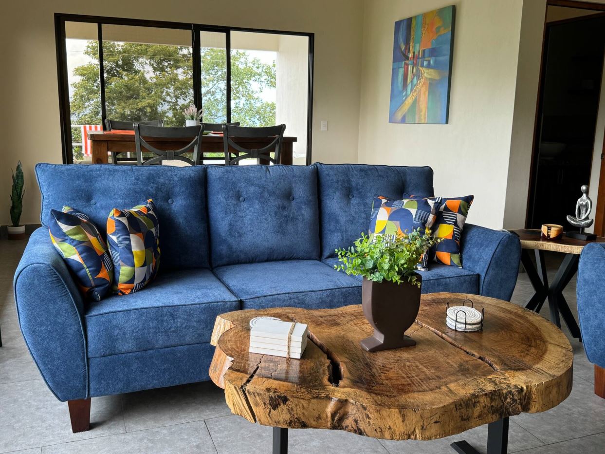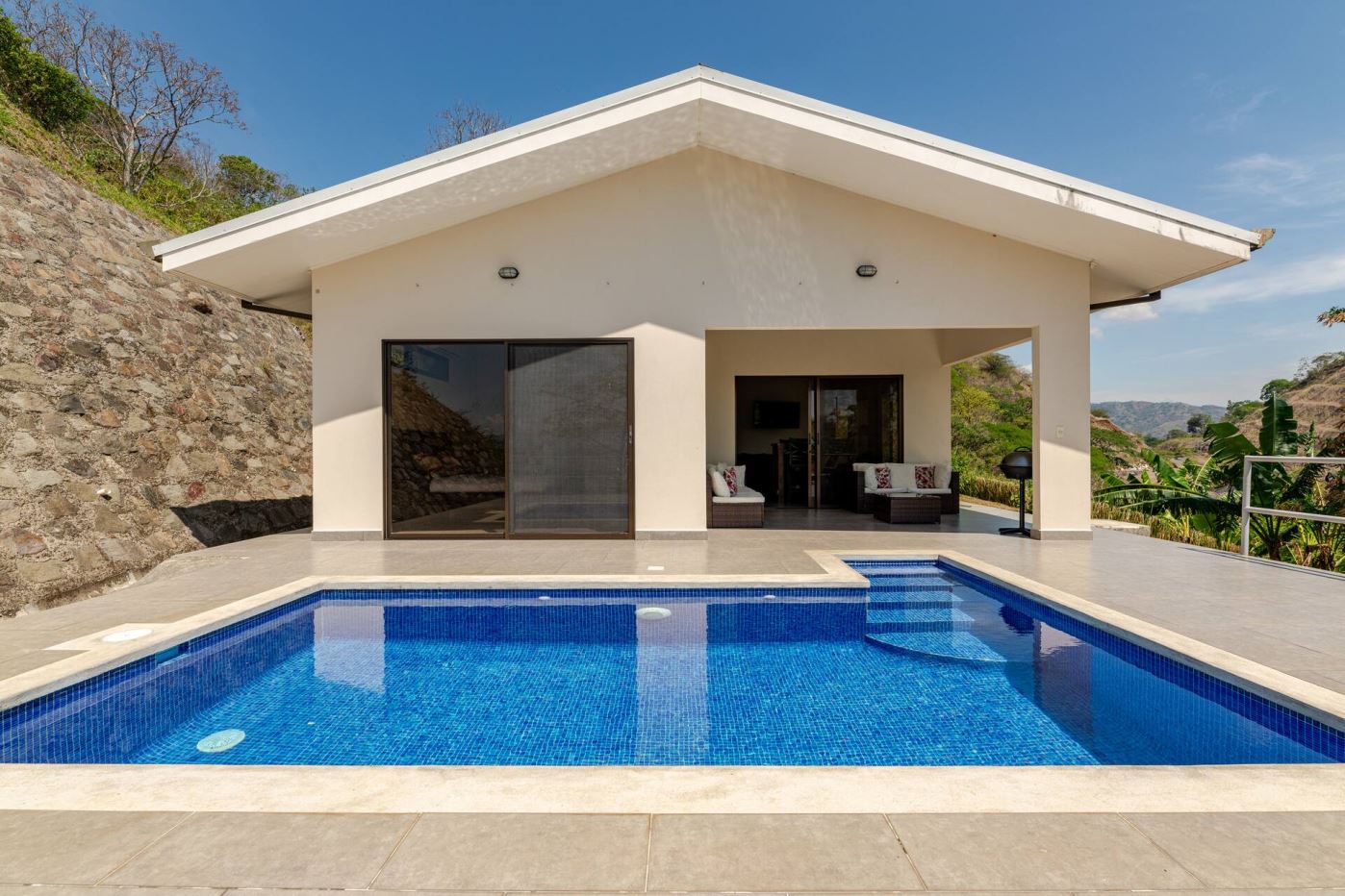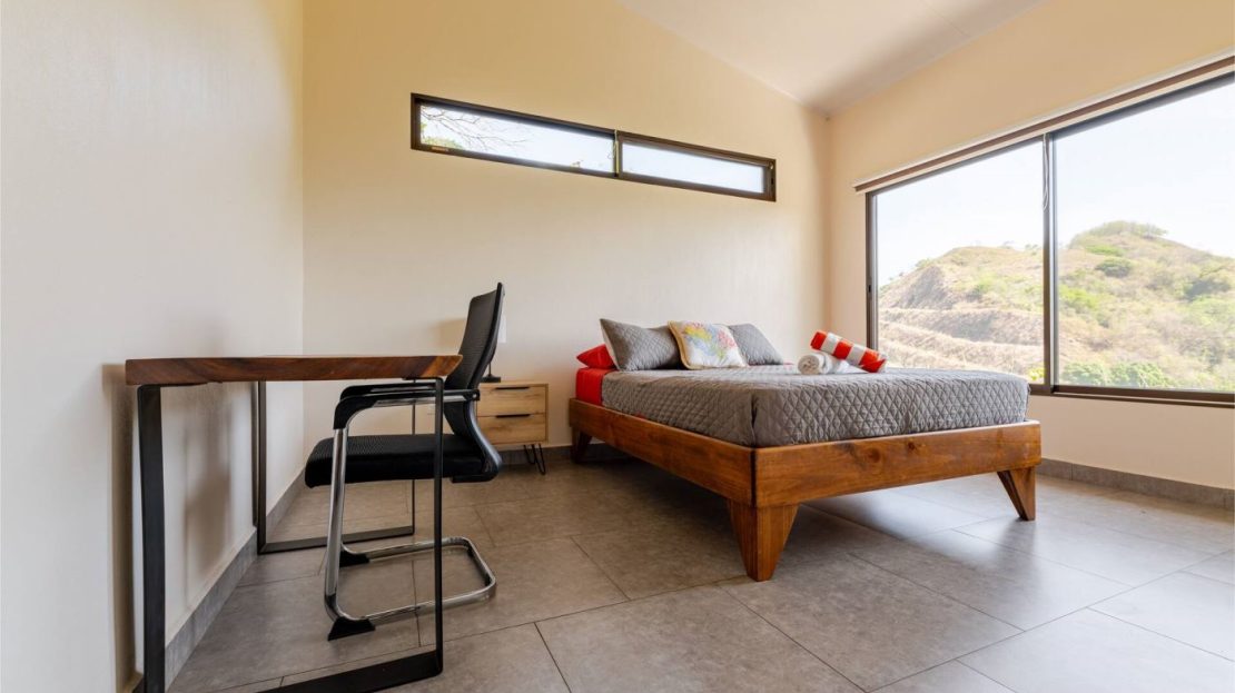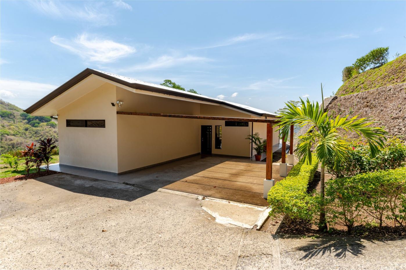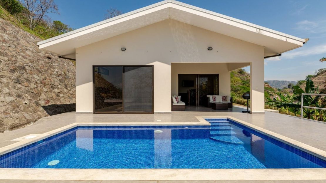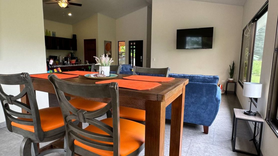 This modern-style vacation rental home with big views in Roca Verde is located in Atenas’ premier private community Roca Verde. The home features big panoramic views of the area mountains and towards the capital San Jose. The paved entrance is through an elegant large metal gate to a covered parking area. This is a nice size back and front yard with added space for added construction or gardening. The present garden is nicely landscaped throughout. The formal entry leads to the guest bedrooms with shared bathroom. Farther in is an open living and dinig area with modern kitchen and side laundry room. Adjacent the inviting large deck and pool area is the master bedroom with en suite bathroom. The home is sold turnkey and nicely furnished throughout. The home is a successfully run vacation rental home with present income and book of business.
