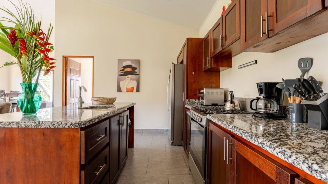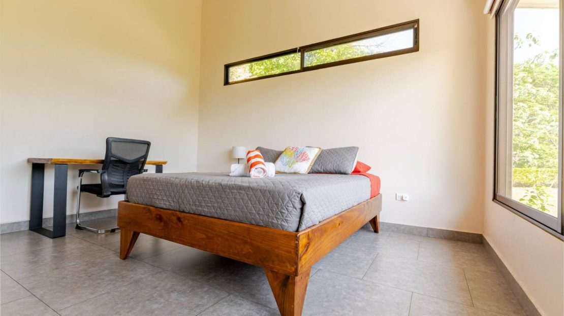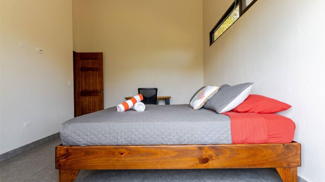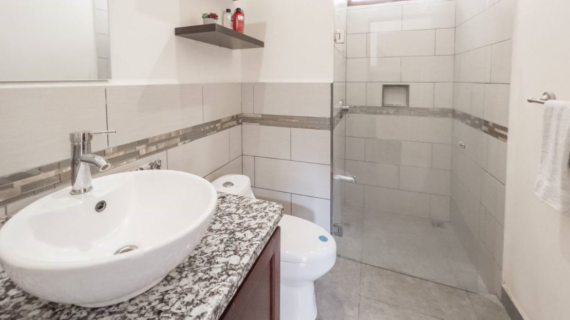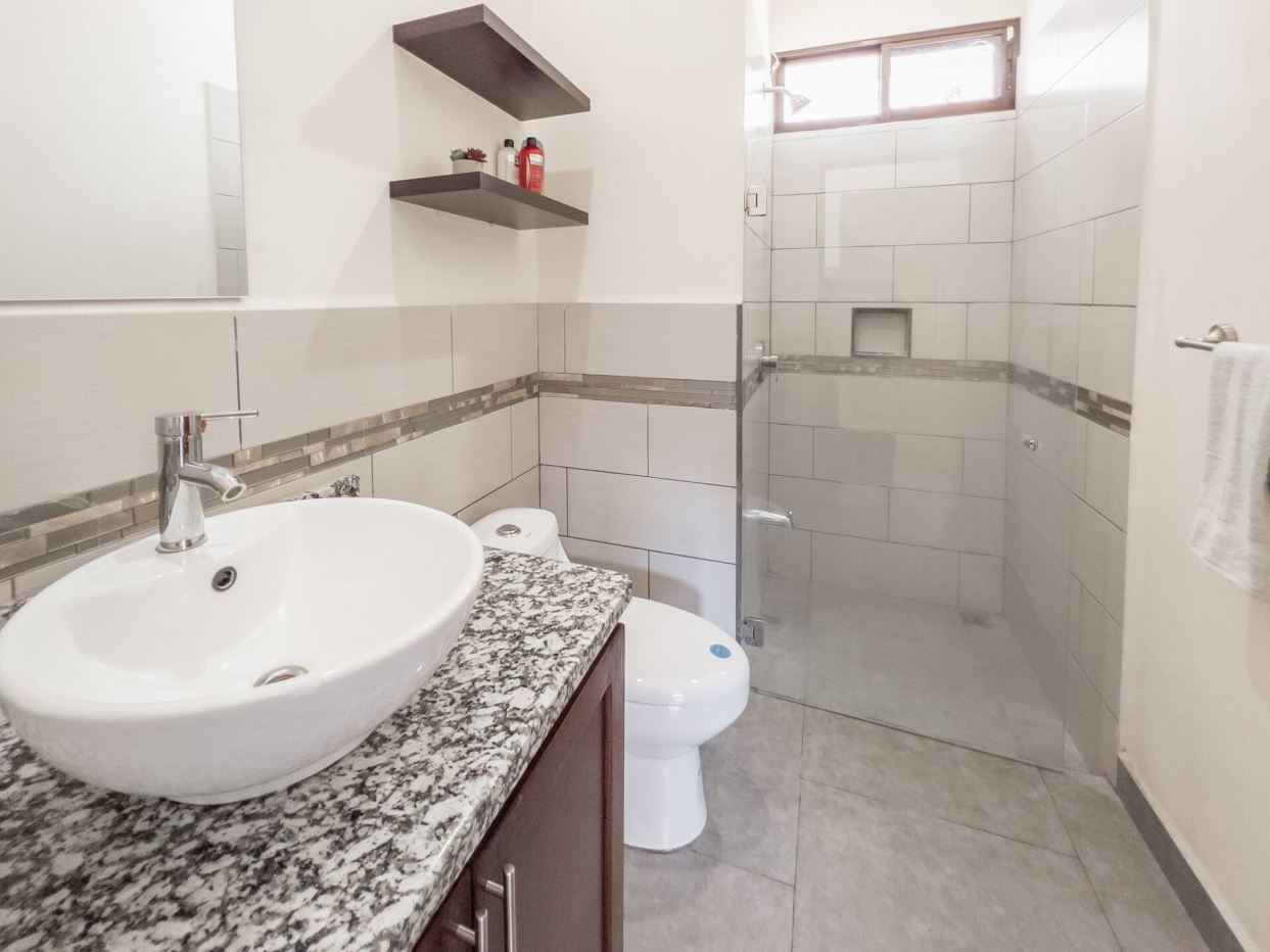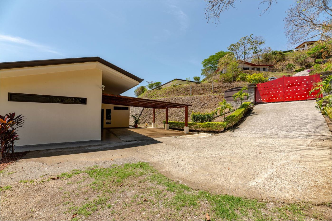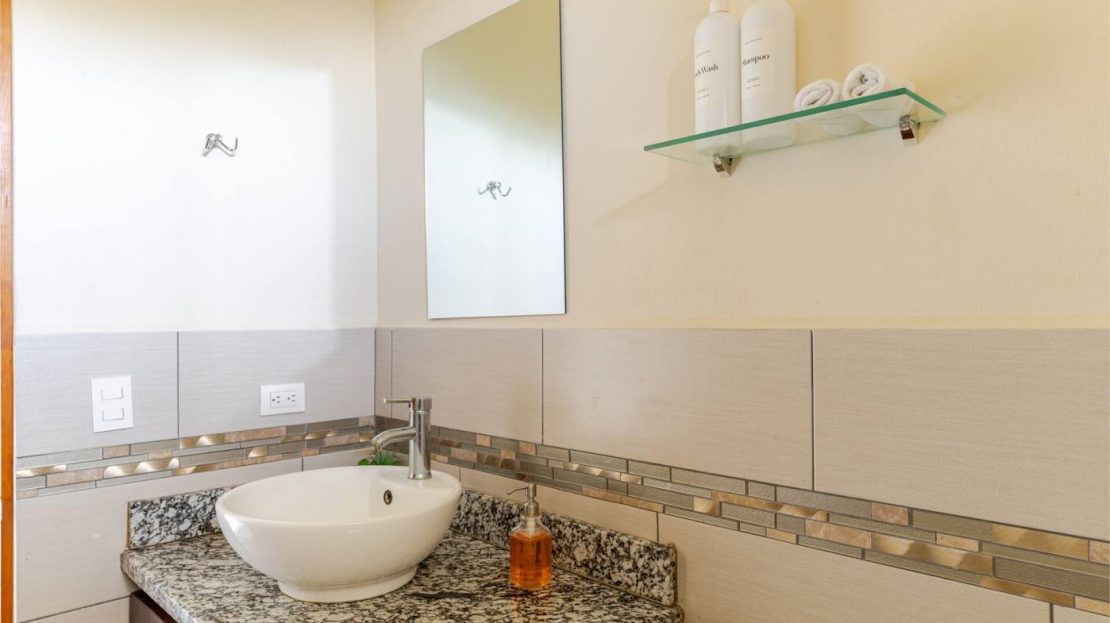 This modern-style vacation rental home with big views in Roca Verde is located in Atenas’ premier private community Roca Verde. The home features big panoramic views of the area mountains and towards the capital San Jose. The paved entrance is through an elegant large metal gate to a covered parking area. This is a nice size back and front yard with added space for added construction or gardening. The present garden is nicely landscaped throughout. The formal entry leads to the guest bedrooms with shared bathroom. Farther in is an open living and dinig area with modern kitchen and side laundry room. Adjacent the inviting large deck and pool area is the master bedroom with en suite bathroom. The home is sold turnkey and nicely furnished throughout. The home is a successfully run vacation rental home with present income and book of business.