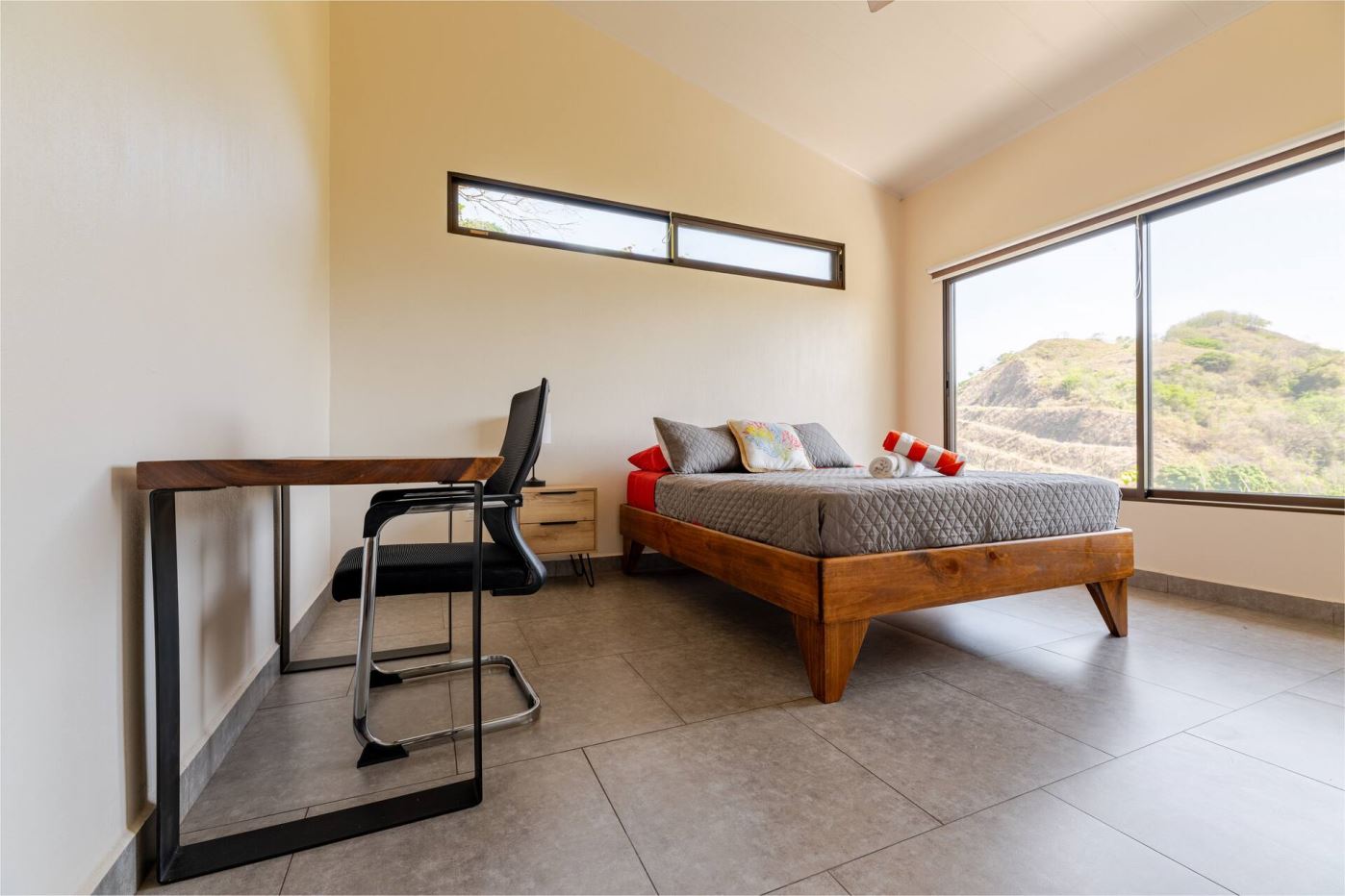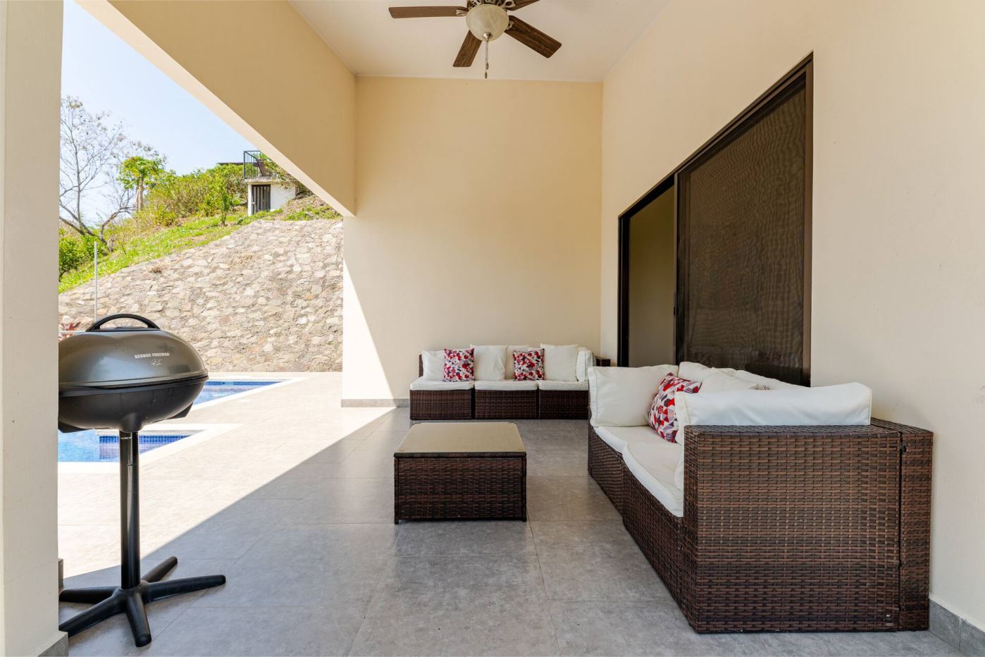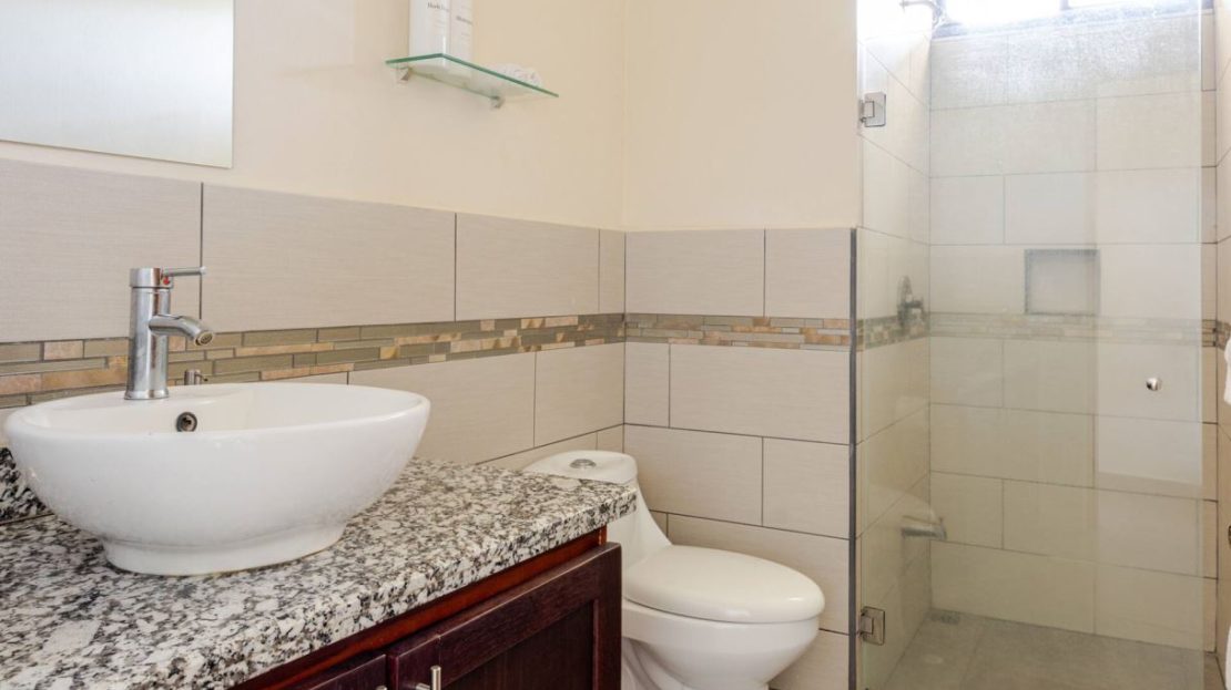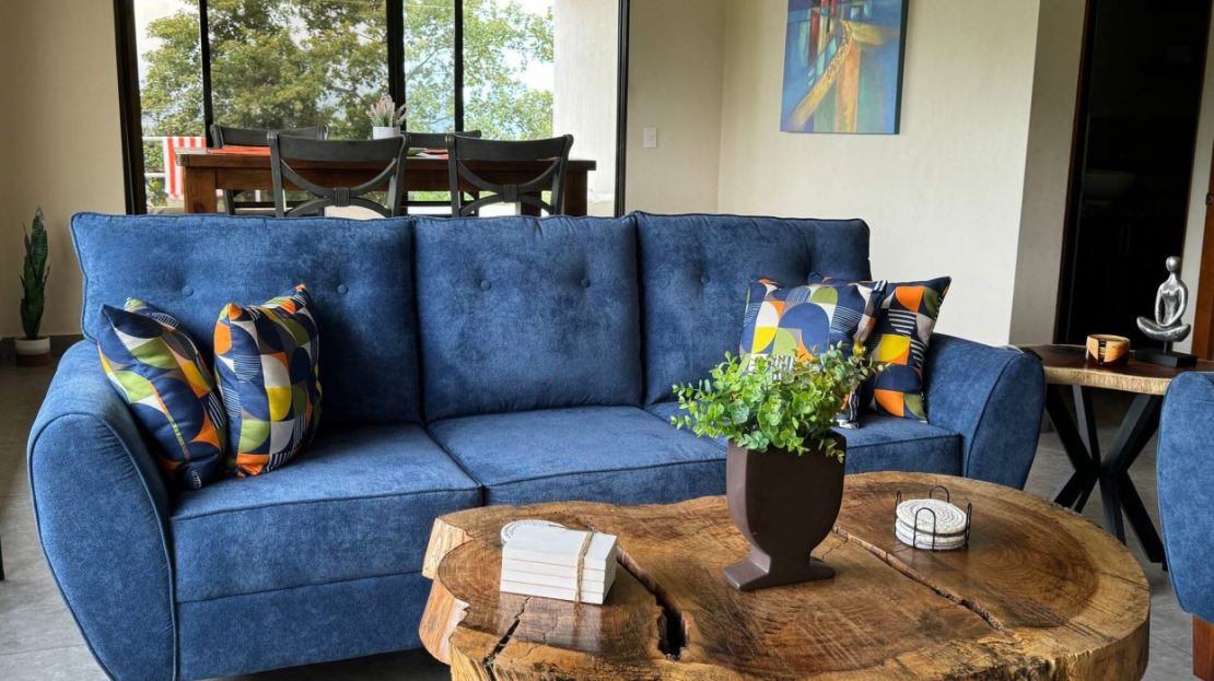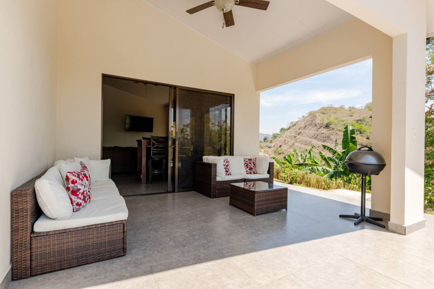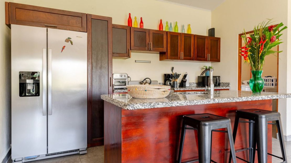 This modern-style vacation rental home with big views in Roca Verde is located in Atenas’ premier private community Roca Verde. The home features big panoramic views of the area mountains and towards the capital San Jose. The paved entrance is through an elegant large metal gate to a covered parking area. This is a nice size back and front yard with added space for added construction or gardening. The present garden is nicely landscaped throughout. The formal entry leads to the guest bedrooms with shared bathroom. Farther in is an open living and dinig area with modern kitchen and side laundry room. Adjacent the inviting large deck and pool area is the master bedroom with en suite bathroom. The home is sold turnkey and nicely furnished throughout. The home is a successfully run vacation rental home with present income and book of business.