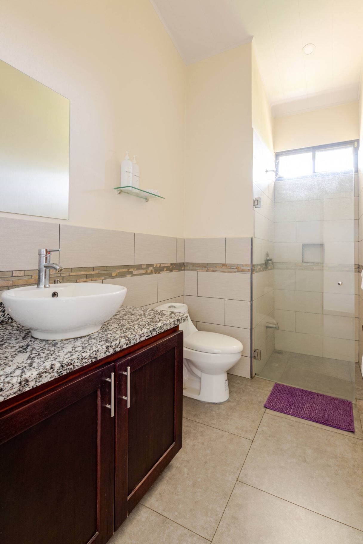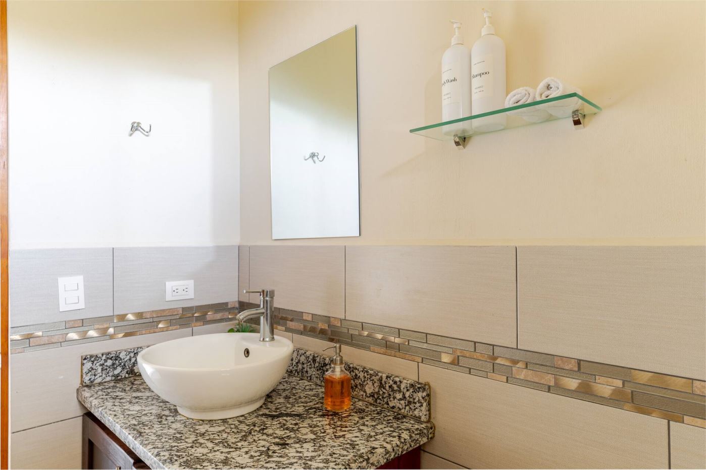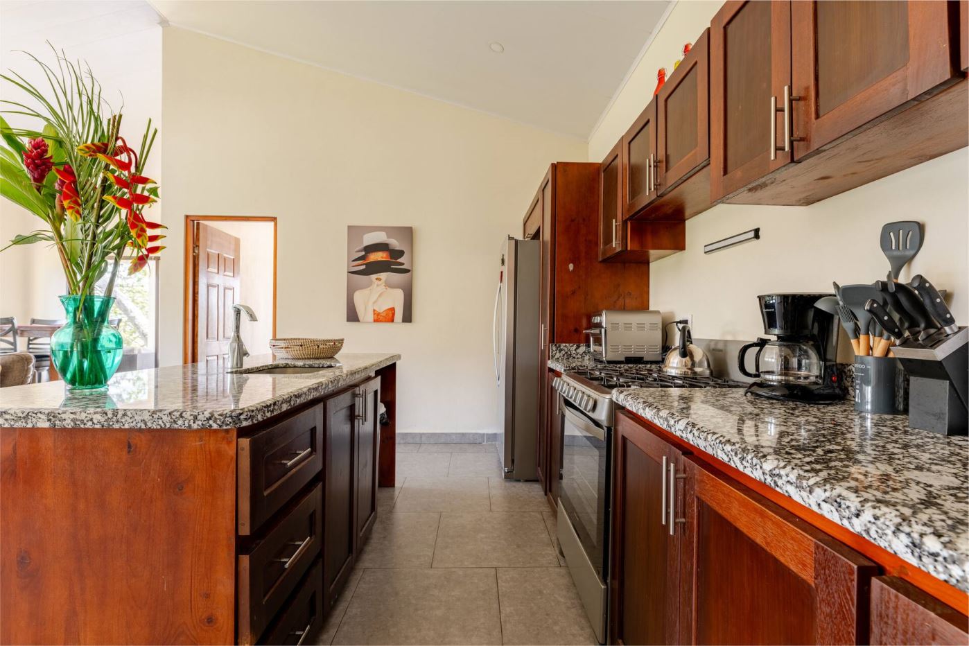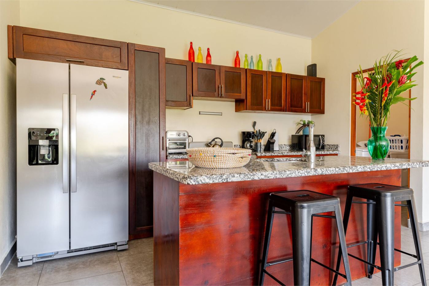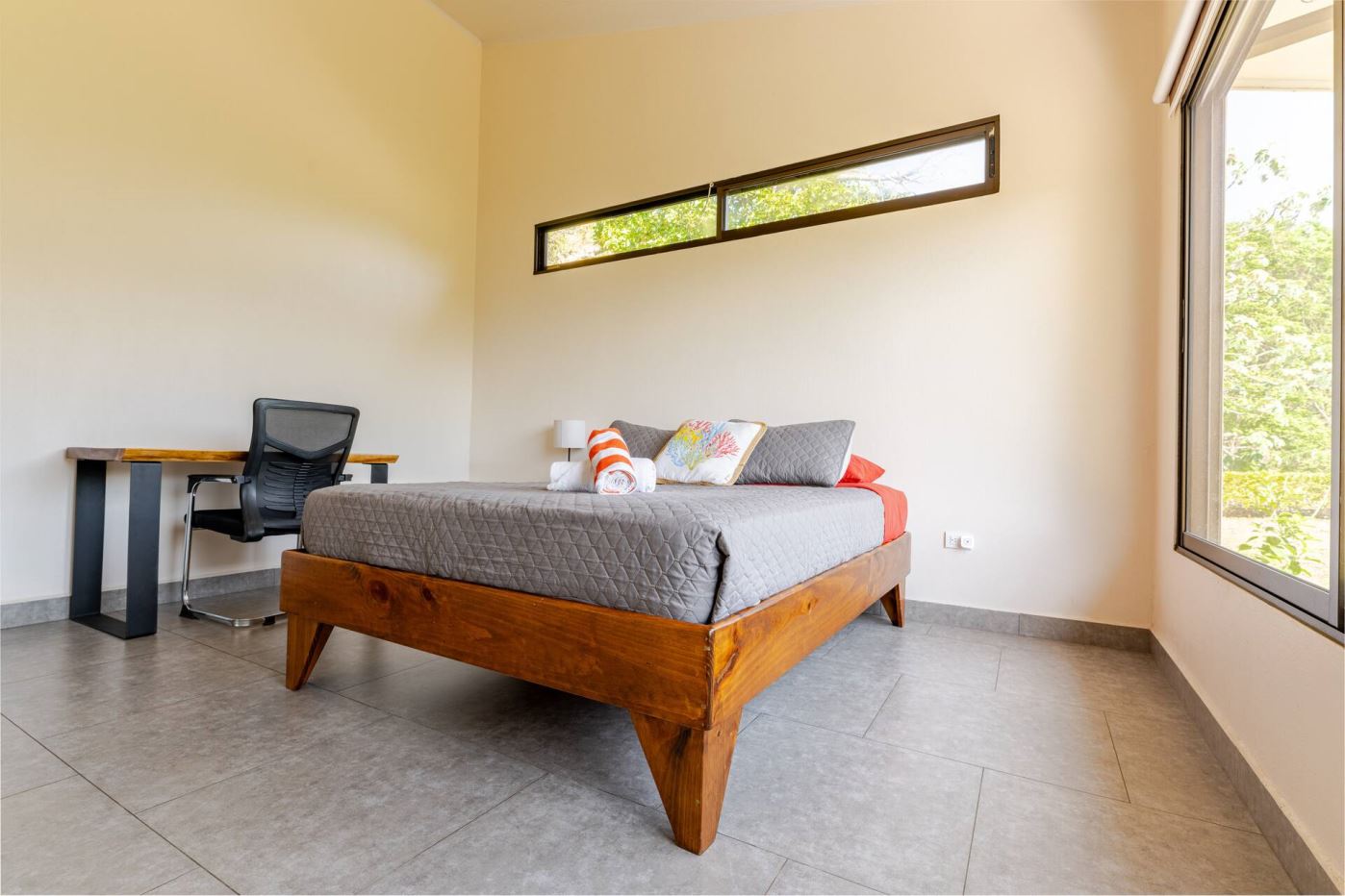 This modern-style vacation rental home with big views in Roca Verde is located in Atenas’ premier private community Roca Verde. The home features big panoramic views of the area mountains and towards the capital San Jose. The paved entrance is through an elegant large metal gate to a covered parking area. This is a nice size back and front yard with added space for added construction or gardening. The present garden is nicely landscaped throughout. The formal entry leads to the guest bedrooms with shared bathroom. Farther in is an open living and dinig area with modern kitchen and side laundry room. Adjacent the inviting large deck and pool area is the master bedroom with en suite bathroom. The home is sold turnkey and nicely furnished throughout. The home is a successfully run vacation rental home with present income and book of business.
