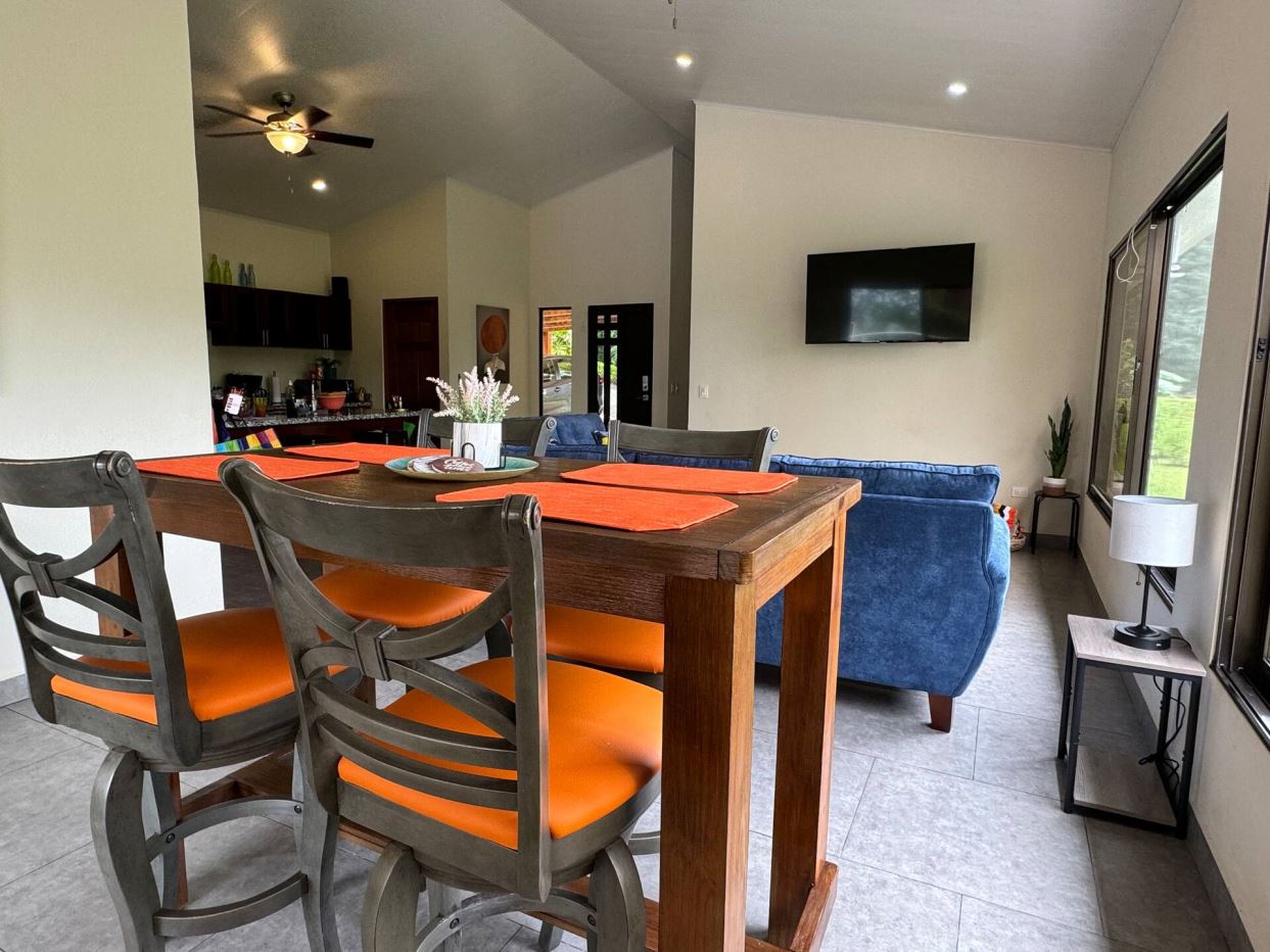 Esta casa de alquiler vacacional de estilo moderno con vistas panorámicas en Roca Verde se encuentra en la exclusiva comunidad privada de Atenas. La casa ofrece vistas panorámicas de las montañas de la zona y de la capital, San José. La entrada pavimentada se realiza a través de una elegante puerta metálica que conduce a un área de estacionamiento techada. Cuenta con un amplio jardín delantero y trasero, con espacio adicional para futuras construcciones o para cultivar. El jardín actual está muy bien diseñado. La entrada principal conduce a las habitaciones de huéspedes con baño compartido. Más adelante se encuentra una sala de estar y comedor de concepto abierto con una cocina moderna y un cuarto de lavandería lateral. Junto a la acogedora terraza y la piscina se encuentra el dormitorio principal con baño en suite. La casa se vende completamente amueblada y lista para habitar. Es una casa de alquiler vacacional exitosa con ingresos y cartera de clientes actuales.