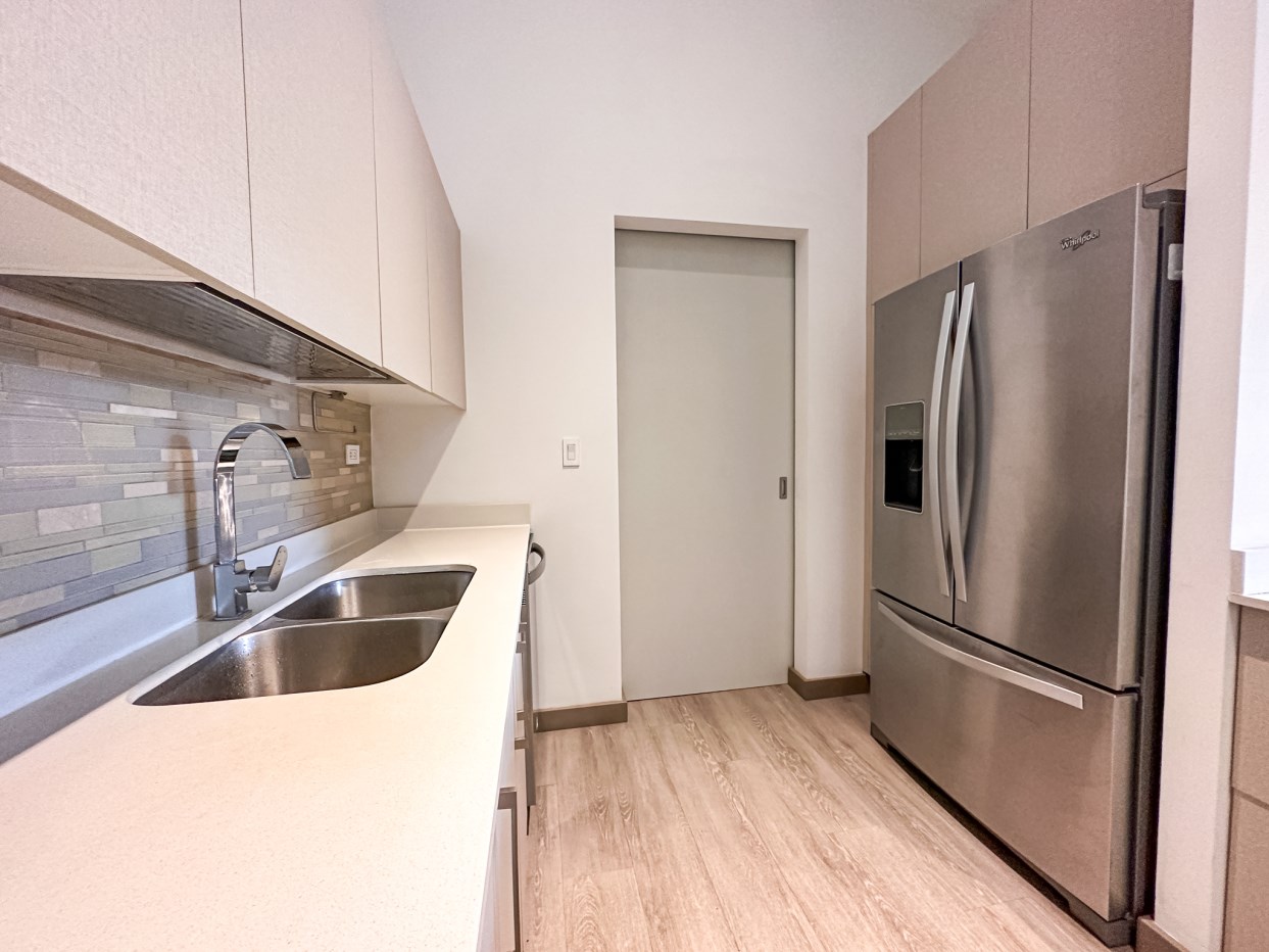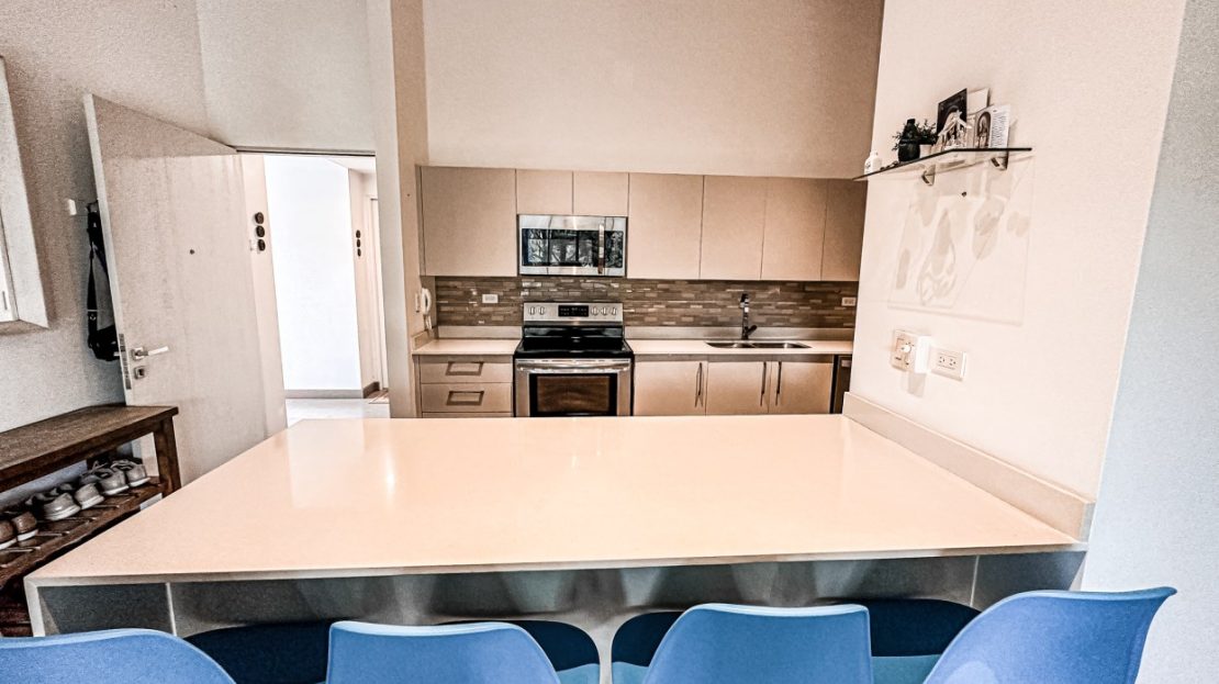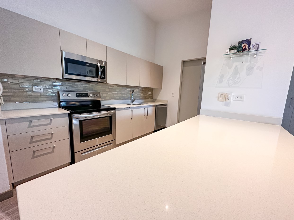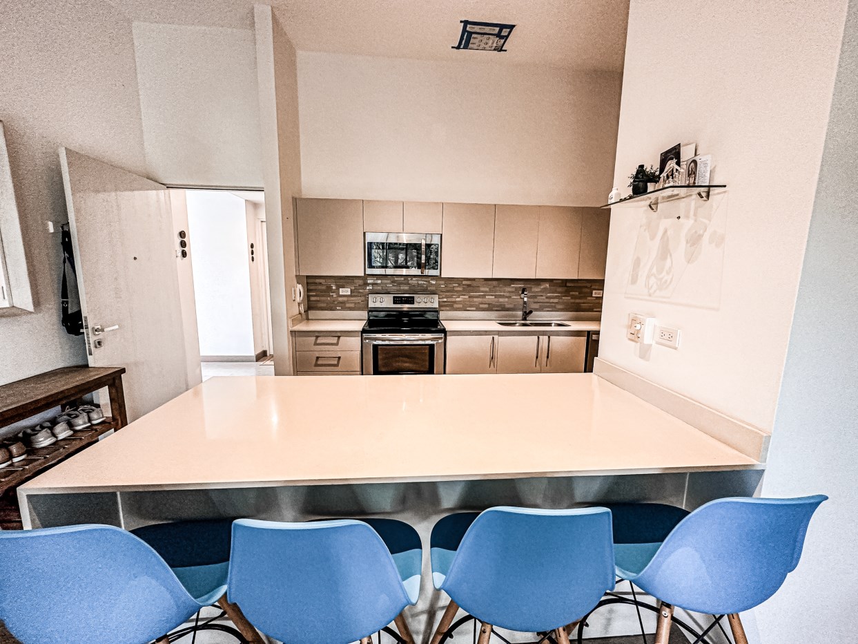 Cocina con back splash , desayunador y con amplio espacio para almacenamiento. Consta además de extractor de grasa, refrigeradora, microondas, cocina y horno.
