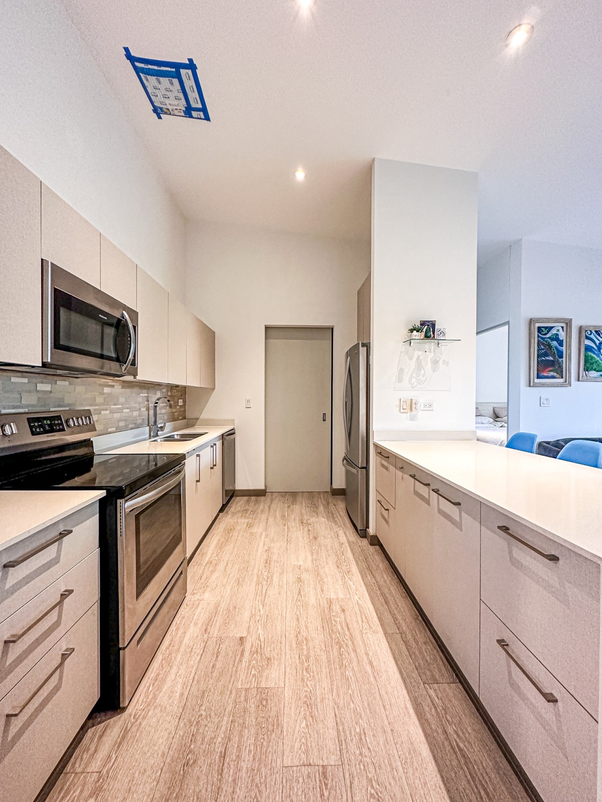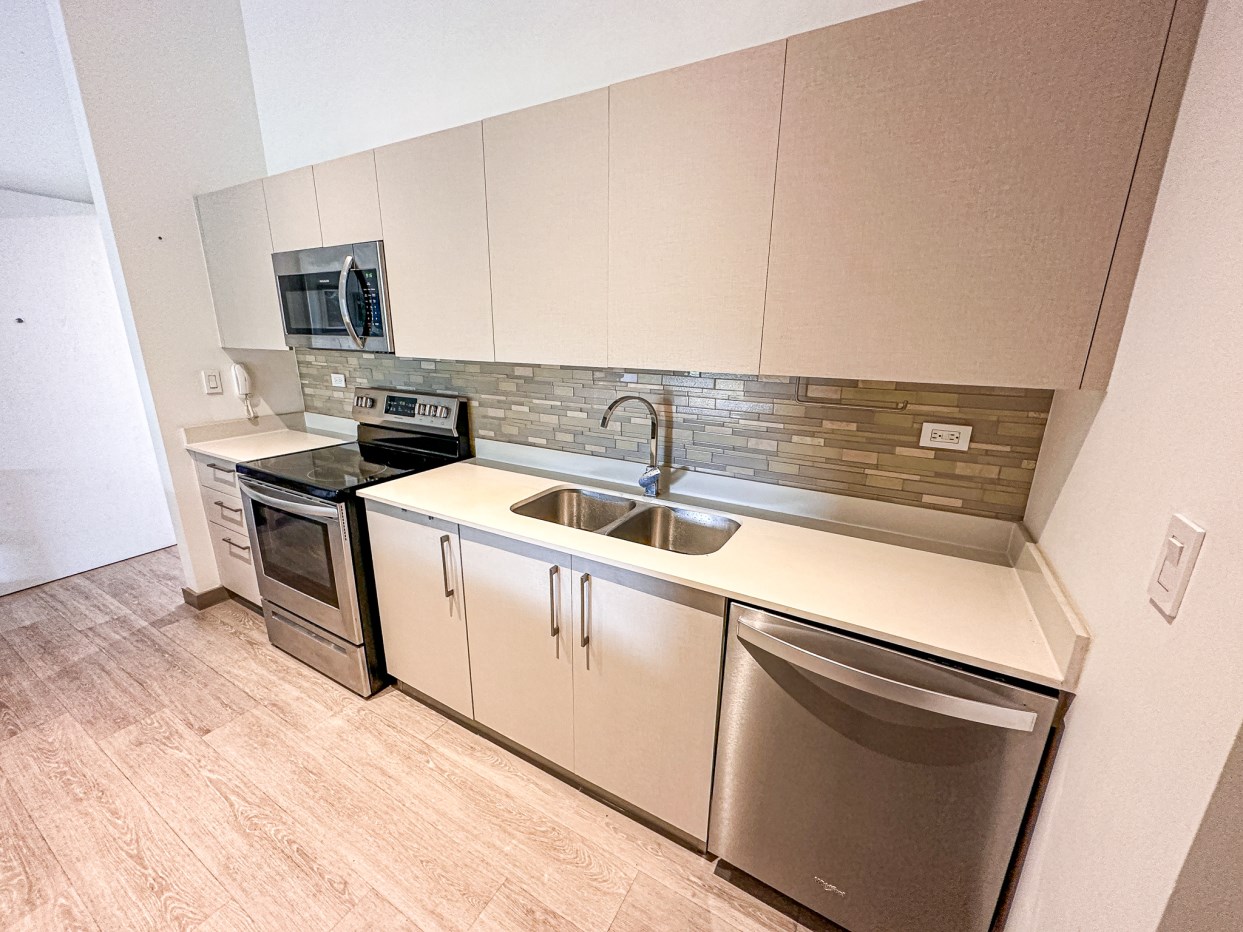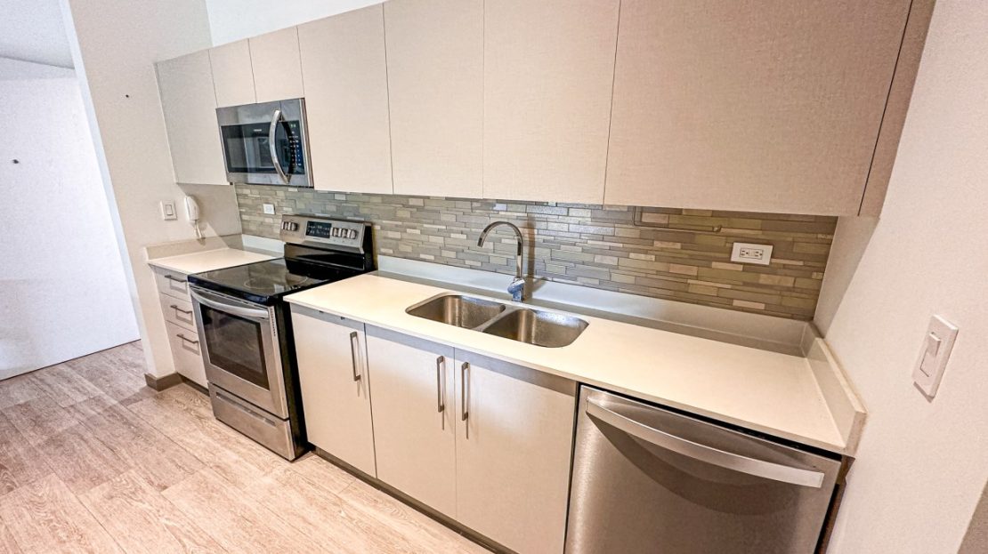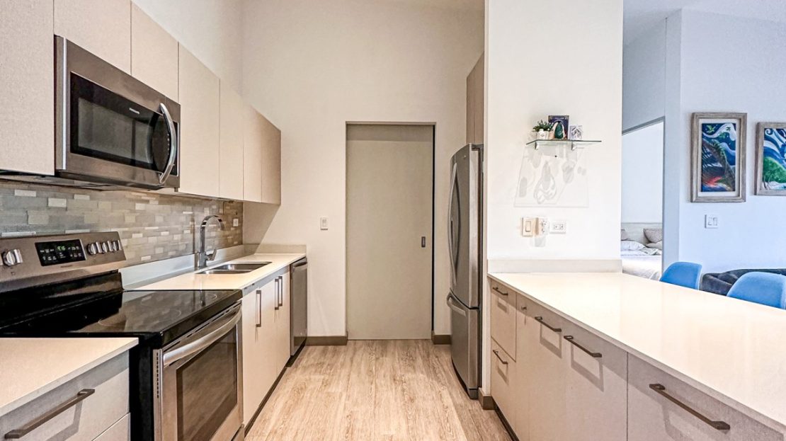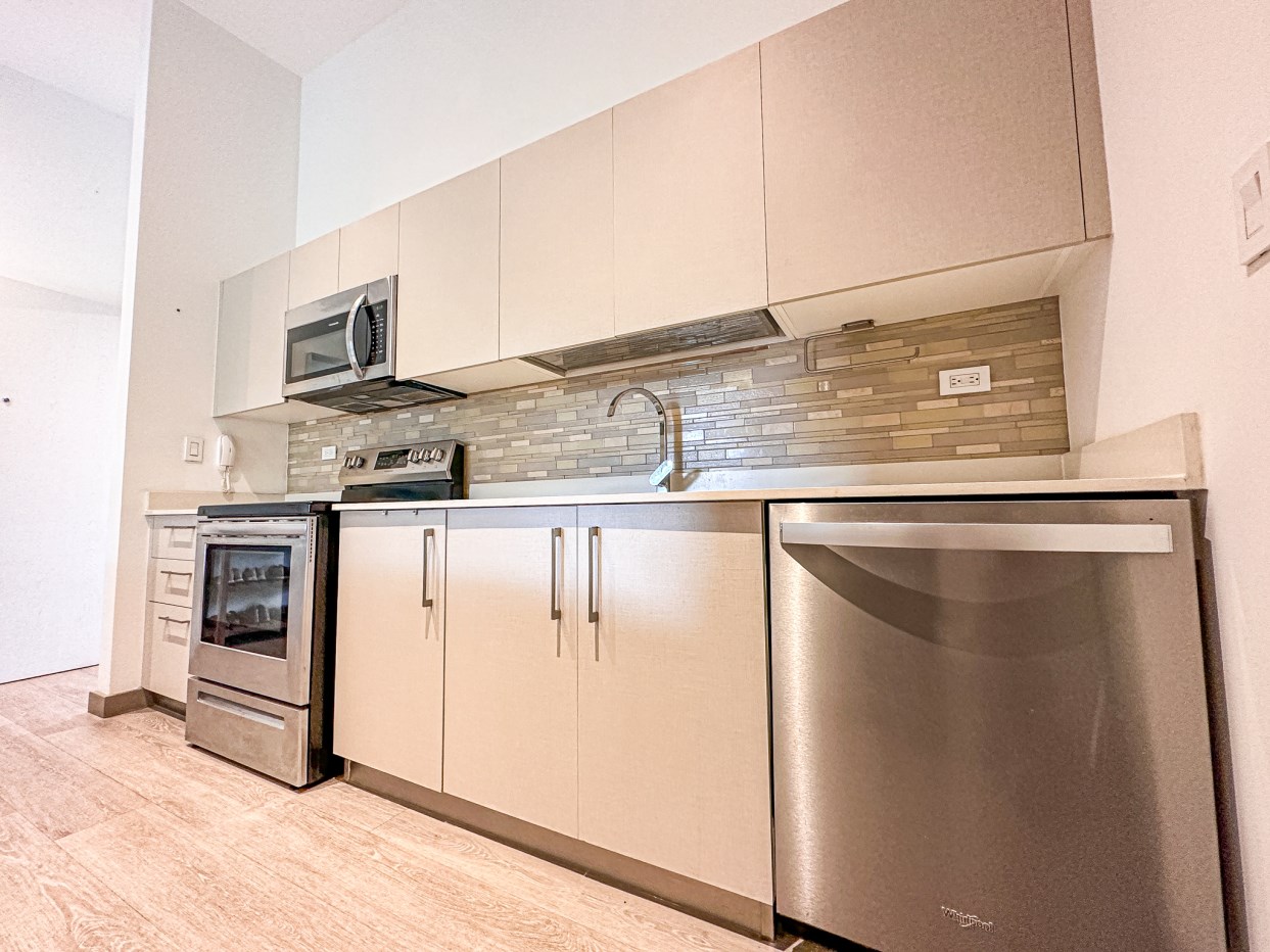 Cocina con back splash , desayunador y con amplio espacio para almacenamiento. Consta además de extractor de grasa, refrigeradora, microondas, cocina y horno.