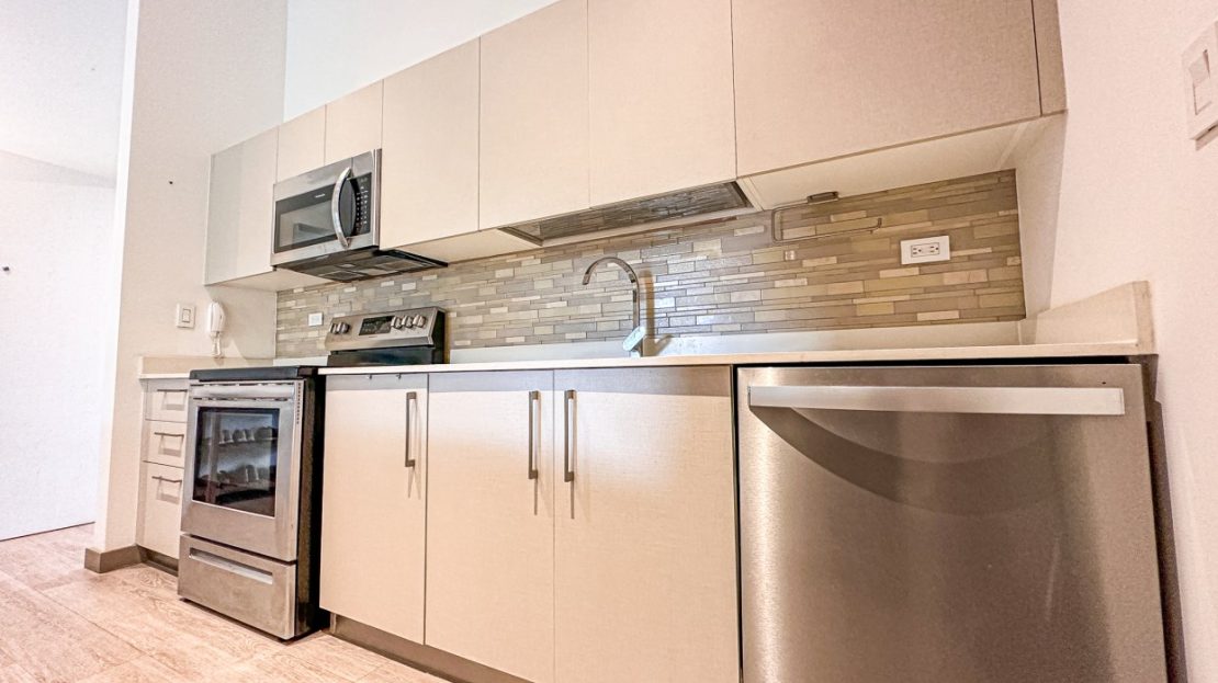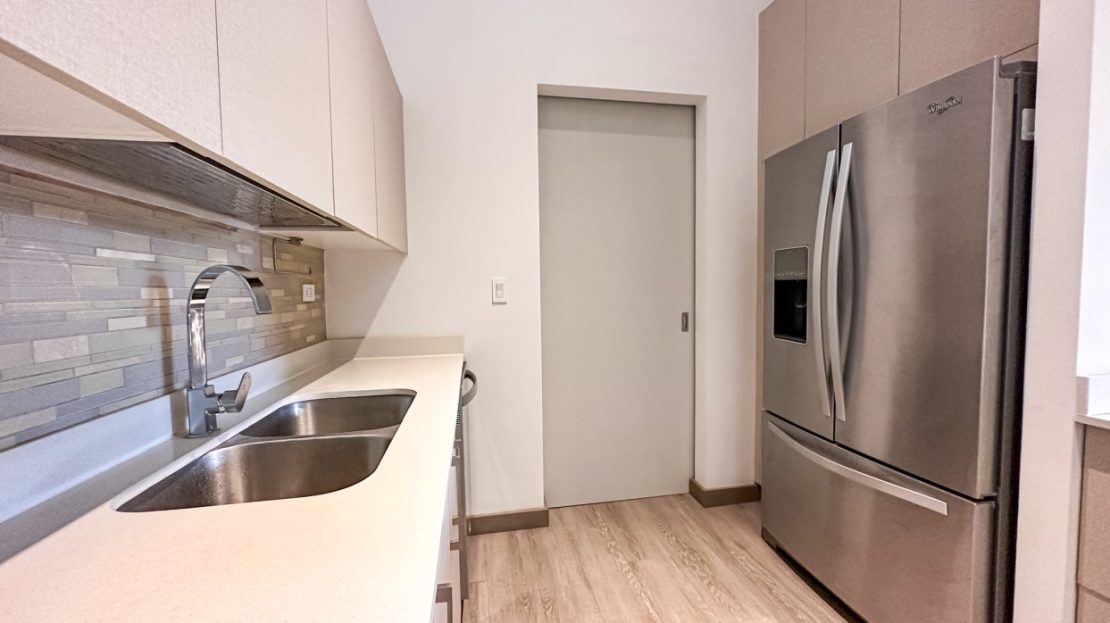 – Kitchen with back splash, breakfast bar and ample storage space. It also has grease extractor, refrigerator, microwave, stove and oven.