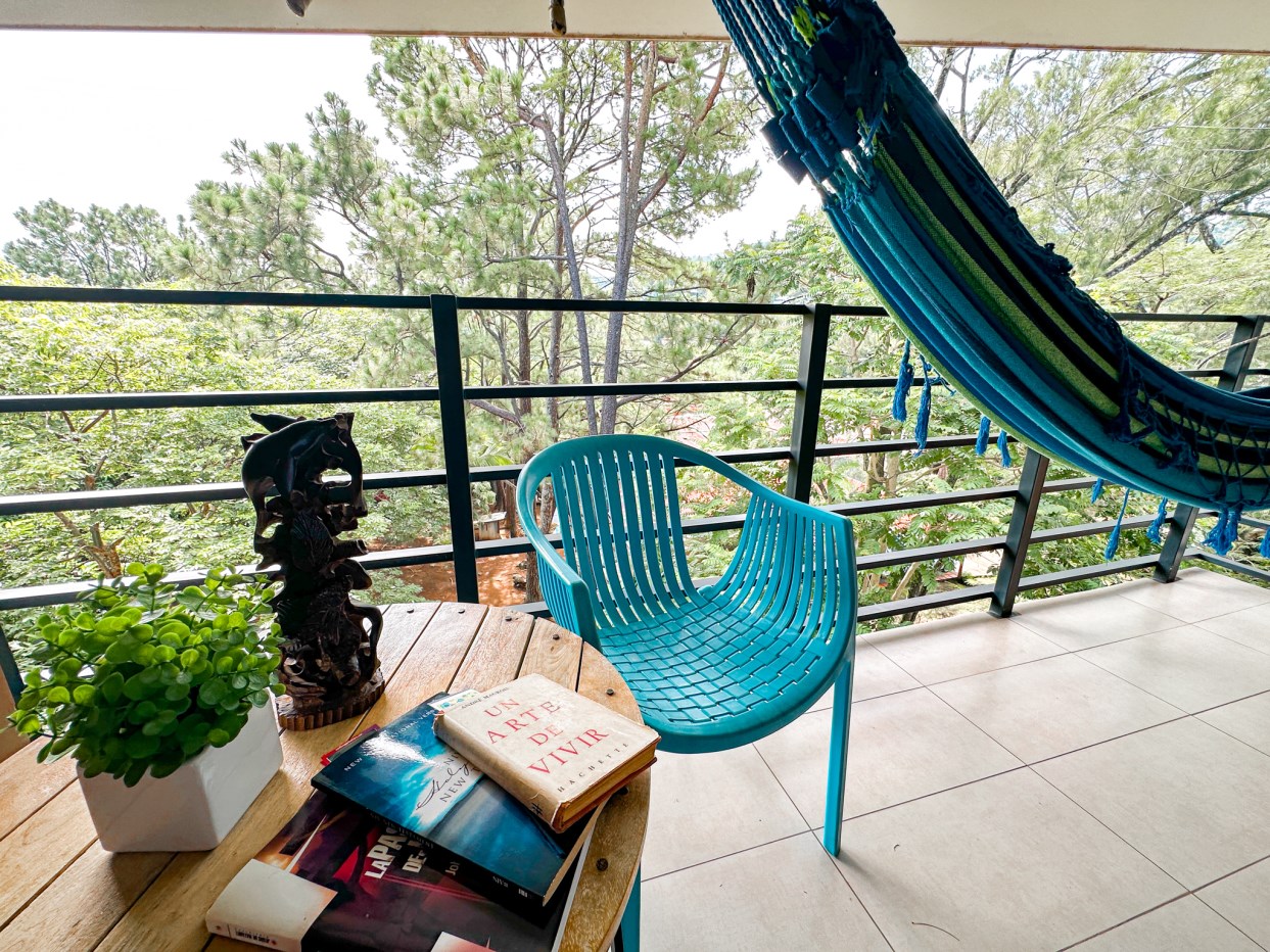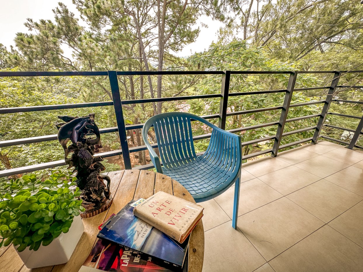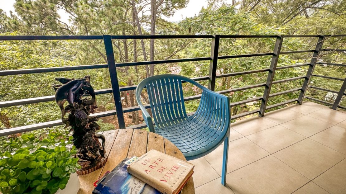 Balcón amplio con piso de porcelanato con vista a las montañas y a la copa de los arboles
