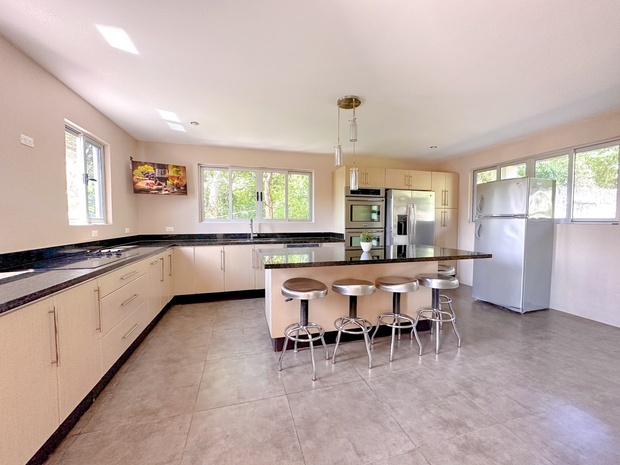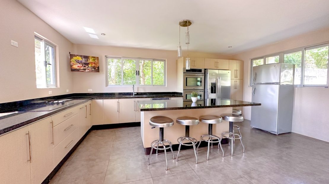 1 master bedroom with full bathroom and walk in closet. It also has a private balcony.2 secondary bedrooms sharing a bathroomOffice spaceLarge kitchen with island and storage space.Kitchen with granite cabinetsCupboardSpace for office, studio or other roomLarge laundry roomLarge garden surrounding the houseStorage roomParking space for 4 cars