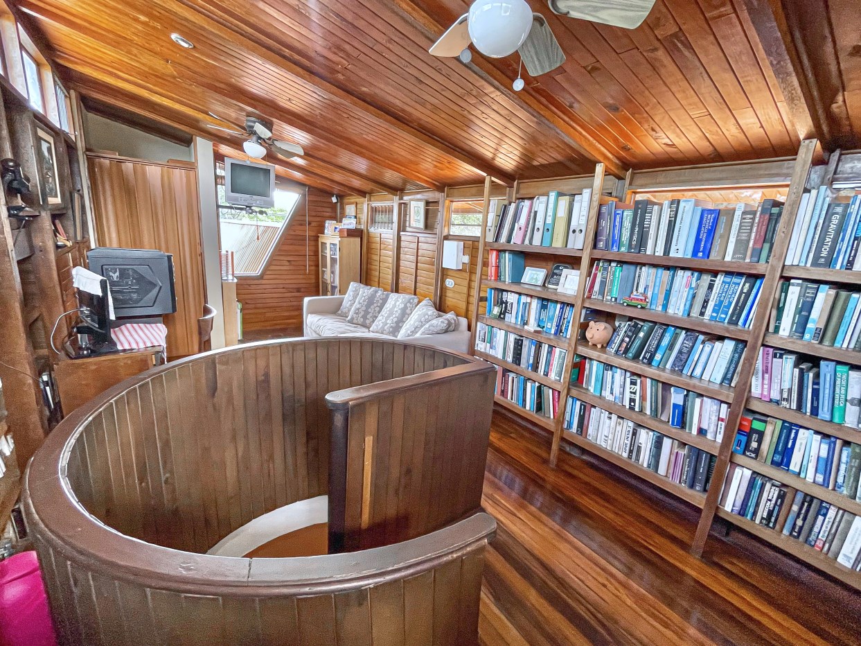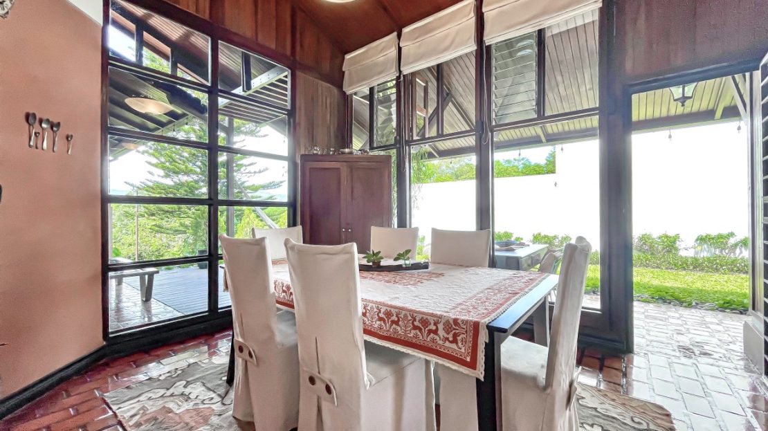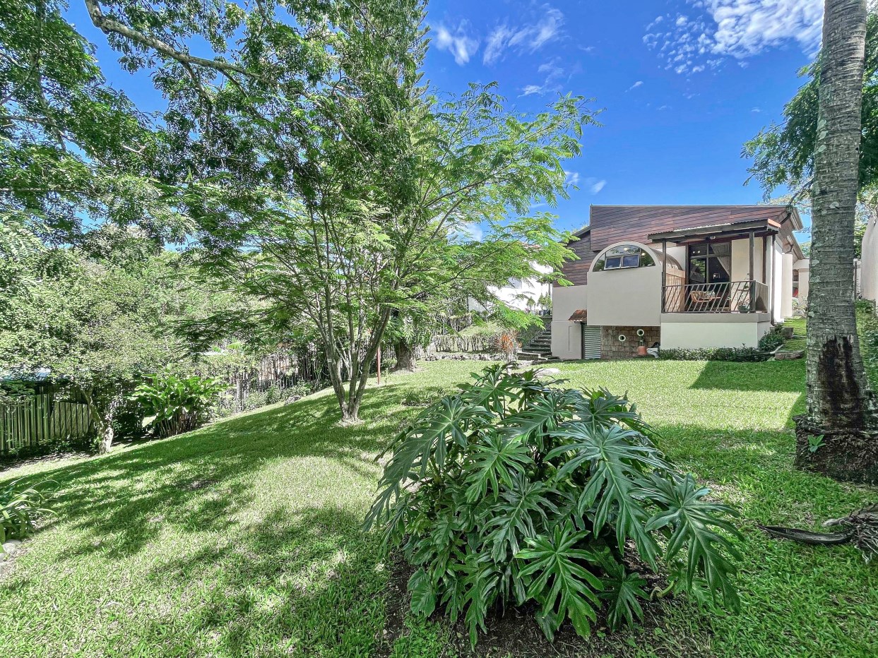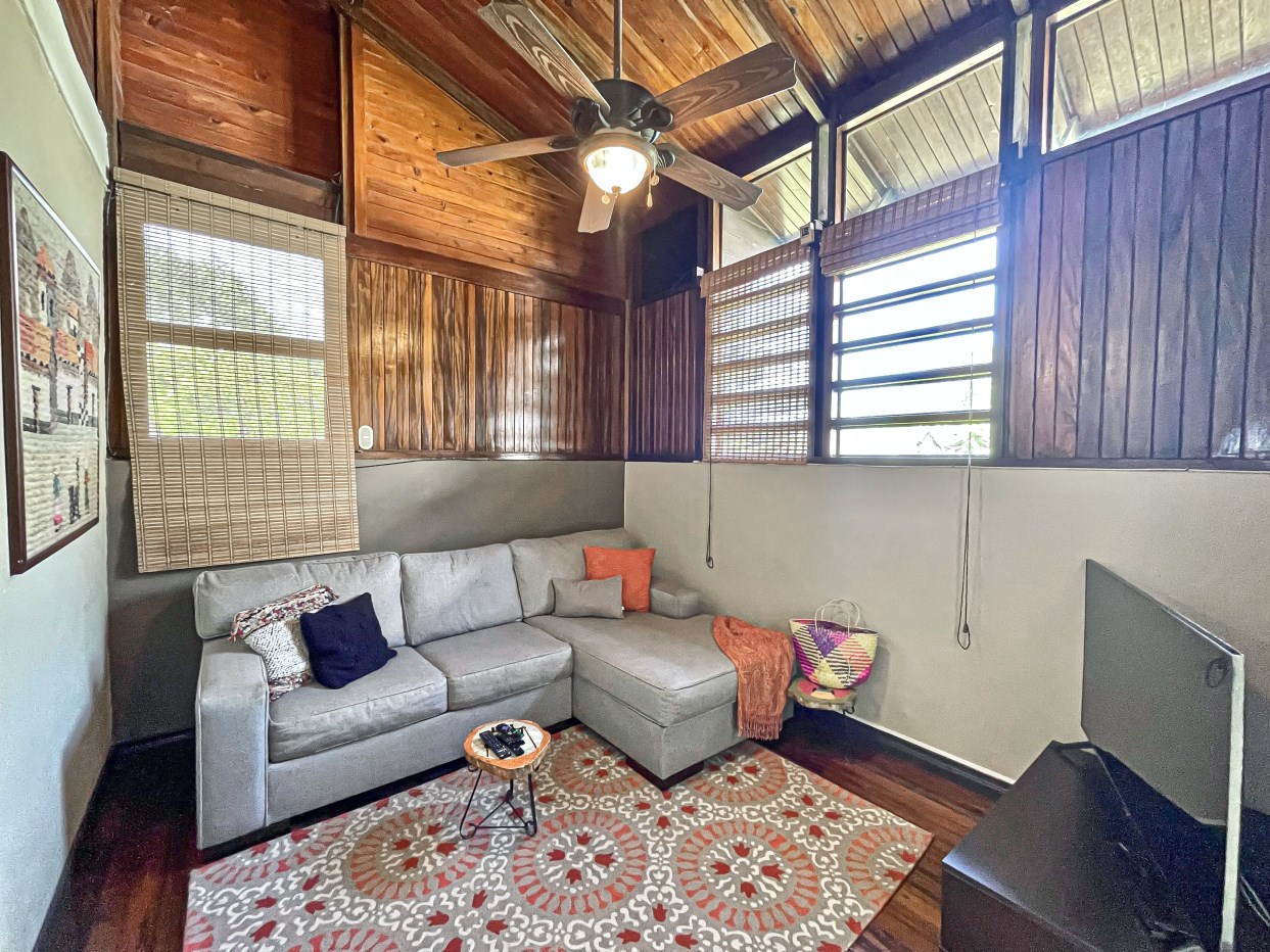 As you enter the home you are greeted with a welcoming foyer that leads to a living room and dining room boasting glazed brick flooring and a high vaulted ceiling boasting teak wood. The tall windows disperse lots of natural light and both the wood and brick finishes create a warm cozy ambiance. These are all great characteristics of a cozy home. The living and dining room open to a large covered patio boasting lots of space for social events, lounging, and bbq to just lounging in the hammock. This a perfect place for enjoying nature and breakfast to a twilight dinner.