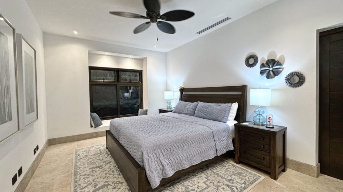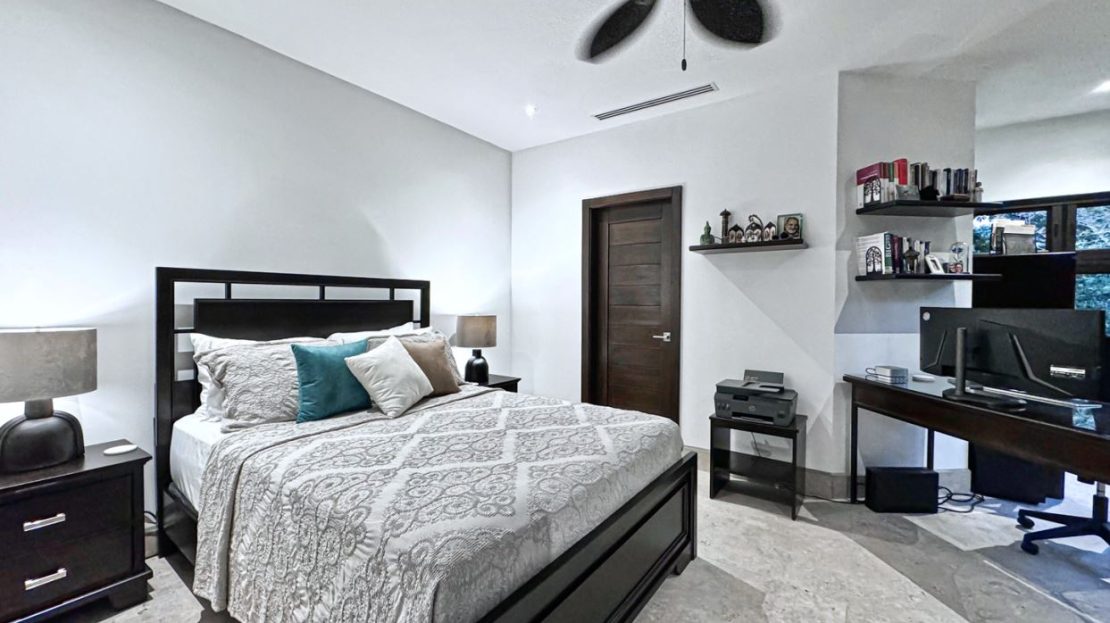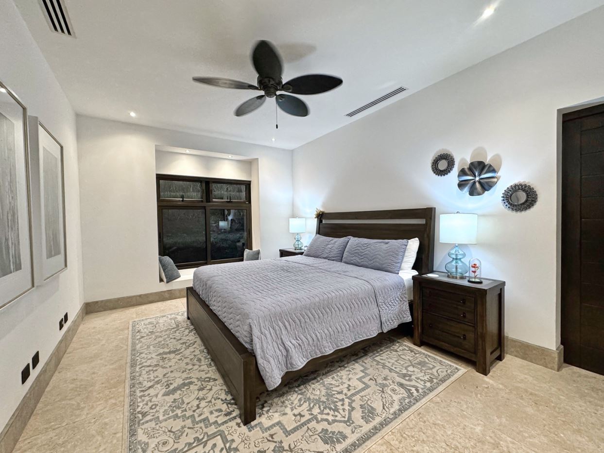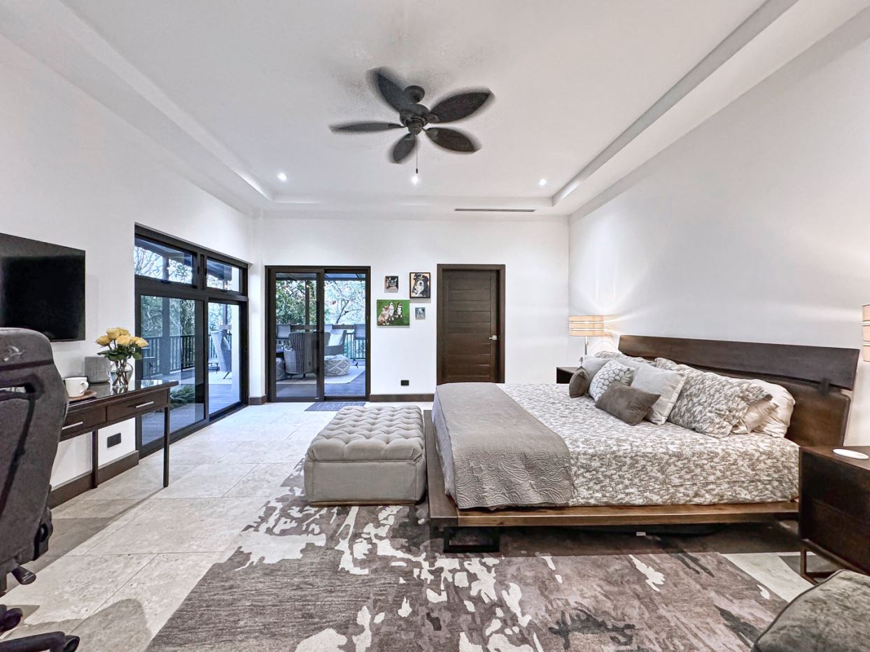 The primary bedroom is exceptionally spacious, easily accommodating a king-size bed along with a lounge area. Glass sliding doors open directly onto the outdoor terrace with beautiful garden views. The ensuite bathroom includes a walk-in shower, jacuzzi tub, and a walk-in closet.