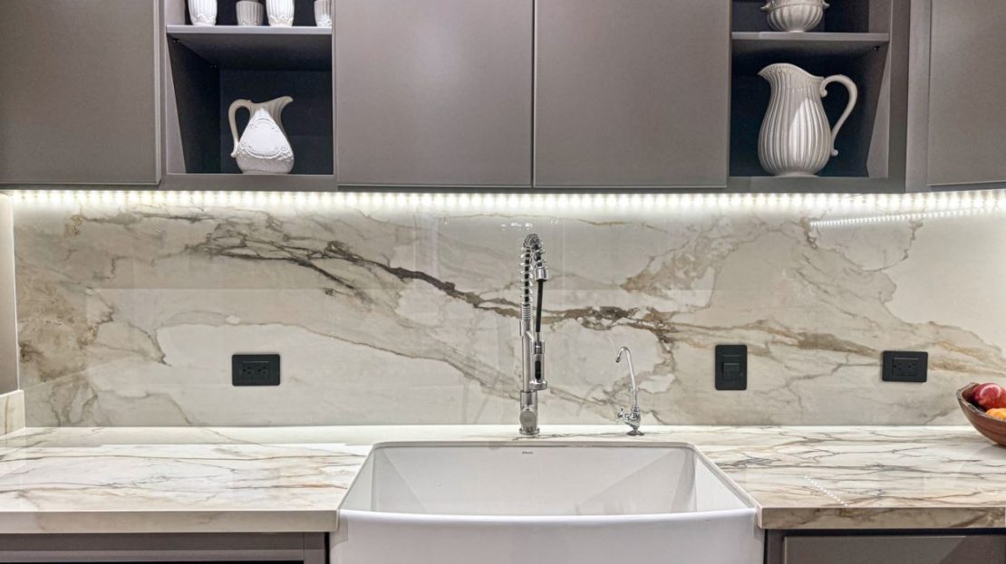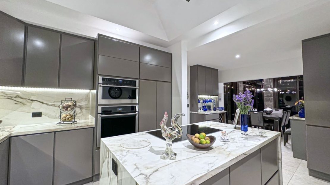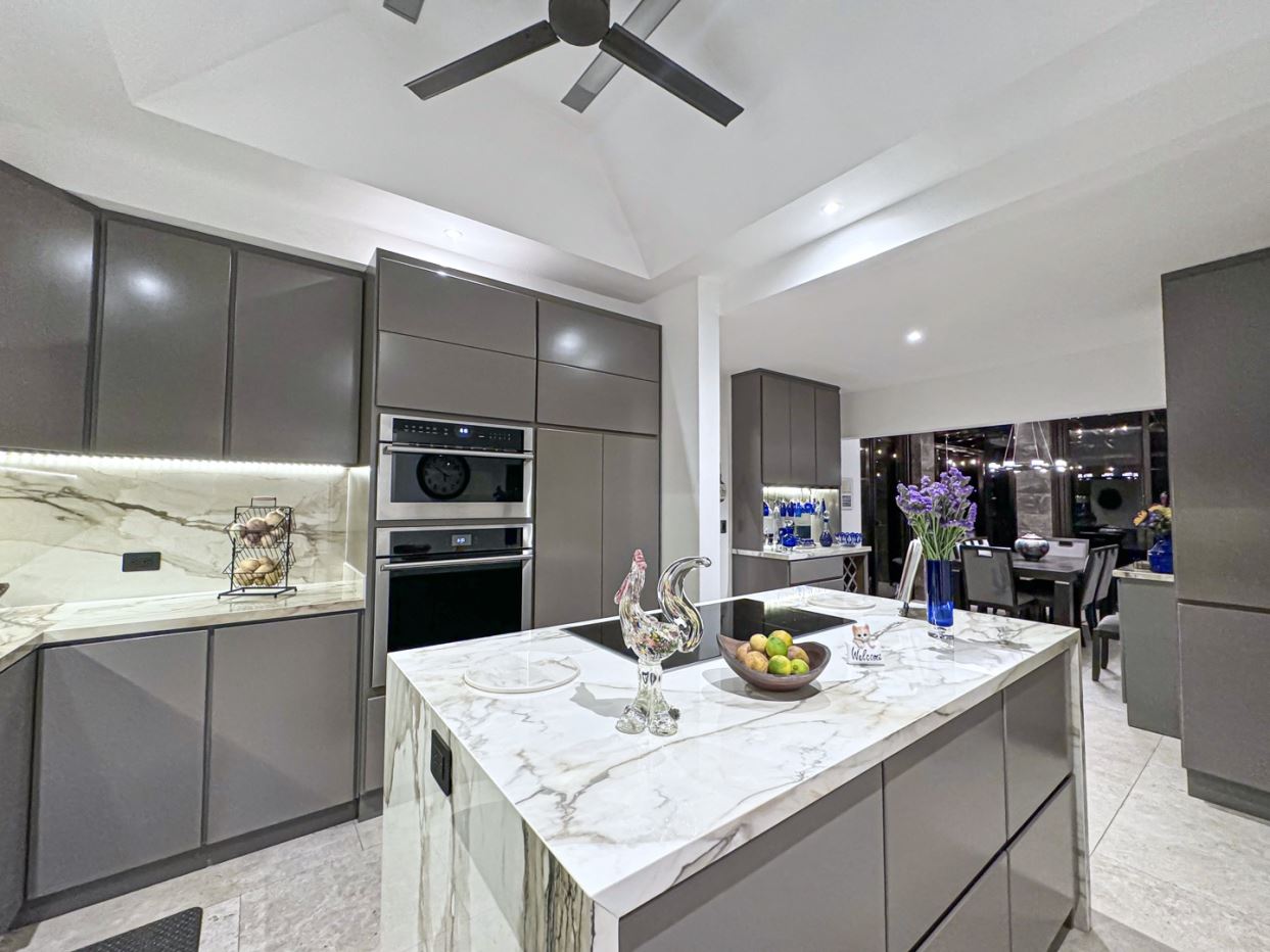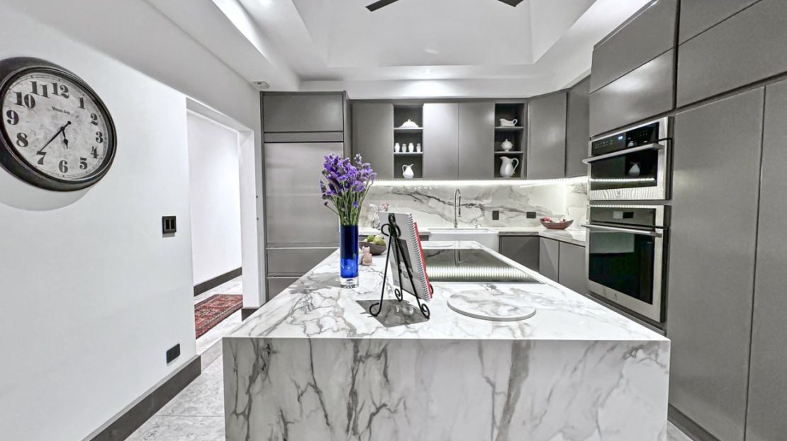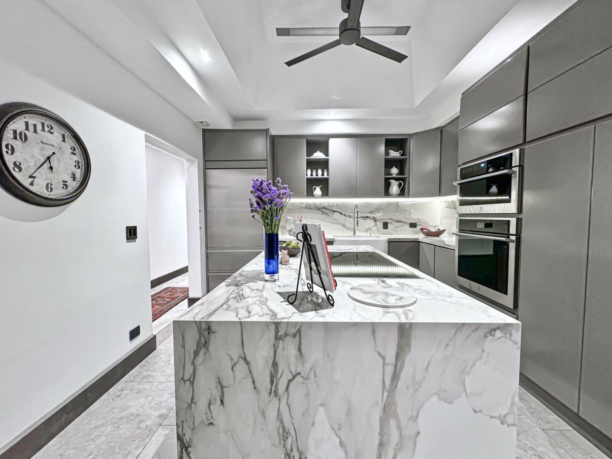 The kitchen features an elegant contemporary design with a central island, farmhouse sink, and ample space for cooking and storage.