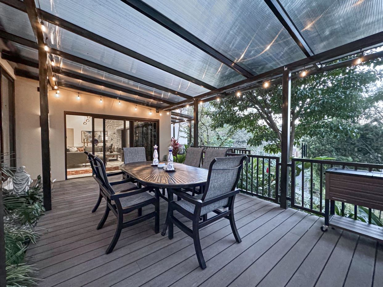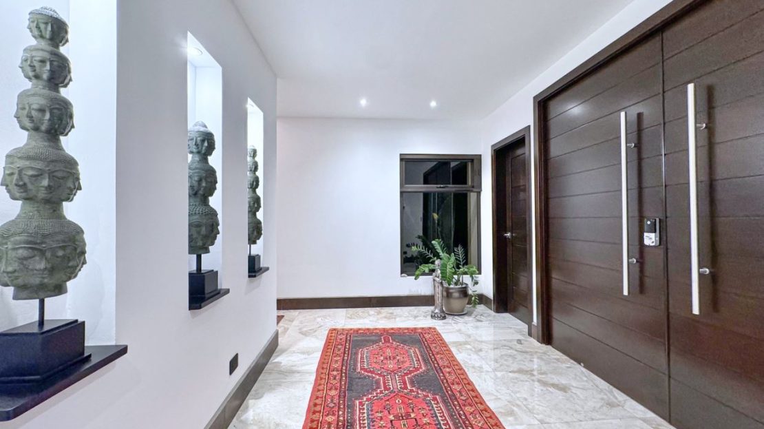 Upon entering through the elegant foyer, the home unfolds into a beautifully balanced layout connecting the living room, dining area, sophisticated kitchen, half bathroom, sleeping quarters with 3 bedrooms, a TV lounge, garage and a maid’s room. Framed by glass sliding doors and a vaulted ceiling with designer pendant lighting, the living and dining spaces transition effortlessly onto a generous covered terrace, creating a seamless indoor–outdoor living experience, with stunning garden and valley views.