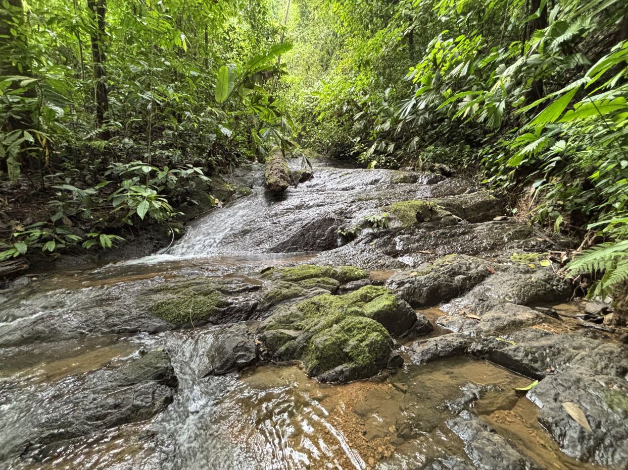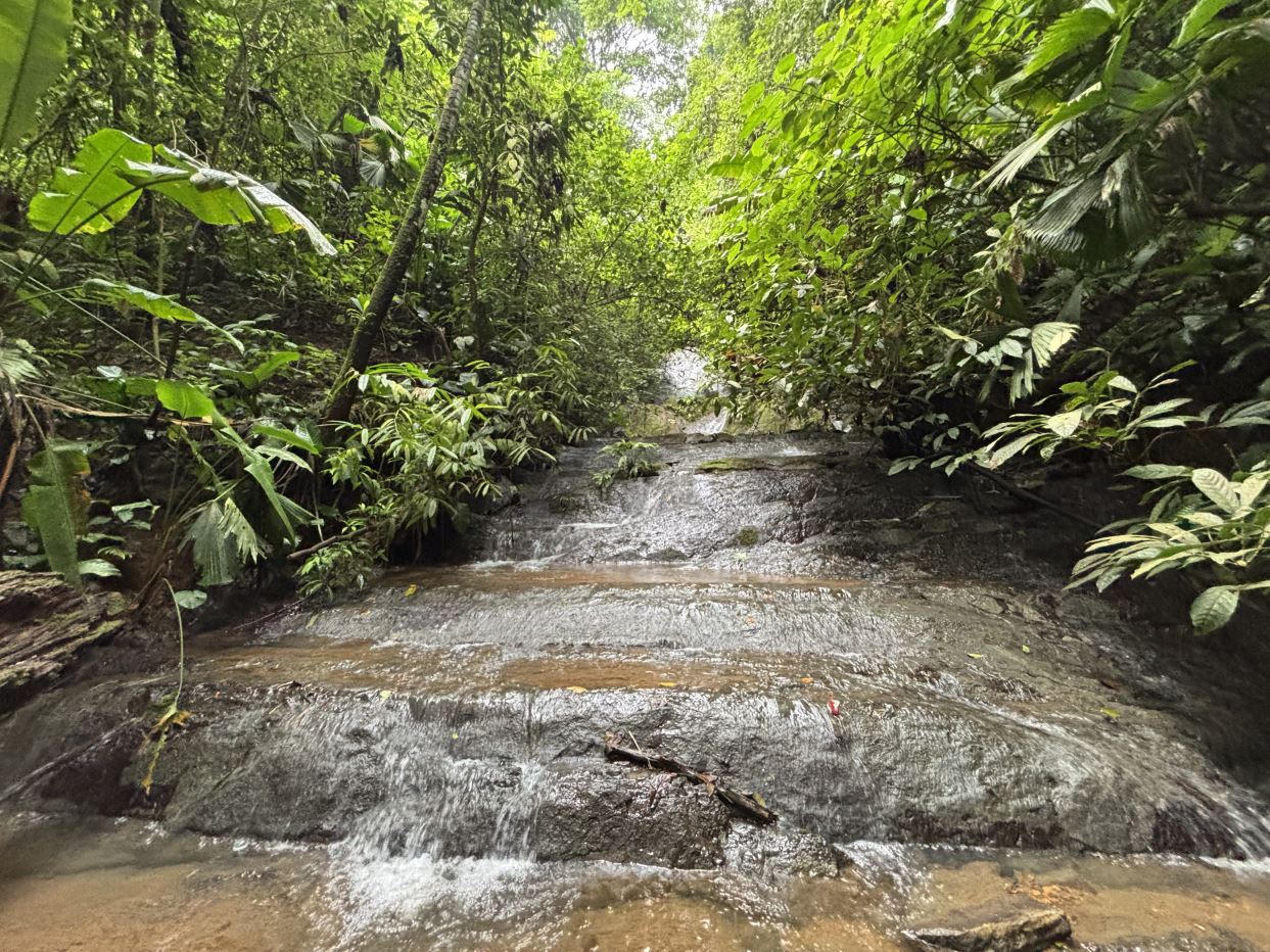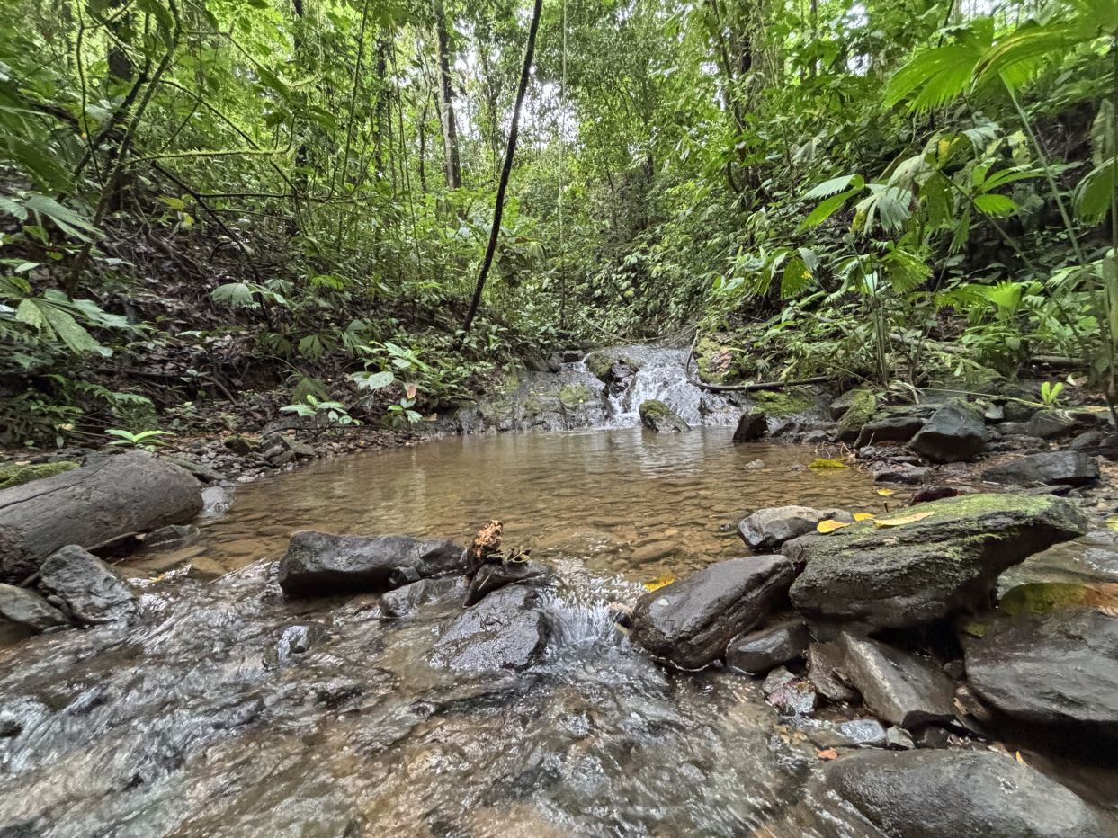 Una pequeña cascada escondida en el bosque invita a meditaciones matutinas, baños refrescantes y caminatas vespertinas bajo la sombra de árboles imponentes. Y aquí, la vida silvestre no es un espectáculo ocasional—es parte del paisaje cotidiano. Mariposas morfo azules moviéndose entre los rayos del sol, monos jugando en el dosel, iguanas calentándose sobre las rocas, y el destello rojo de las lapas cuando el cielo se abre después de la lluvia.