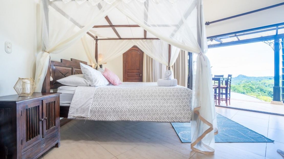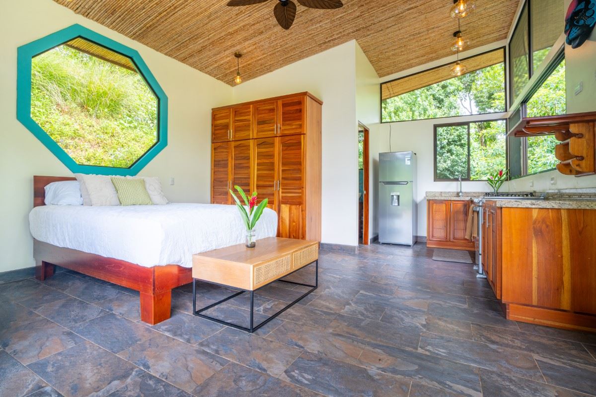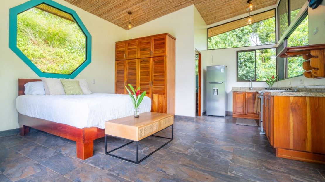 THE 1-BEDROOM CASITA This new construction is decked out with granite countertops and beautiful custom-made wood cabinetry. This cozy cabina features floor to ceiling screens, taking advantage of the cool breezes available at this altitude. It offers sweeping mountain views and is bordered, on two sides, by towering jungles and a nearby burbling rainforest creek.