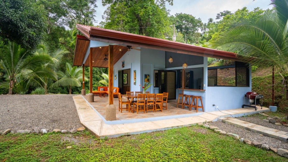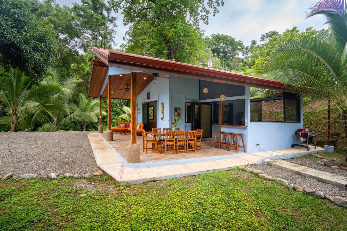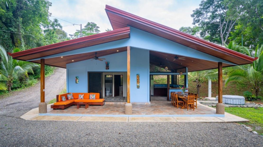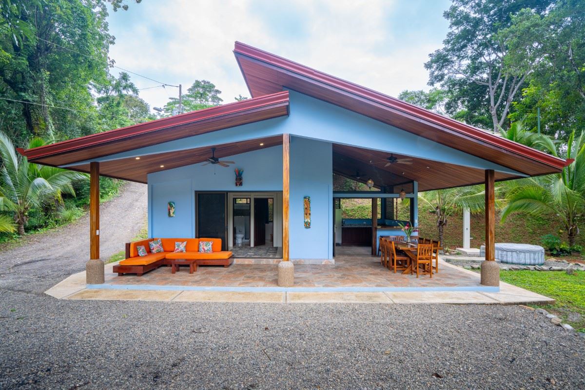 THE 2-BEDROOM HOUSE This new house features a bedroom with a loft, large open-air screened-in kitchen, beautiful covered patio living and dining areas and a large backyard with a jacuzzi and outdoor shower – plus plenty of parking or playroom up front. The interior is finished with real wood ceilings, granite countertops, handsome earth tone tile and quality appliances including a gas stove and electric oven. Views stretch across the towering jungle-covered coastal mountains.