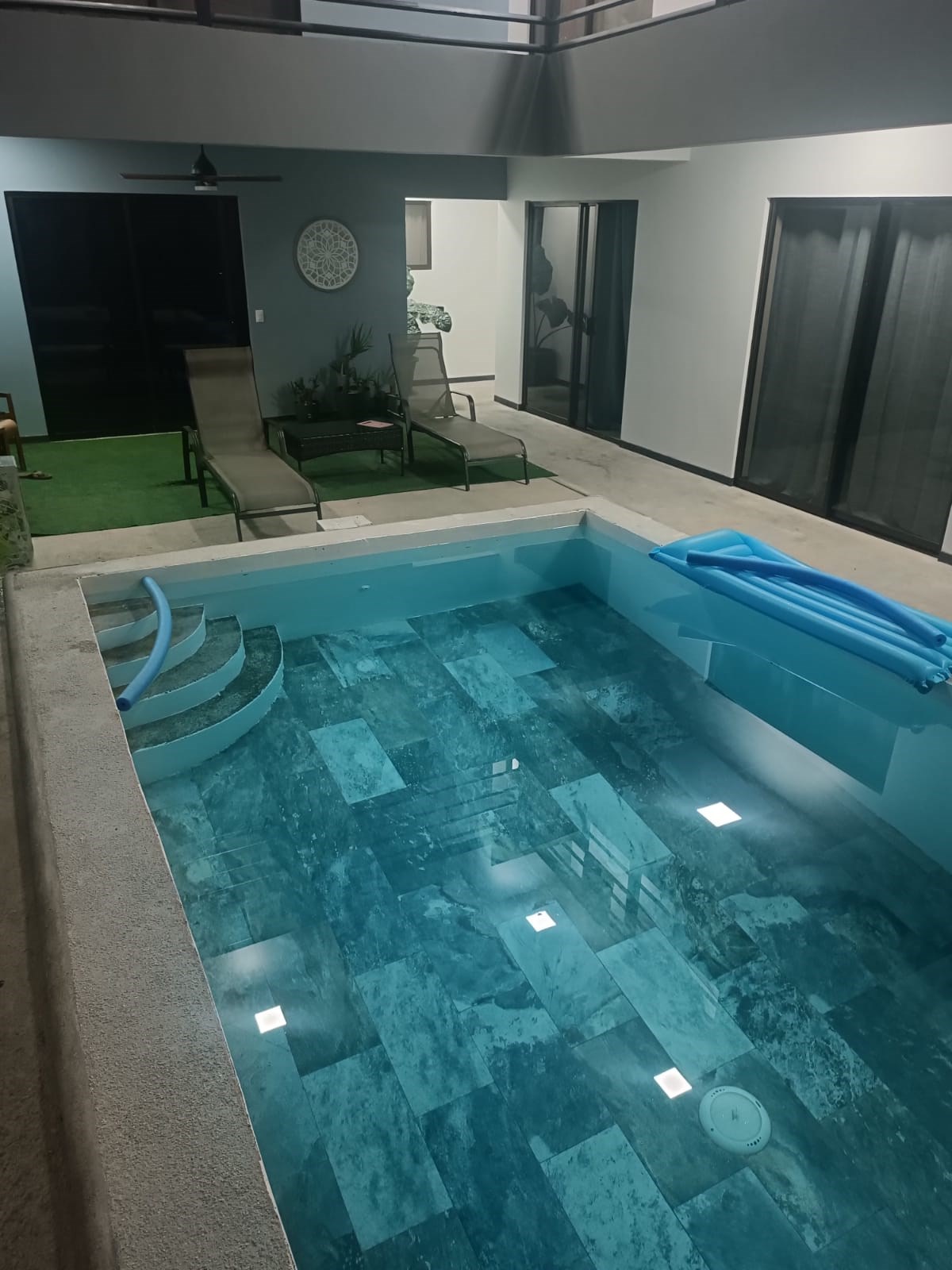 A gated property with 3 two-bedroom apartments and a studio. Each bedroom has a private bathroom, and amenities include a swimming pool, laundry room, and parking area.
