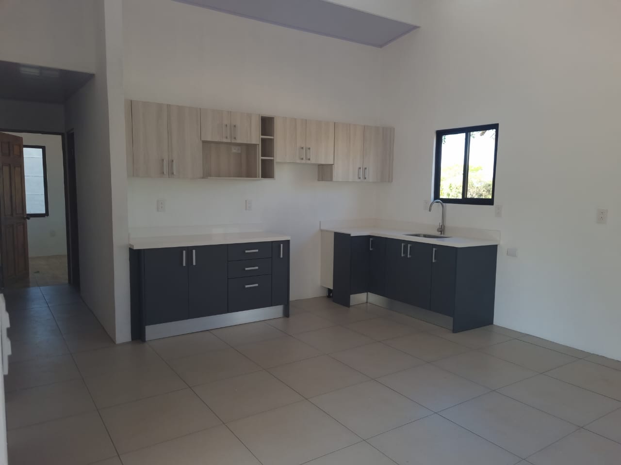 Los muebles de la cocina están hechos de MDF hidrofóbico y sobre cuarzo.