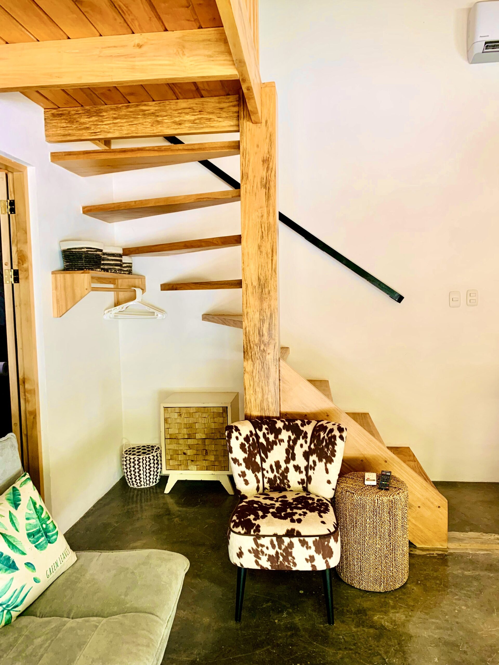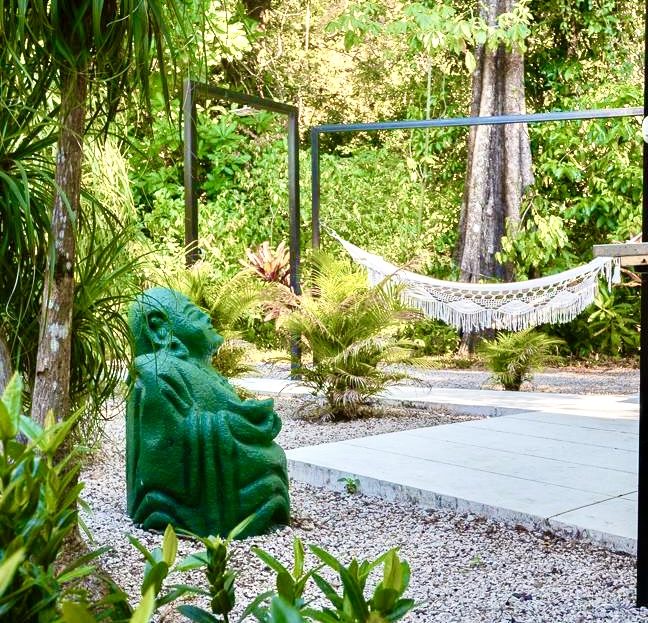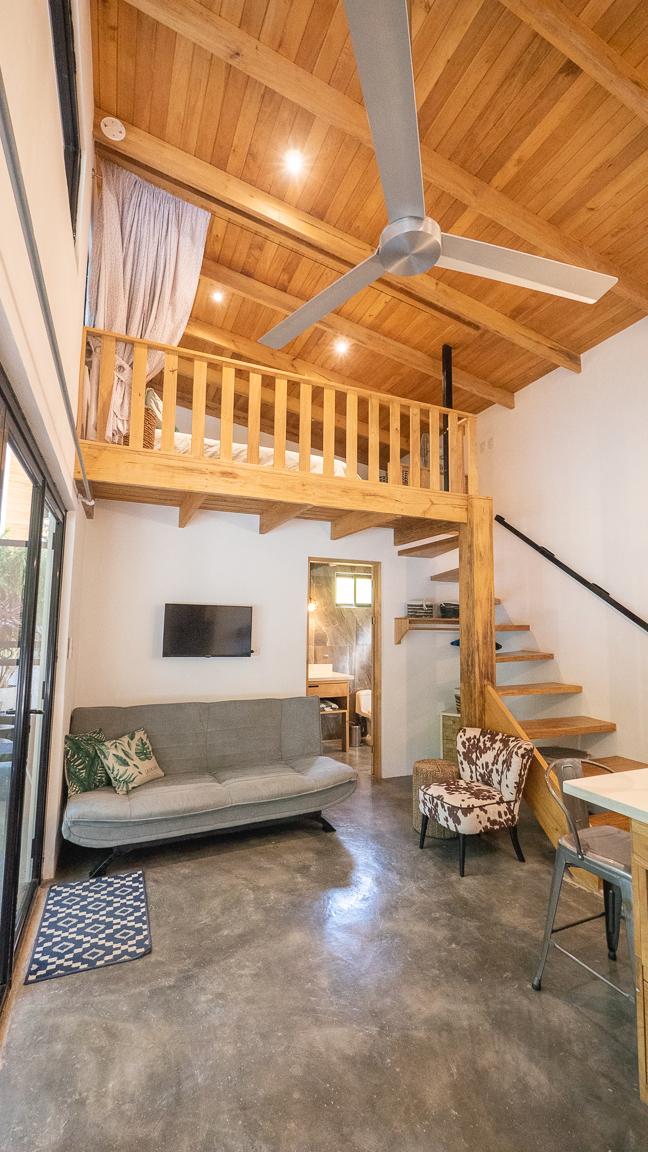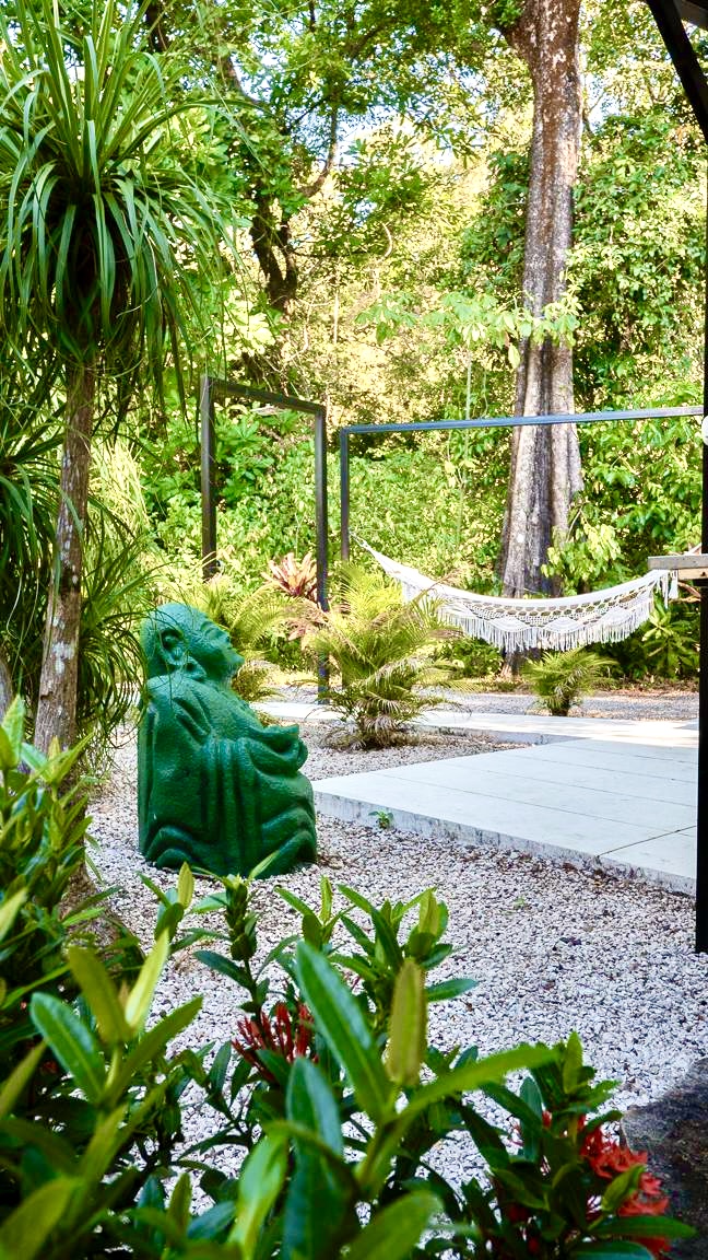 Outside, the magic continues. Meandering garden paths lead you to a sparkling pool that’s perfect for cooling off on sunny afternoons, a cozy fire pit ideal for starlit evenings, and hidden lounging areas tucked under the shade of towering trees. At the far edge of the property, the gentle murmur of the river sets the soundtrack for your days, while monkeys swing overhead and parrots call from the canopy—your own slice of Costa Rica’s wildlife right at home.