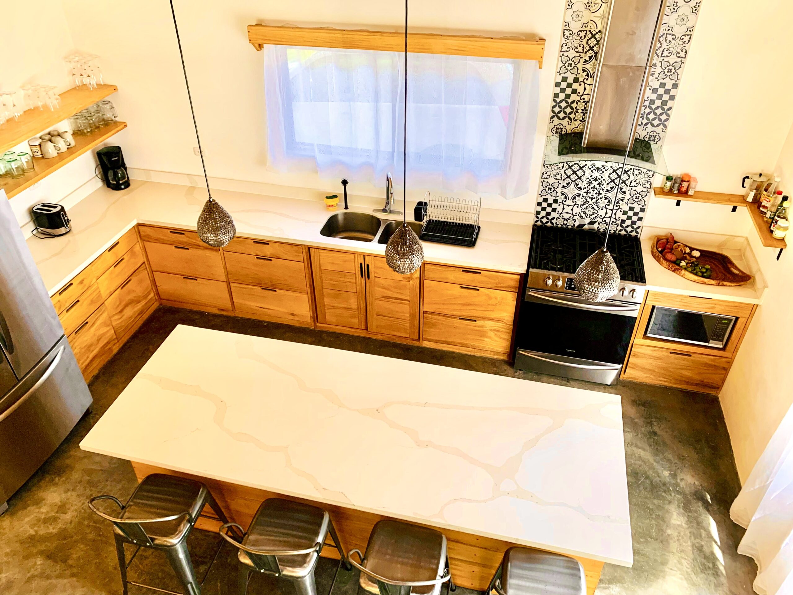 The main house welcomes you with airy, light-filled living spaces framed by expansive glass walls that dissolve the boundaries between indoors and out. Inside, you’ll find three serene bedrooms and two sleek bathrooms, each designed with both style and comfort in mind. The kitchen is a cook’s dream, with clean lines, quality appliances, and a central island that invites gatherings with family and friends. An inviting loft offers an additional nook for guests, an office, or a peaceful reading hideaway.