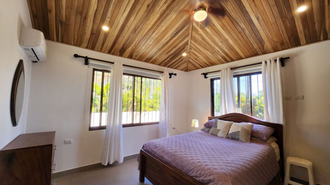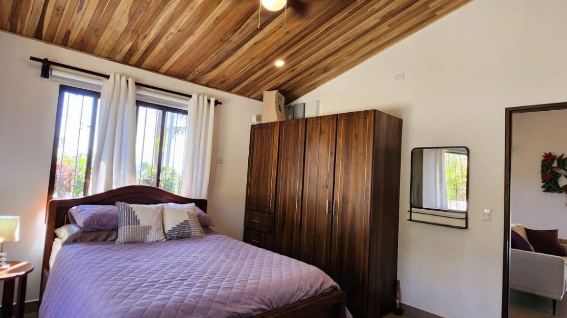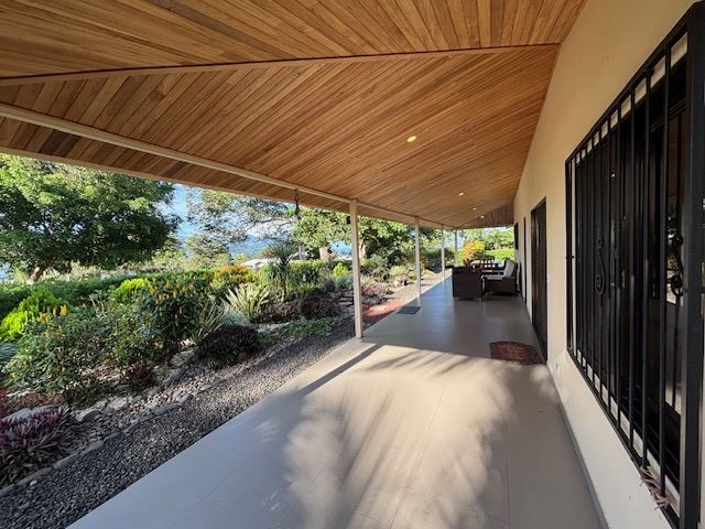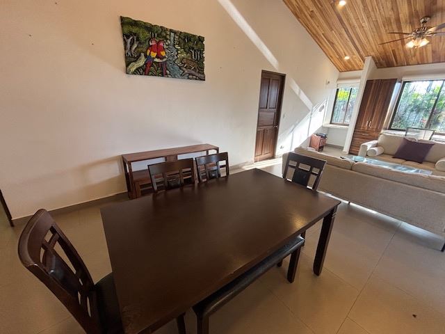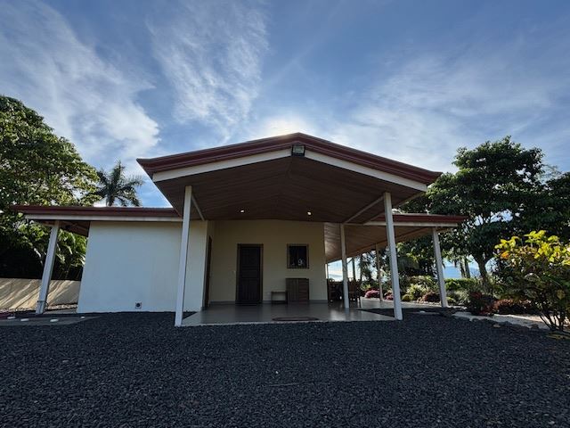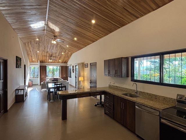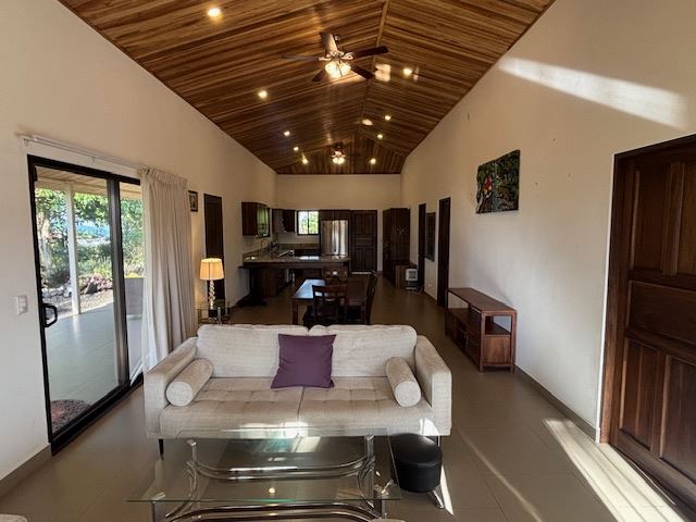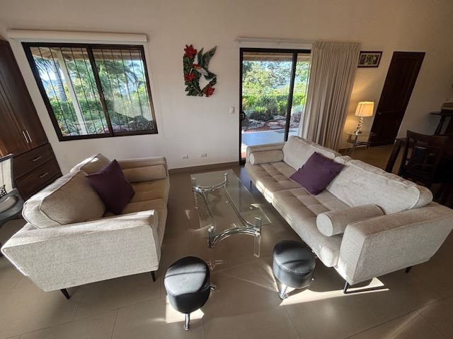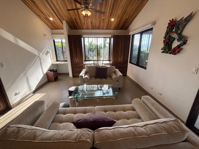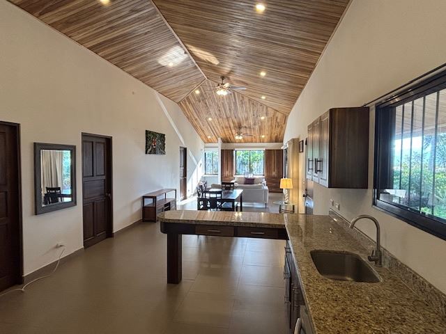 Nicely designed custom built home in a countryside setting features big mountain views with some city views in the Atenas-based gated community of Vistas Al Rio Grande, located 15 minutes from Atenas Center and just as far from the new highway 27. The furnished and turn-key home showcases an open floor plan with a large living and dining area with an adjacent custom-buit office area making it easy to work from home. The kitchen features like new appliances throughout. The formal entry leads to a guest bedroom and a jack and jill guest bathroom that leads to the second guest room. Towards the opposite end of the home one finds an ample master bedroom and bathroom suit with plenty of closet areas. There is custom woodwork throughout the ample kitchen, bathrooms, wooden doors and the tall artesenal wood worked ceilings.