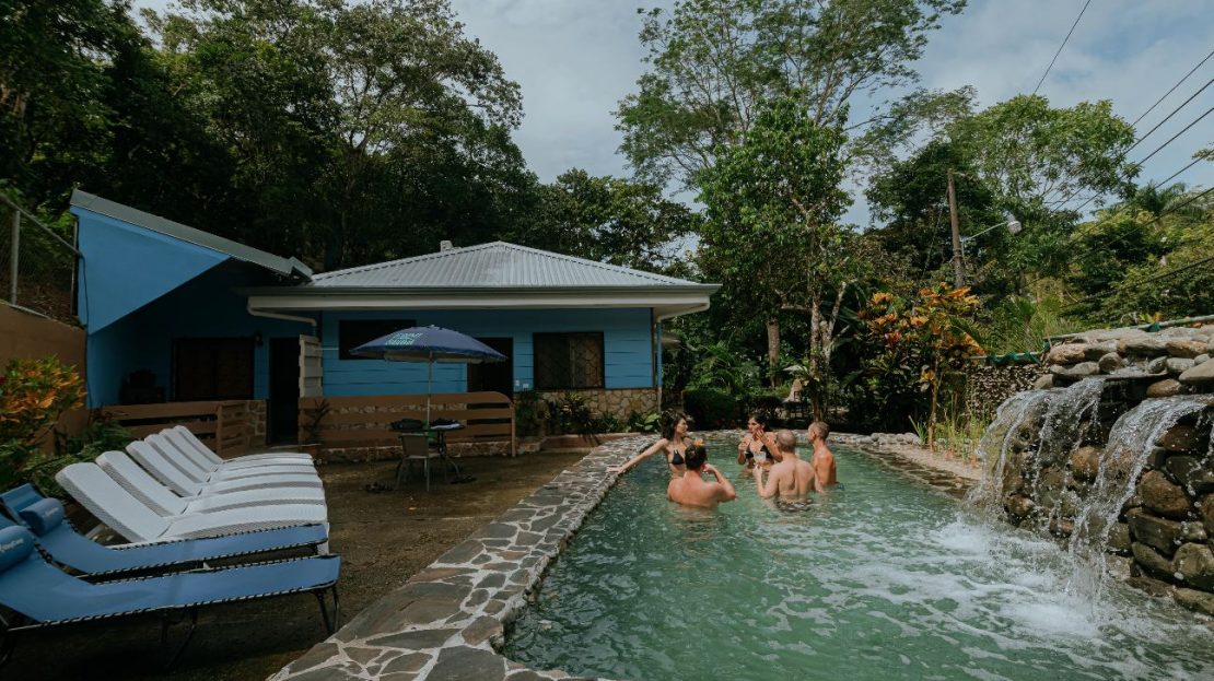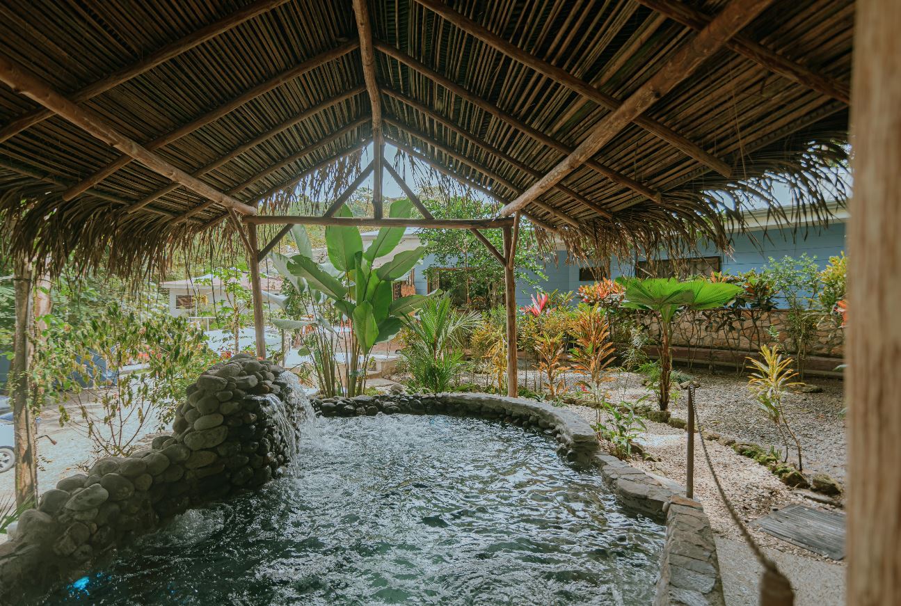 A natural stone pool with a waterfall feature, surrounded by lush jungle.