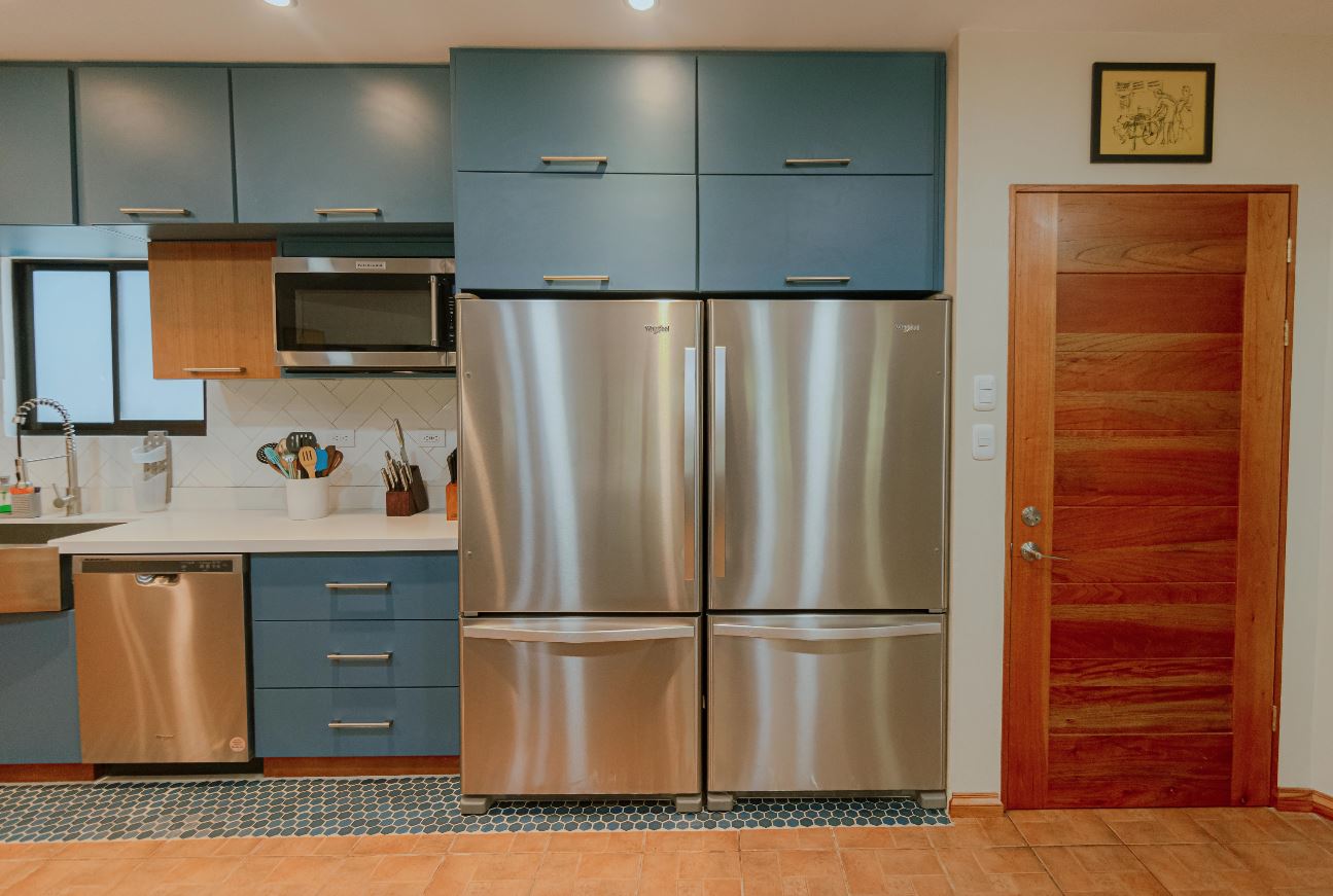 Two stoves, propane range, high-powered espresso machine, built-in refrigerators, pantry fridge, and dishwasher.