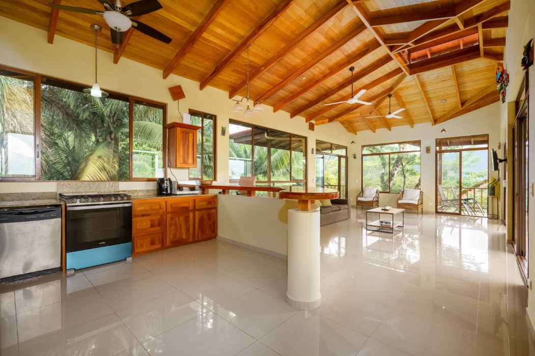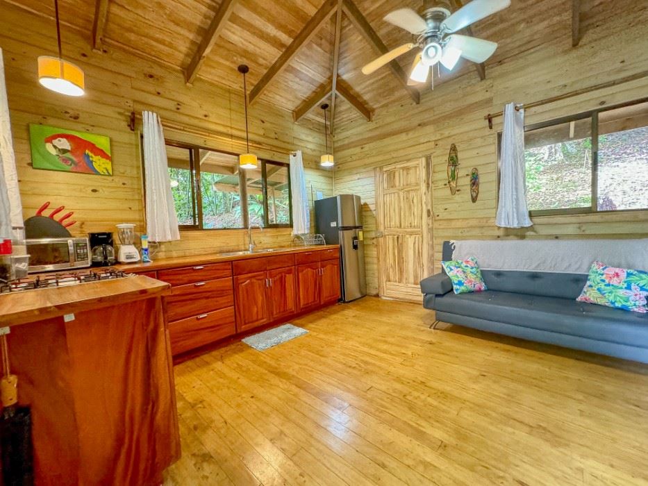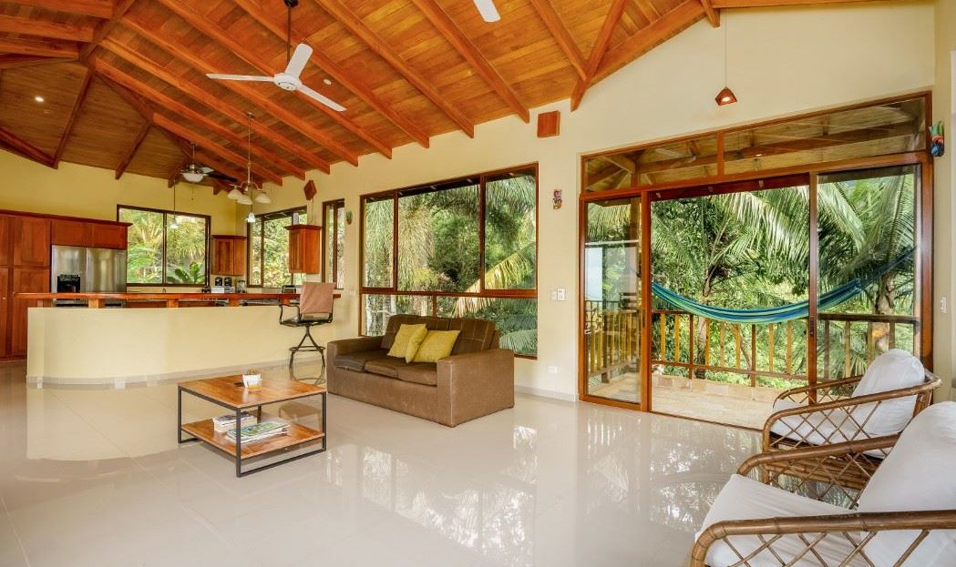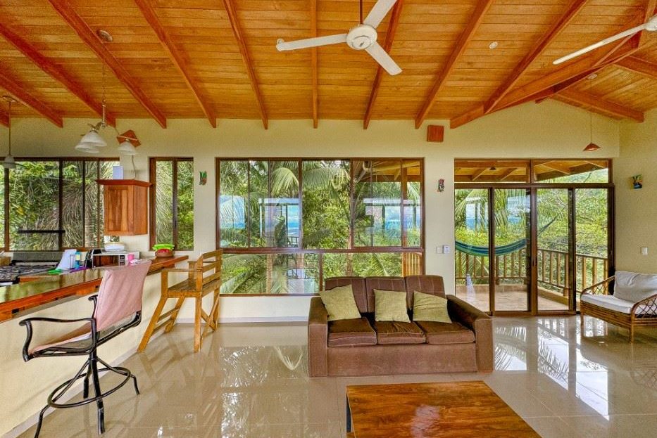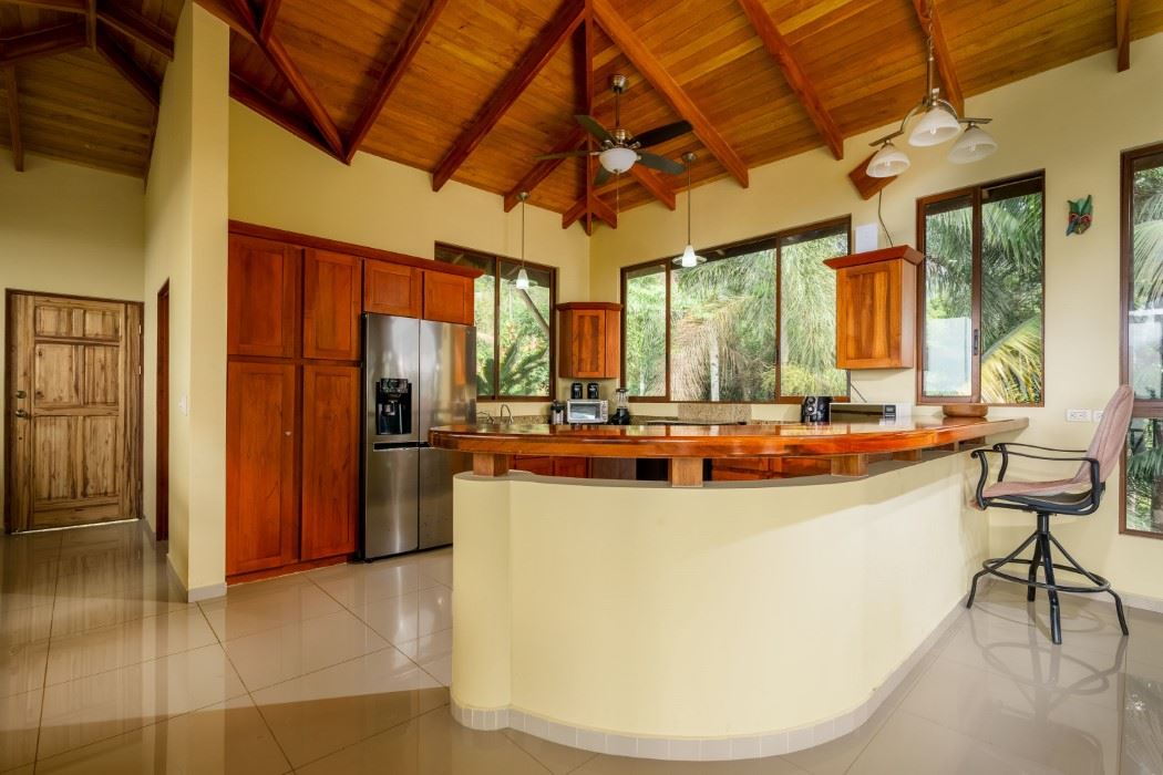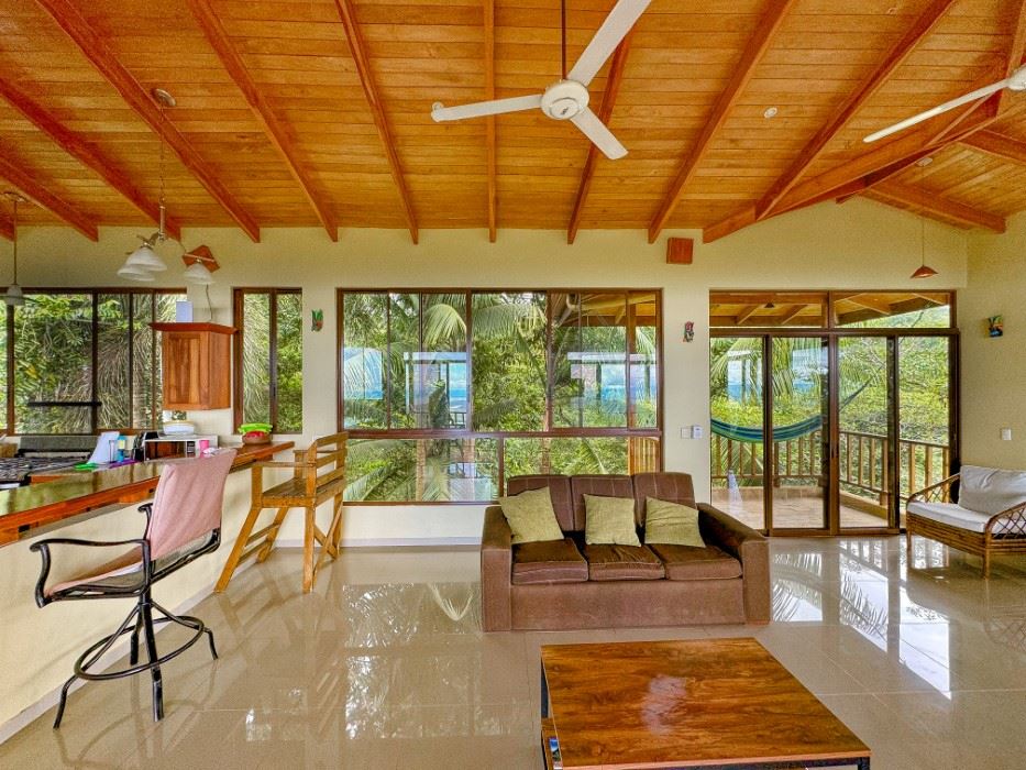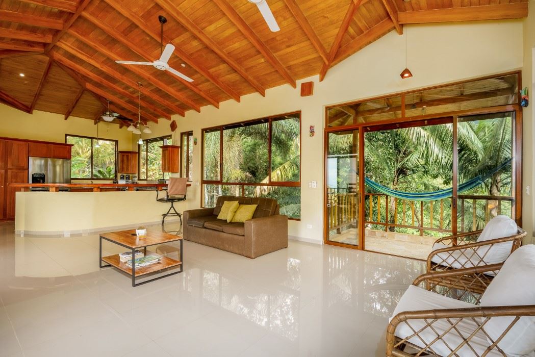 MAIN HOUSE The house is entered via the top floor (via the car-park) or the bottom floor (via the front gate). The top floor holds an open-concept kitchen and living area including a breakfast bar, as well as a bathroom. The kitchen is large, spacious, and fully equipped while the living area lazily sprawls over most of the floor-space. Beautiful, soaring timber vault ceilings & skylight elevate and animate the house while enormous windows and patio doors bring in natural light and the stunning jungle, mountain and ocean views that grace the space from every direction.