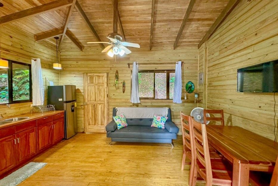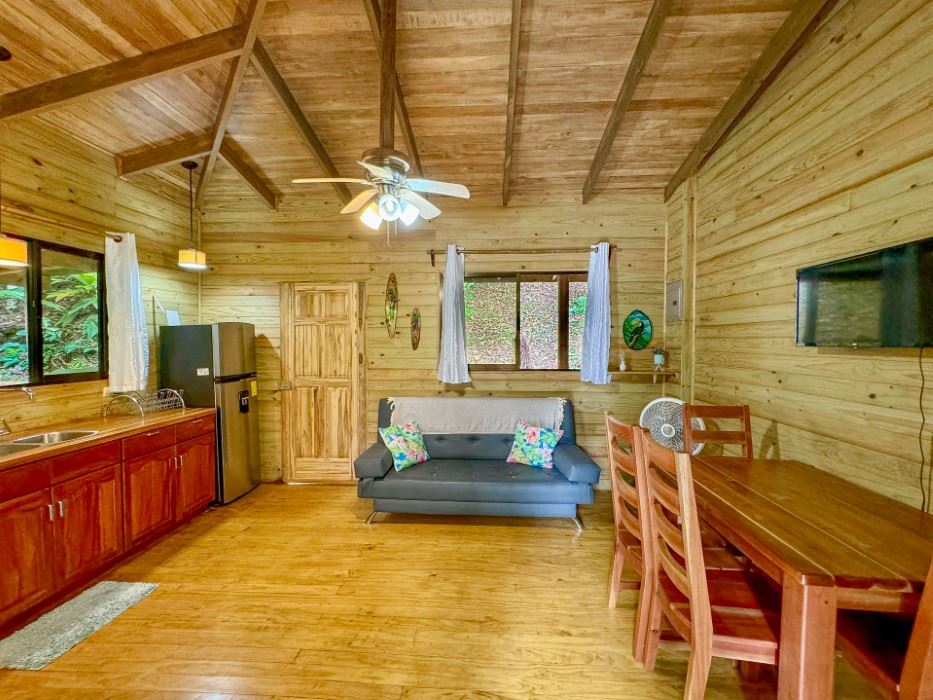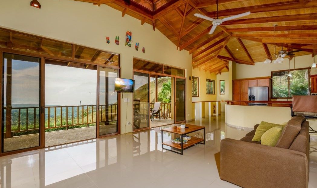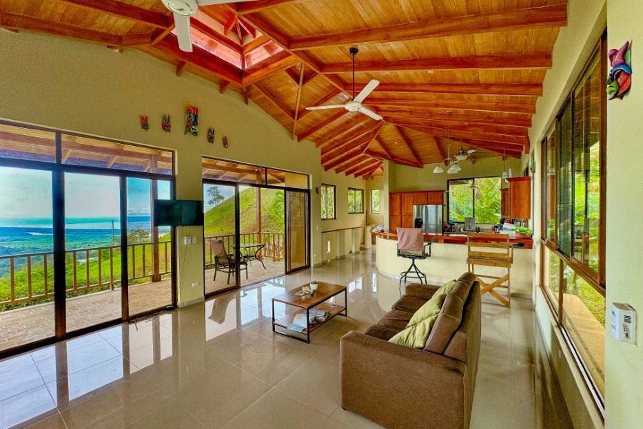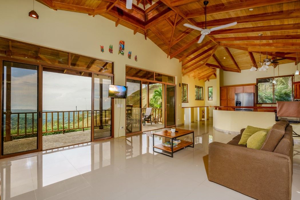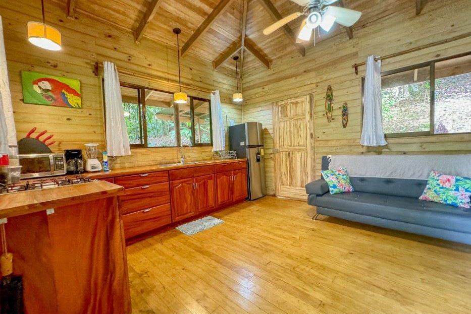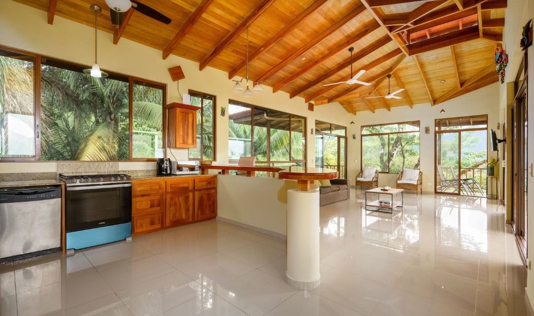 MAIN HOUSE The house is entered via the top floor (via the car-park) or the bottom floor (via the front gate). The top floor holds an open-concept kitchen and living area including a breakfast bar, as well as a bathroom. The kitchen is large, spacious, and fully equipped while the living area lazily sprawls over most of the floor-space. Beautiful, soaring timber vault ceilings & skylight elevate and animate the house while enormous windows and patio doors bring in natural light and the stunning jungle, mountain and ocean views that grace the space from every direction.
