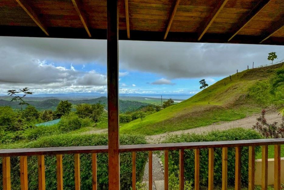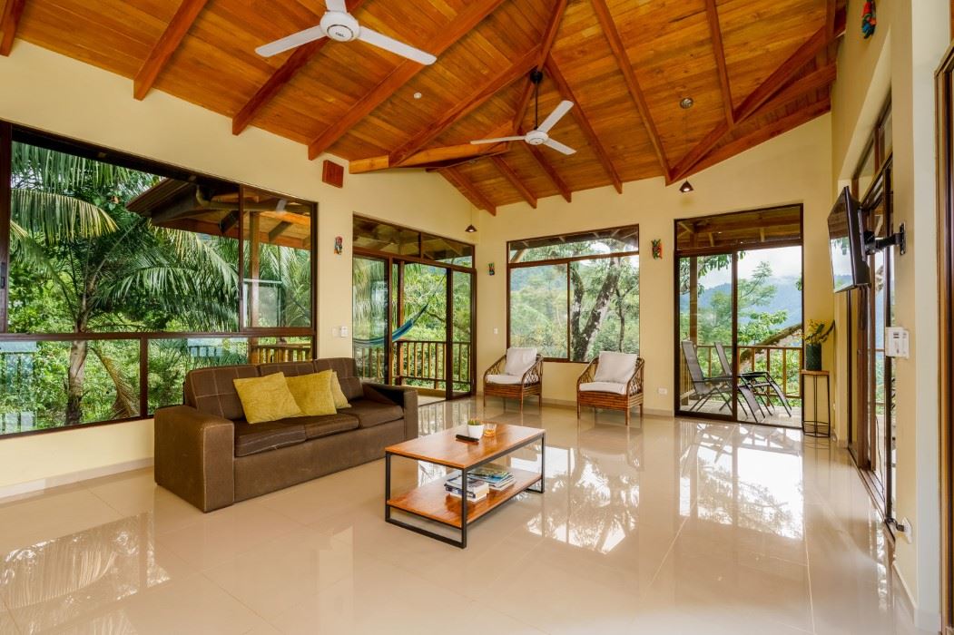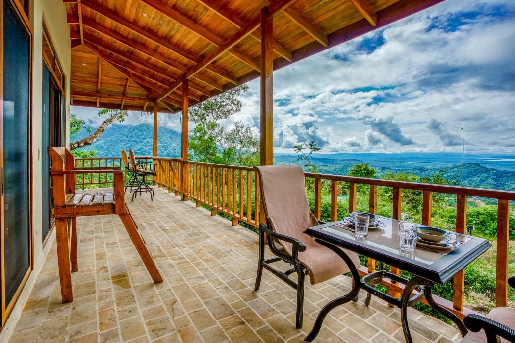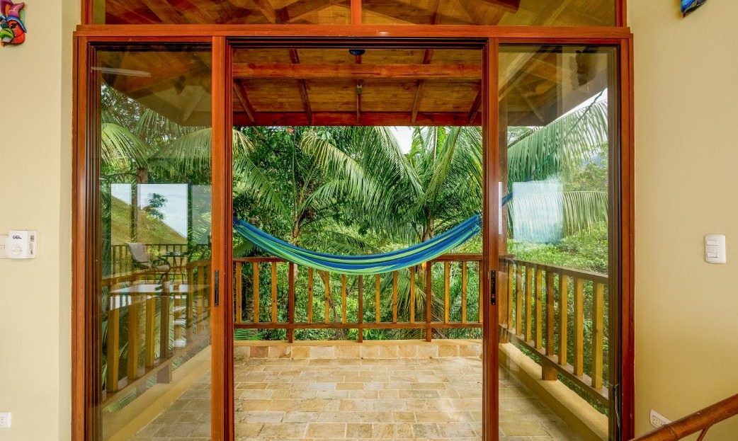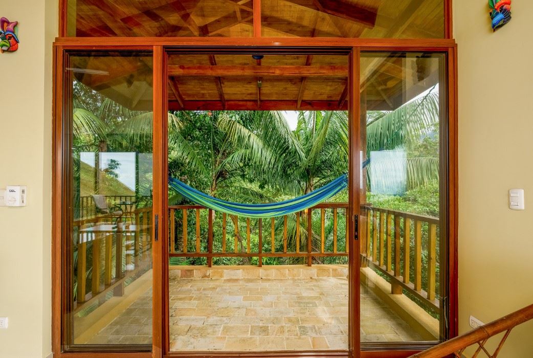 A patio, complete with a hammock, looks onto the tropical jungles and majestic 1,300-meter high coastal mountains while, on the opposite side, a large veranda brings rainforest, palm plantation, cattle-ranch, mangrove, and Pacific Ocean views – including the Térraba -Sierpe Wetlands, Osa Peninsula, Caño Island, Corcovado National Park and the mangrove-maze of the Térraba River Delta. The sunsets are said to be spectacular! Both the patio and veranda are protected by the beautiful timber roof overhangs.