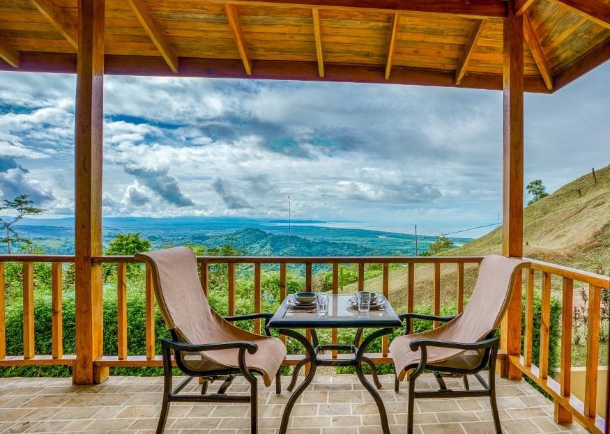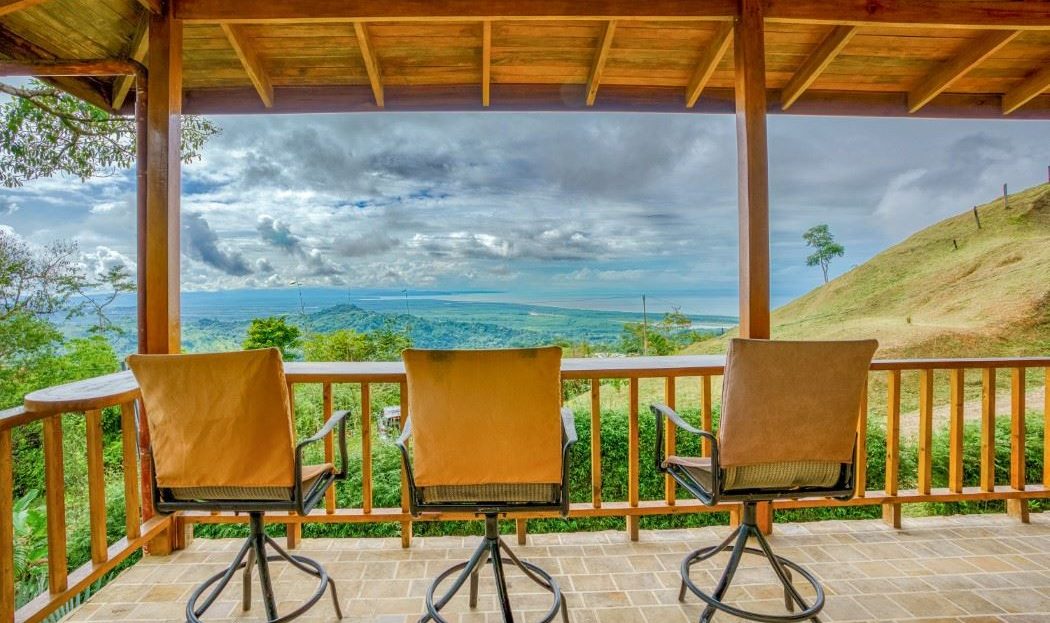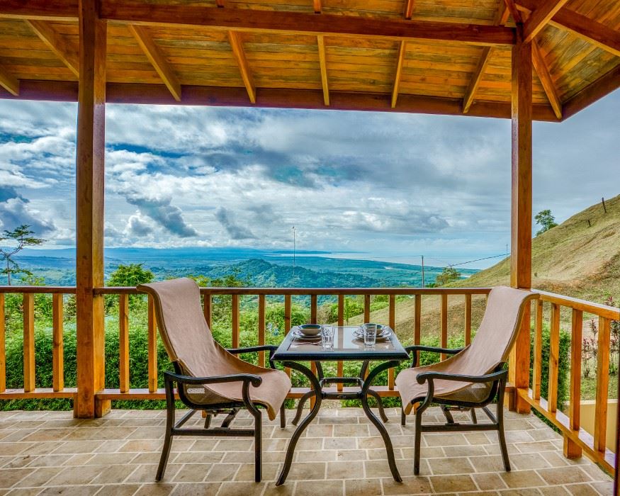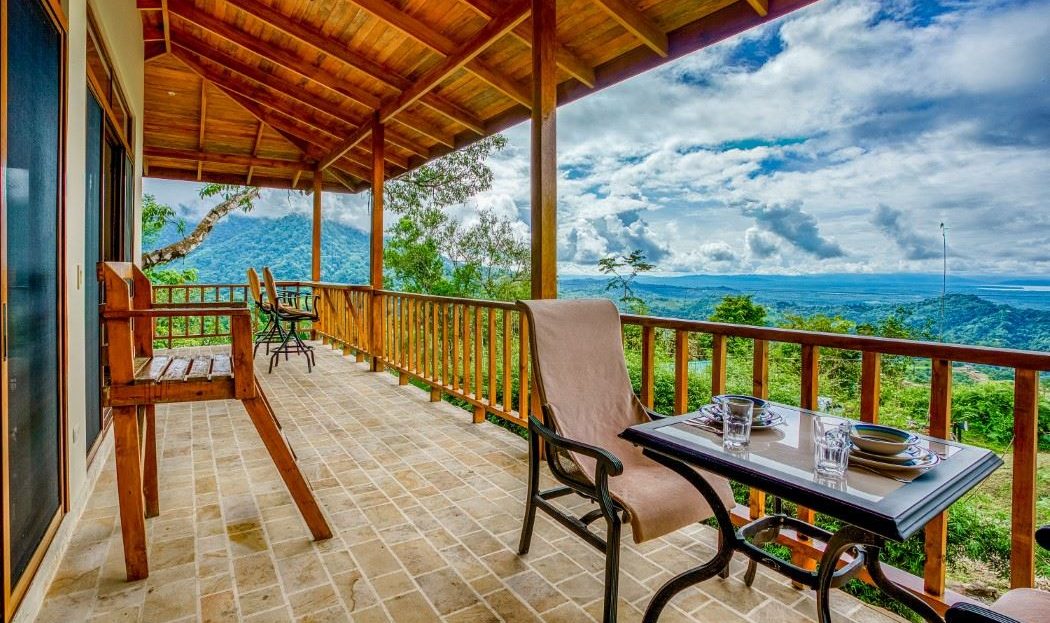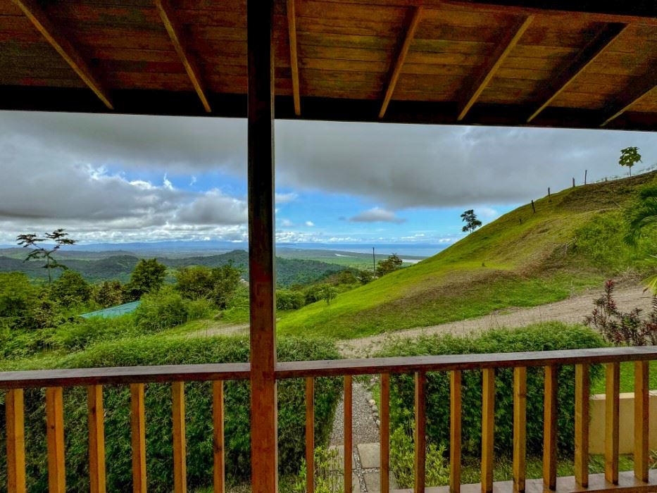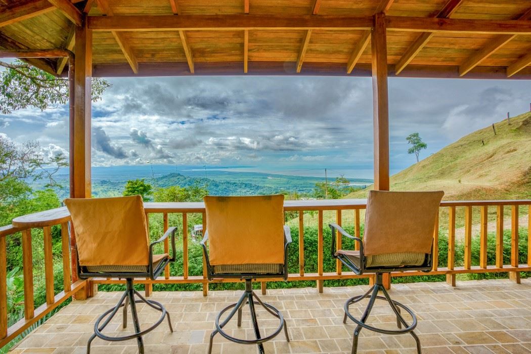 A patio, complete with a hammock, looks onto the tropical jungles and majestic 1,300-meter high coastal mountains while, on the opposite side, a large veranda brings rainforest, palm plantation, cattle-ranch, mangrove, and Pacific Ocean views – including the Térraba -Sierpe Wetlands, Osa Peninsula, Caño Island, Corcovado National Park and the mangrove-maze of the Térraba River Delta. The sunsets are said to be spectacular! Both the patio and veranda are protected by the beautiful timber roof overhangs.