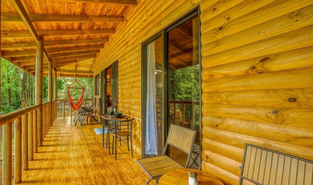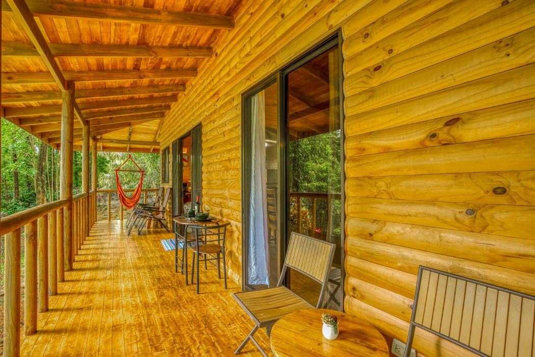 CABIN A short stroll along the lush pathway brings you to the 1-bedroom cabin, a timber masterpiece! Every piece of this structure is made of timber – from the veranda floorboards to the walls, doors, bed-frames and ceilings. Beautiful timber cabinets, tables and furniture add to the feelings of warmth and relaxation. The floor space is split between a large kitchen / dining / living area and a single bedroom. A bathroom with a shower sits at the far end of the cabin, a separate space under the same roof. 360-degree wrap-around veranda, under the overhanging timber roof, reminds of the long-gone old-world charm.