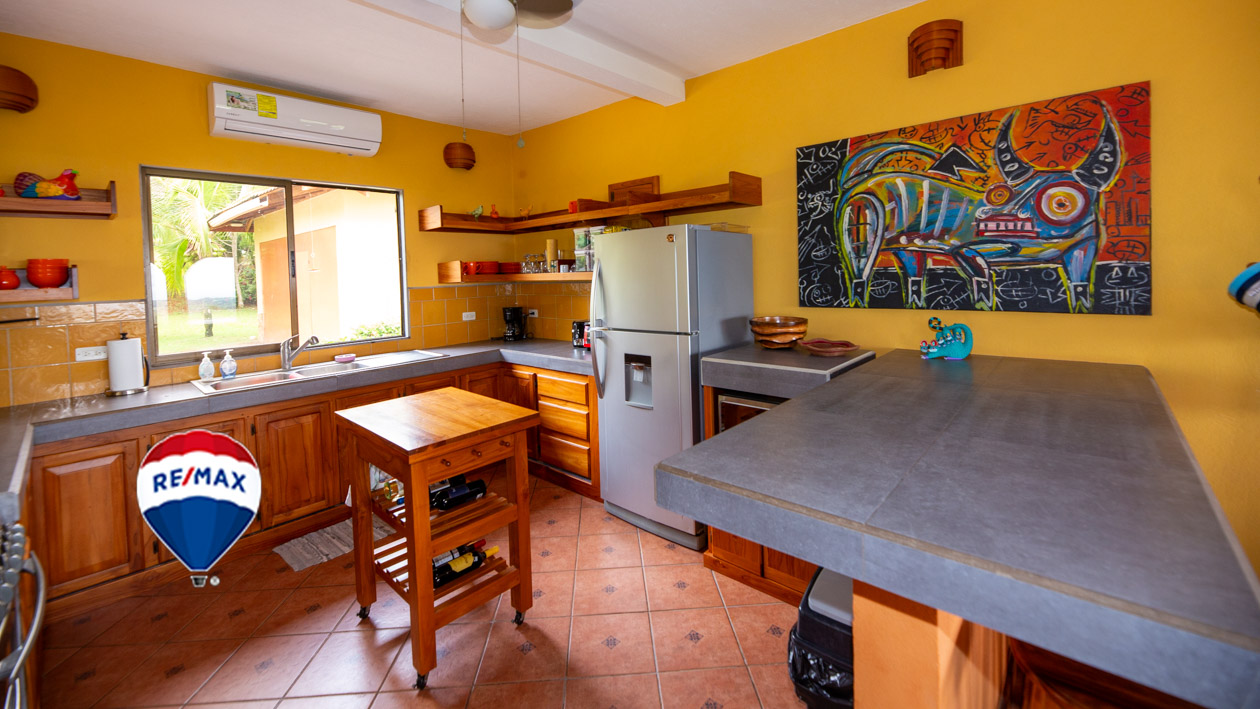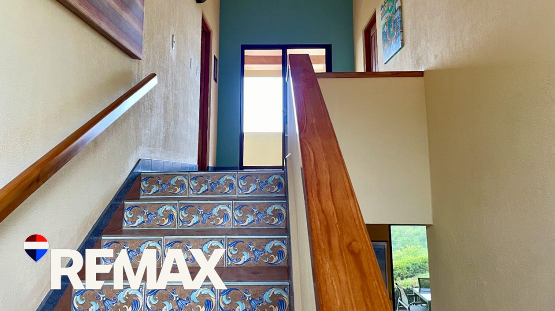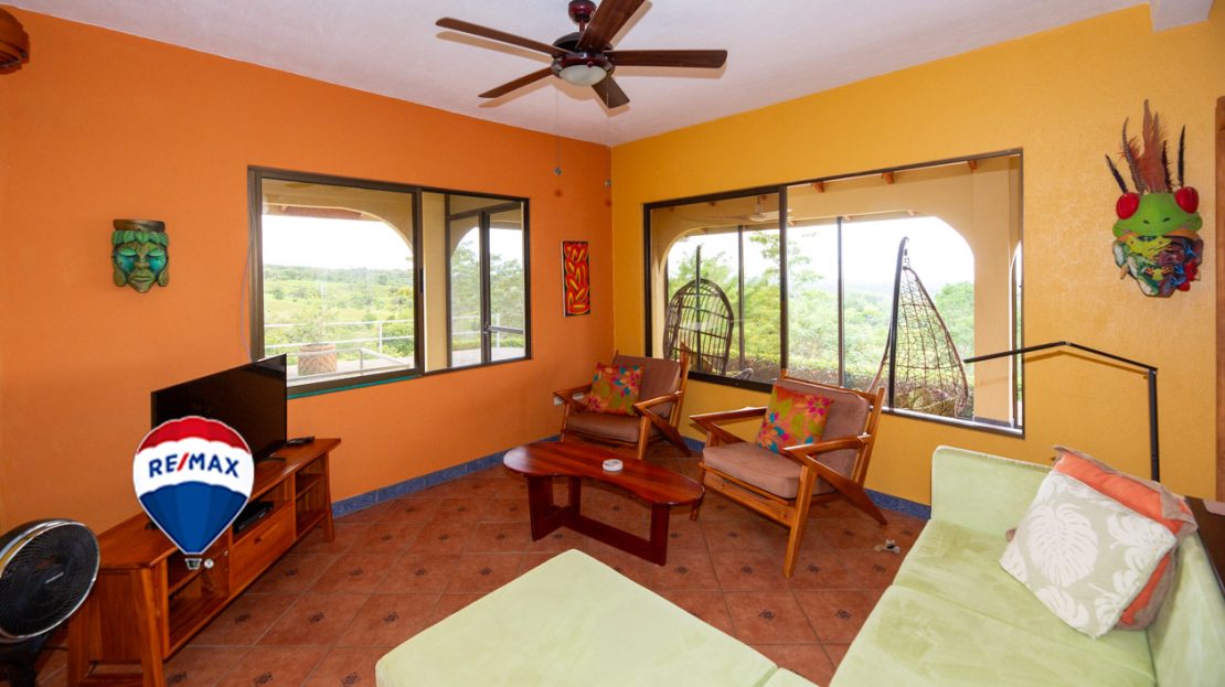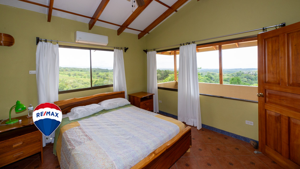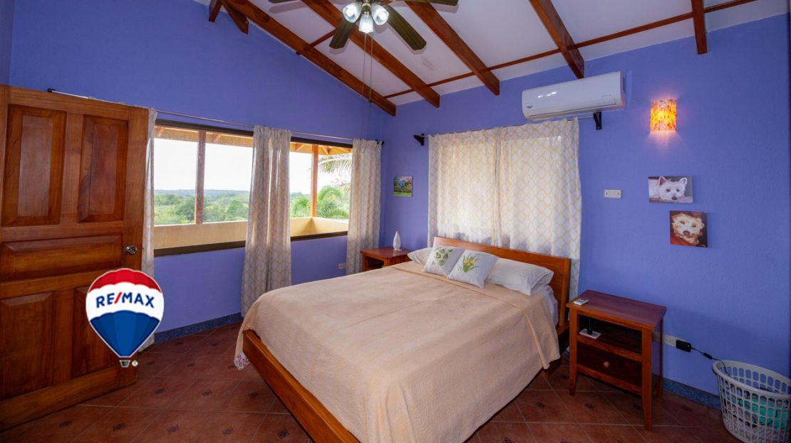 The home is solidly constructed of concrete and reinforced steel and has beautiful tile floors and teak hardwood throughout. There are three bedrooms total (each with its own air conditioning) – two bedrooms upstairs are master suites with ensuite bathrooms with large windows to enjoy the best breezes and views this home has to offer. There is also a covered deck on the second floor that runs the length of the home, perfect for watching the abundant wildlife and birds flying past the panoramic ocean and mountain view!