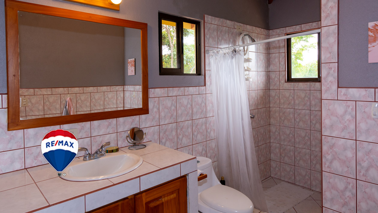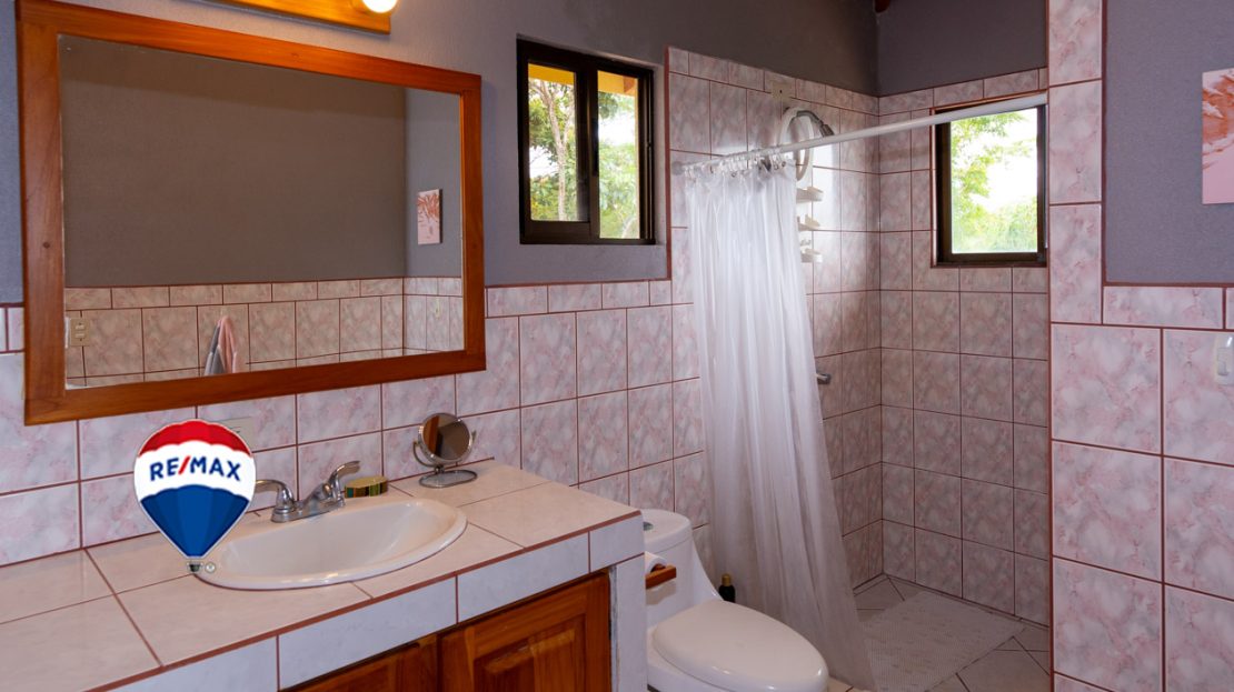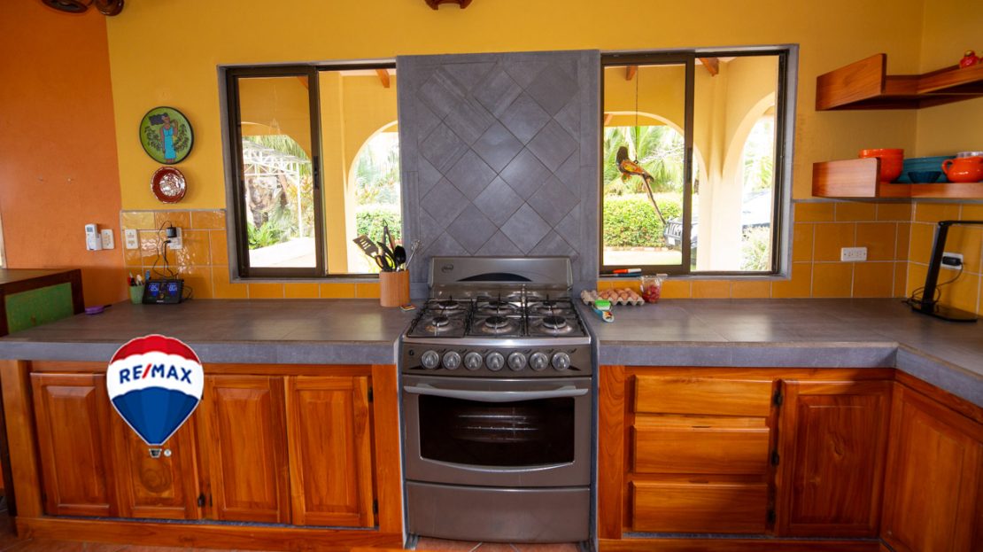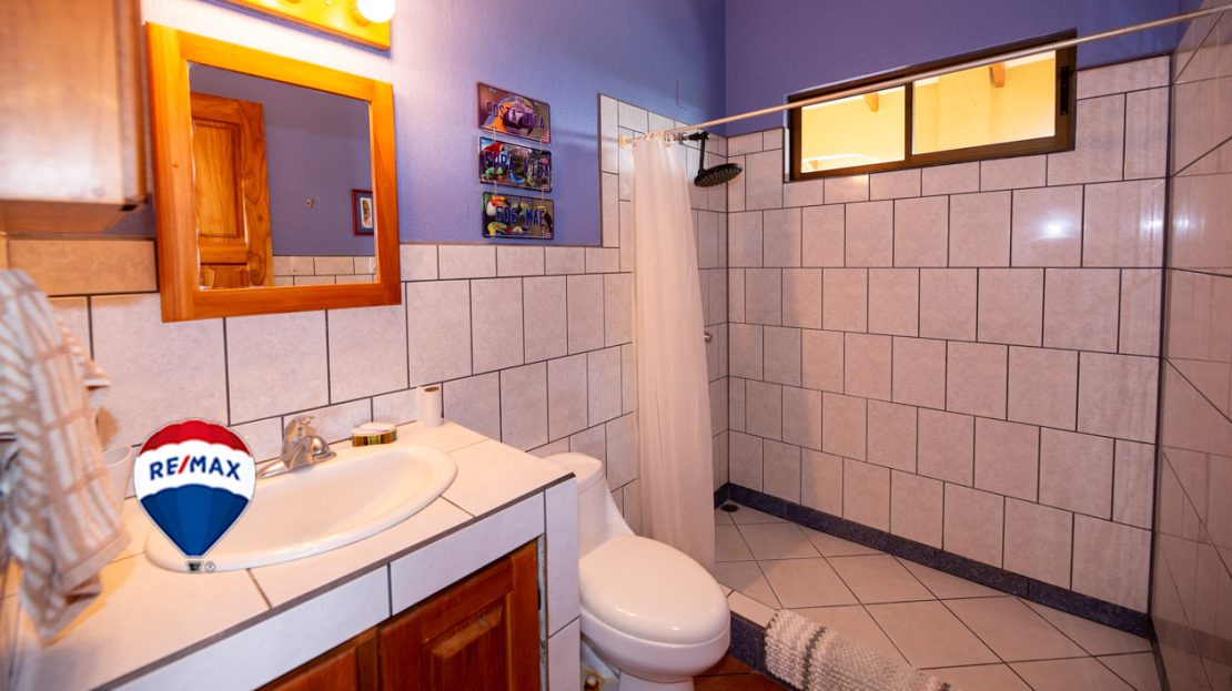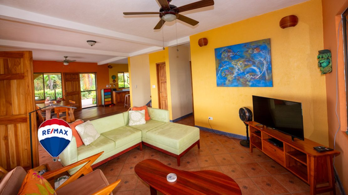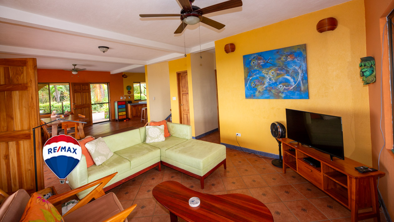The home is solidly constructed of concrete and reinforced steel and has beautiful tile floors and teak hardwood throughout. There are three bedrooms total (each with its own air conditioning) – two bedrooms upstairs are master suites with ensuite bathrooms with large windows to enjoy the best breezes and views this home has to offer. There is also a covered deck on the second floor that runs the length of the home, perfect for watching the abundant wildlife and birds flying past the panoramic ocean and mountain view!