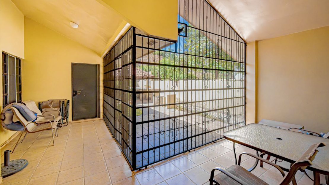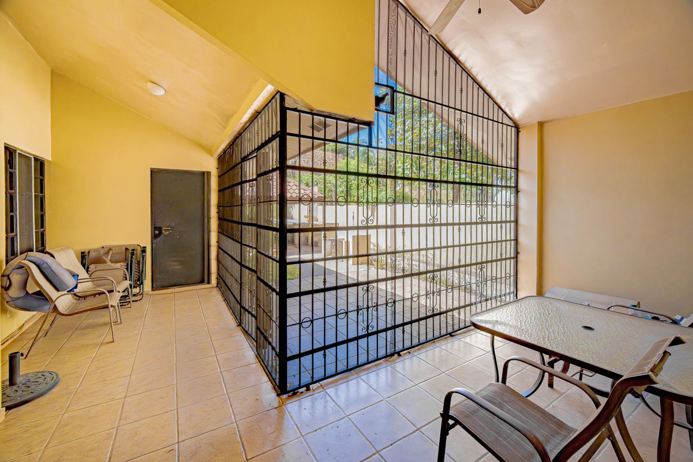 Outdoor living is enhanced by a private in-ground swimming pool and a well-protected setting that provides a high level of privacy despite being in the center of Las Palmas. The home includes security bars on the windows, offering additional peace of mind.