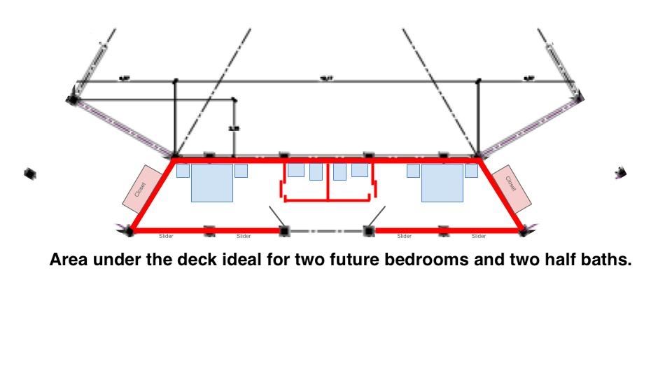 The space under the deck is perfectly suited for two additional bedrooms and two half baths or one full bath. It was designed for a spiral staircase off the back edge of the deck … all that’s needed is to pour the floor and build a couple of walls. This is a fantastic opportunity to customize and expand the home to suit your needs.